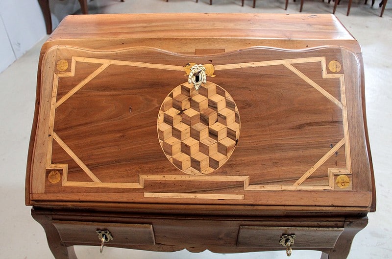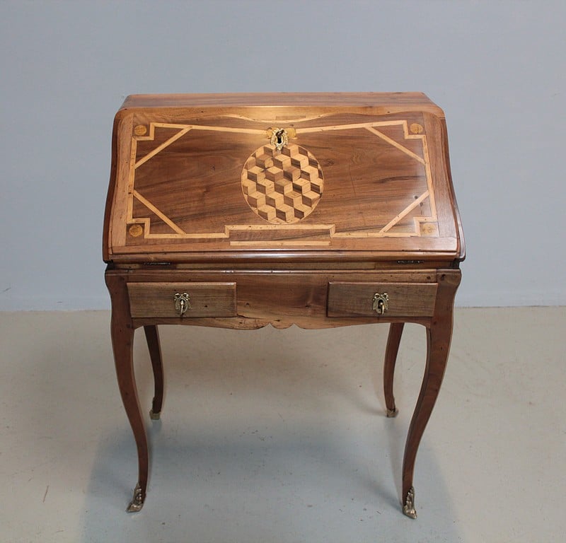 Il ouvre par 2 tiroirs en ceinture et un abattant décoré d’un motif ovale à décor marqueté de cubes et recouvert, à l’intérieur, d’un cuir bordeaux changé.