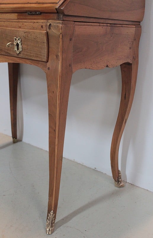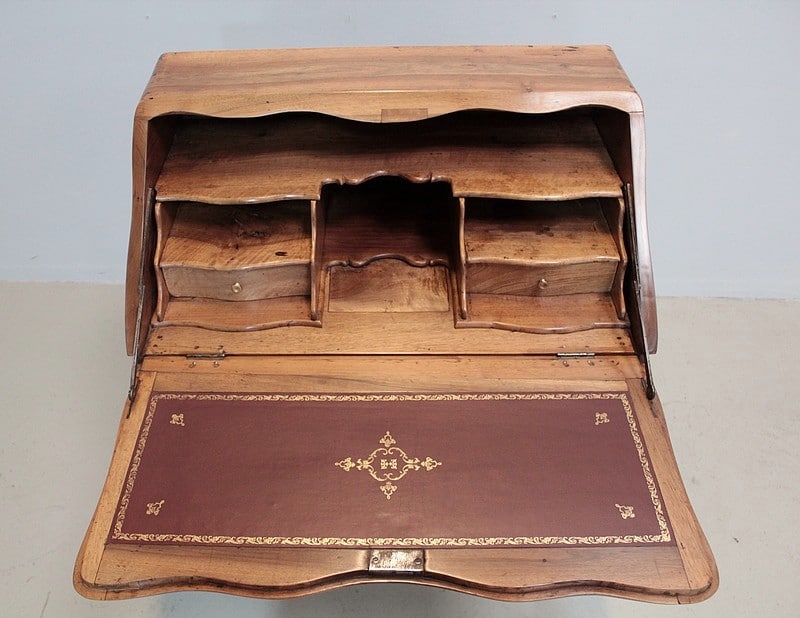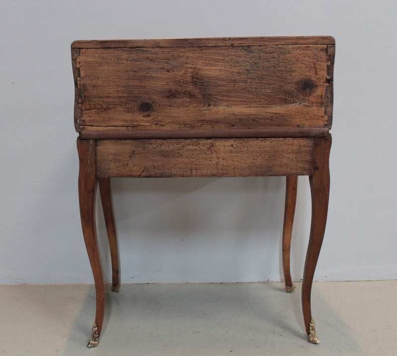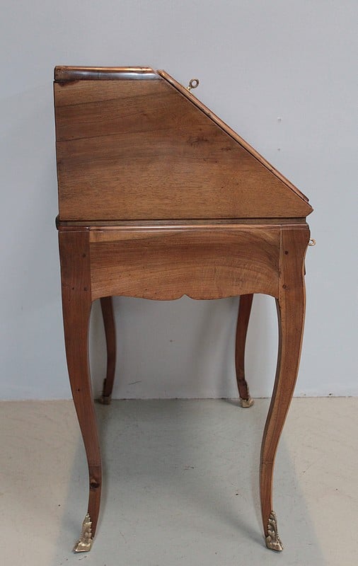 Petit bureau de pente de style Louis XV en noyer blond et marqueterie de buis clair. Ses côtés sont galbés.