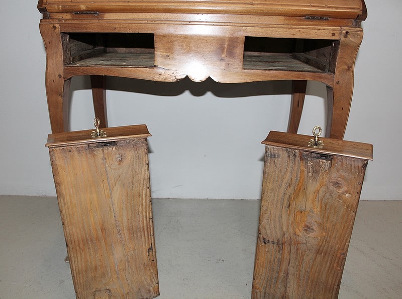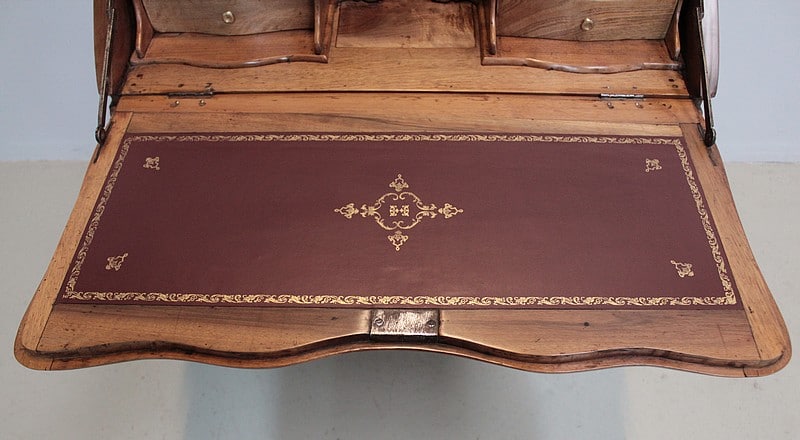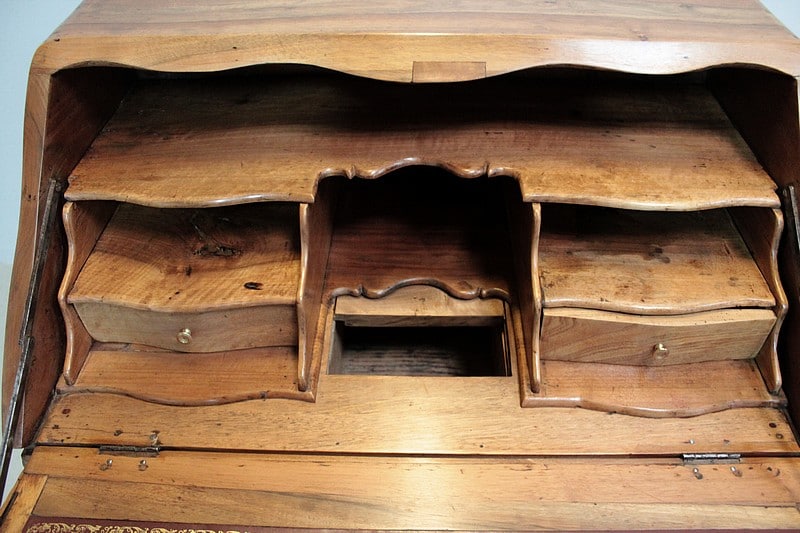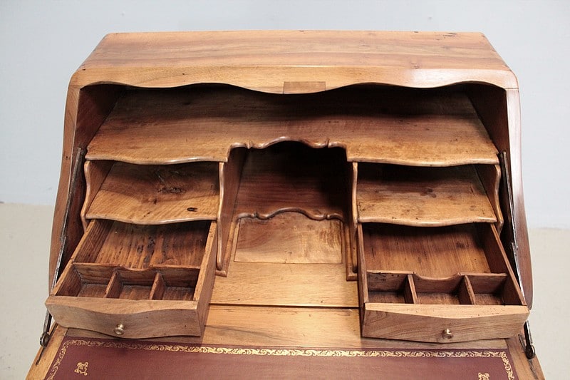 Cet abattant découvre plusieurs casiers, 2 petits tiroirs et une petite trappe coulissante permettant l’accès à un casier secret.