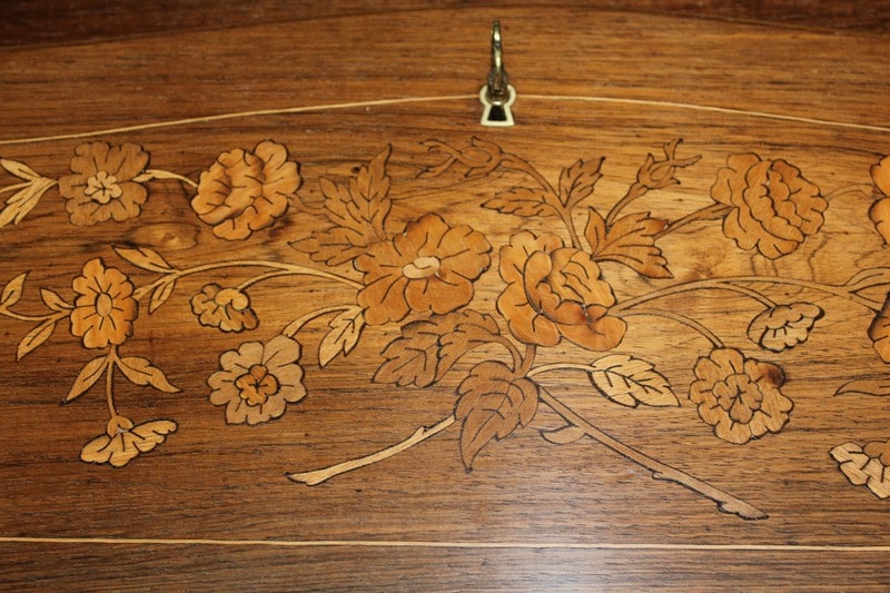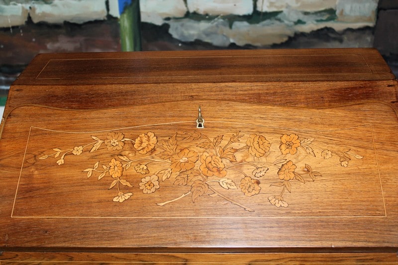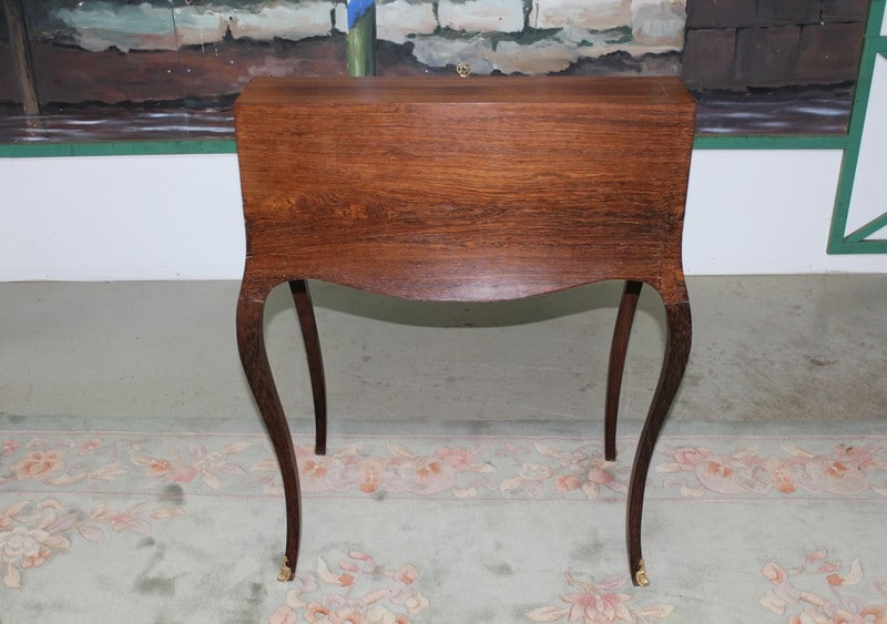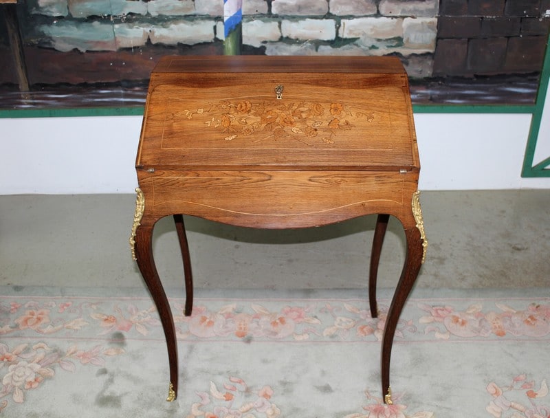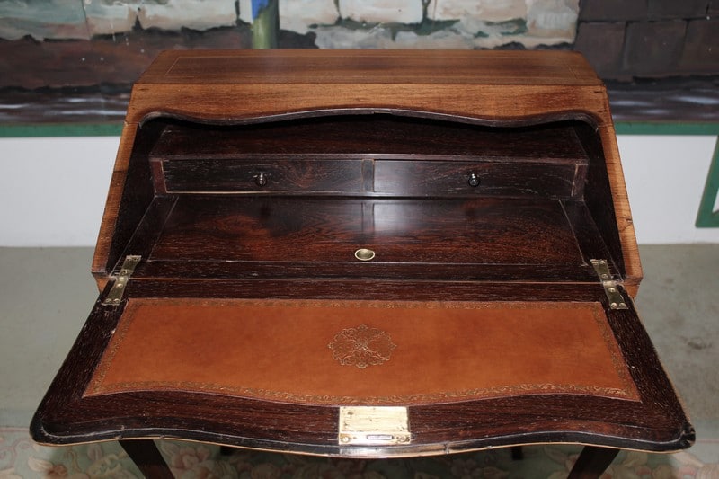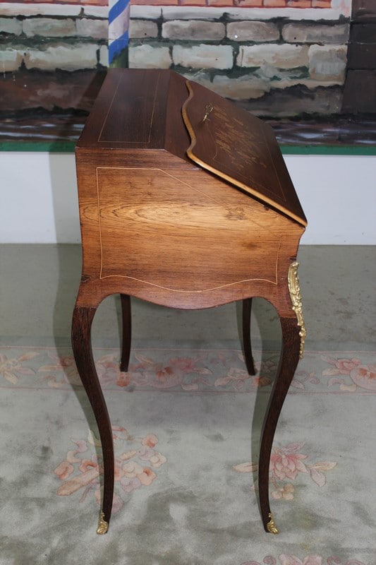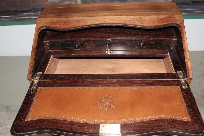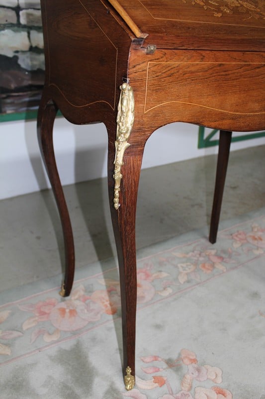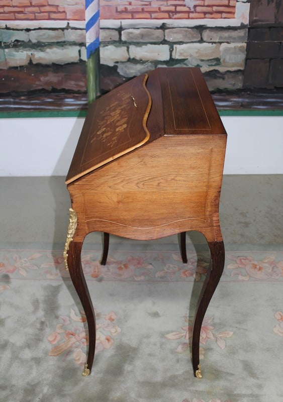 Petit bureau de pente de style Louis XV en palissandre blond avec filets de citronnier reposant sur 4 pieds galbés ornés de bronzes. L’abattant est décoré d’une marqueterie de fleurs , ouvert il découvre un titroir fermant par une planche coulissante et deux petits tiroirs. Son dessus est recouvert d’un cuir marron qui a été changé. Sa hauteur est à 75cm du sol.