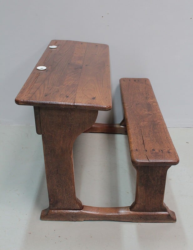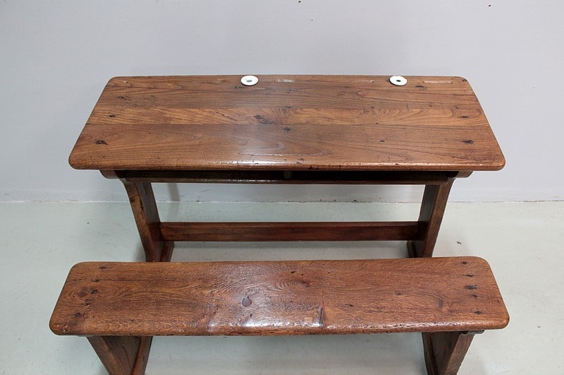Bureau pupitre double d’écolier en chêne avec son banc.