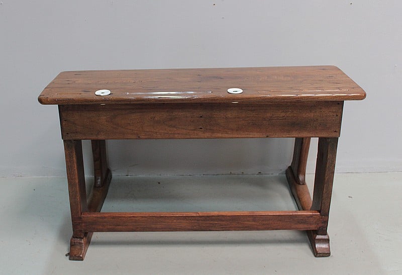 Le dessus est garni de 2 encriers en porcelaine blanche (1 ébréché) et 2 emplacements ‘porte-plume’. Casiers en dessous.