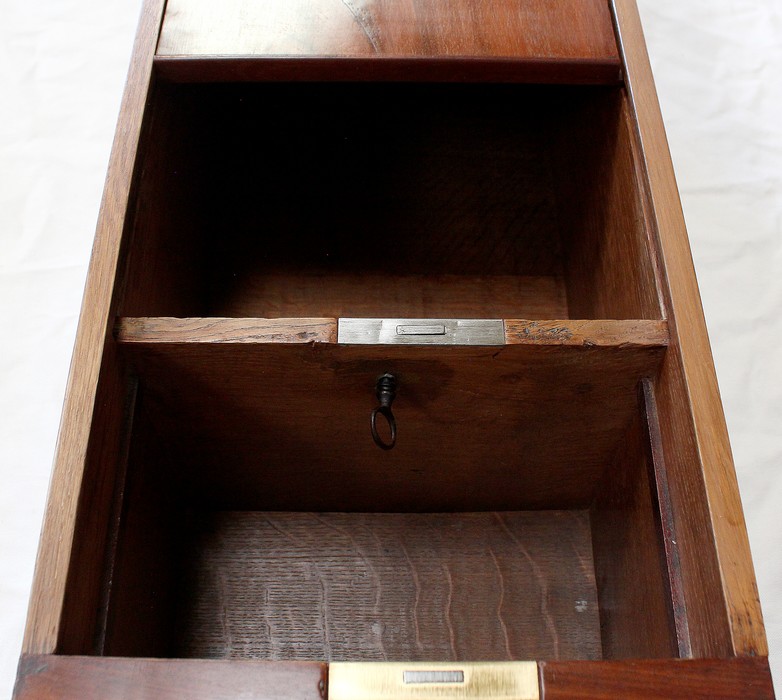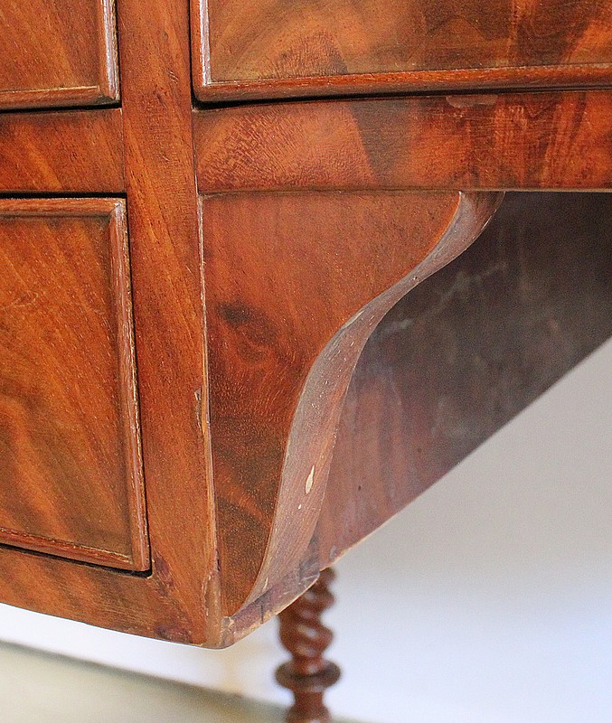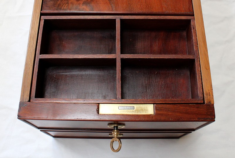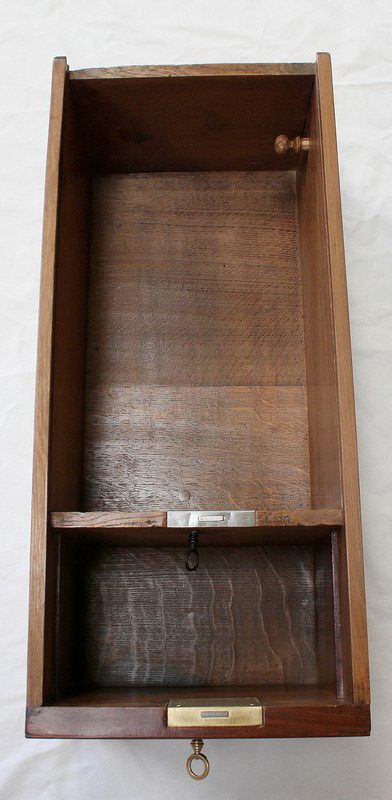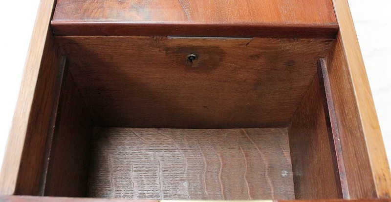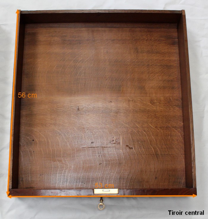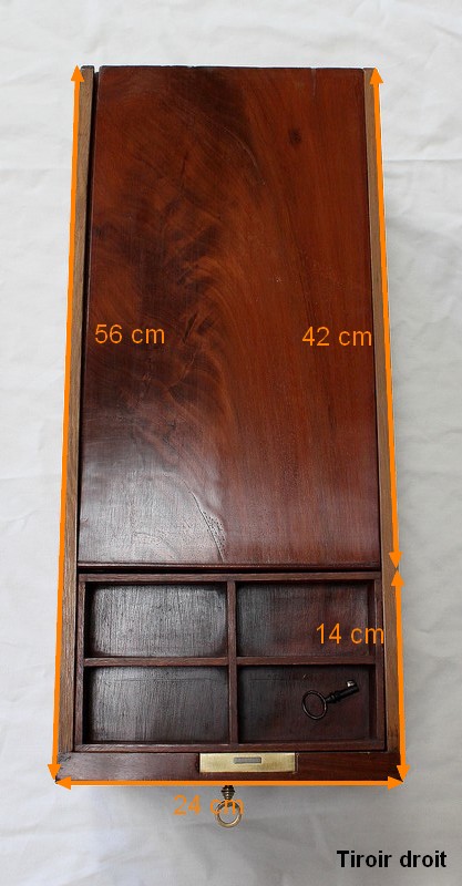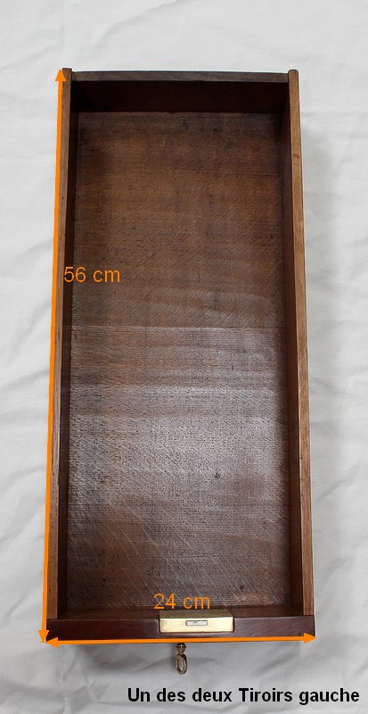 En Façade, on trouve plusieurs Tiroirs soulignés par de petites baguettes, deux tiroirs indépendants à gauche, un plus large au centre, et un double à droite. L’Intérieur de ce dernier est composé d’un casier à monnaie à quatre compartiments. En retirant ce casier, une cache avec couvercle est dévoilée, fermée à clef : le dessus se coulisse une fois ouvert, laissant place à un espace de rangement intéressant.