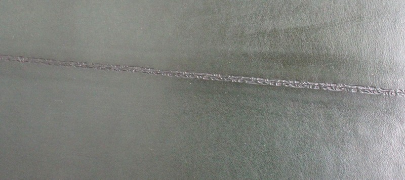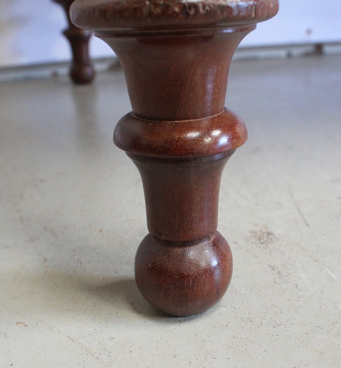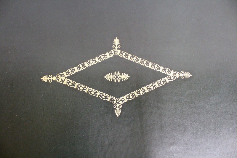 Le Dessus propose un Cuir de couleur Vert Foncé en trois éléments, décoré au centre d’un Motif doré, ainsi que de Vignettes Dorées et de Vignettes à Froid dans son Pourtour. Ce Cuir est encadré par un placage symétrique de Ronce d’Acajou, dont la Bordure est à double Moulure.