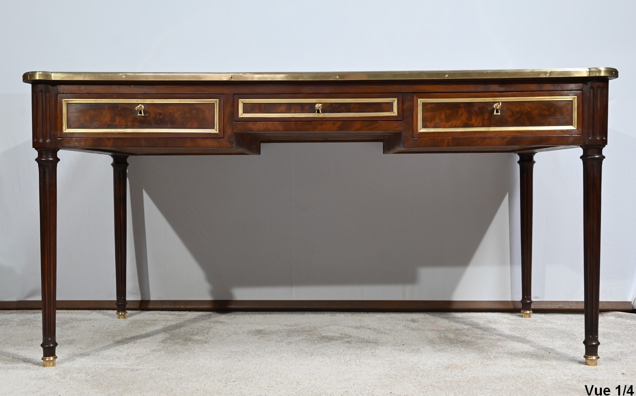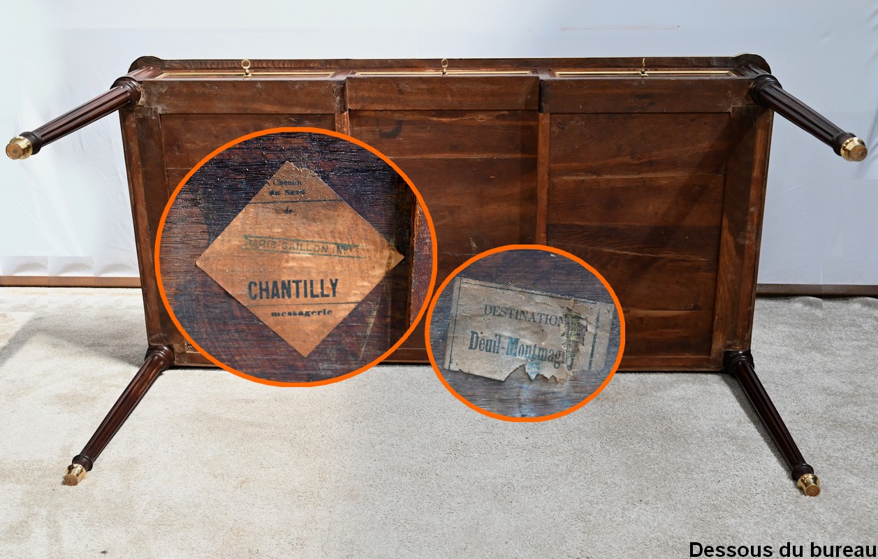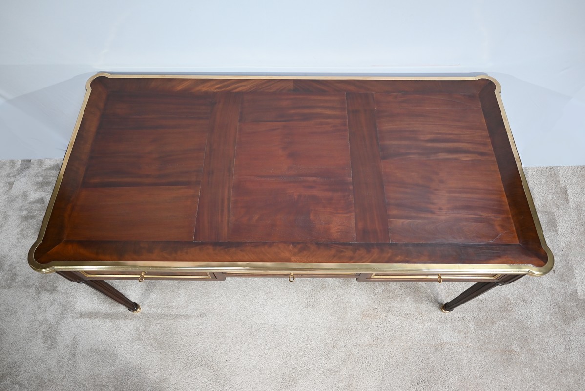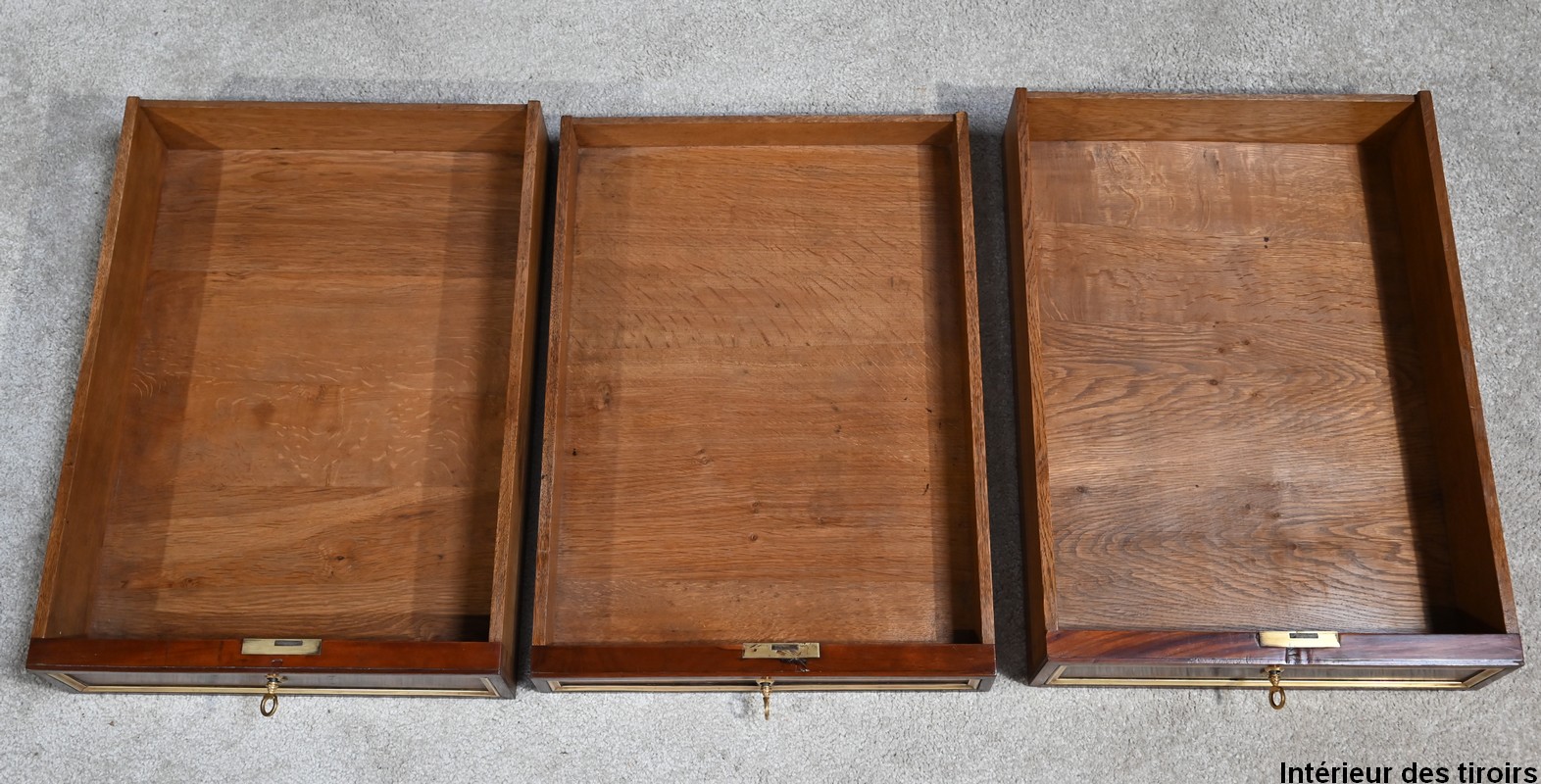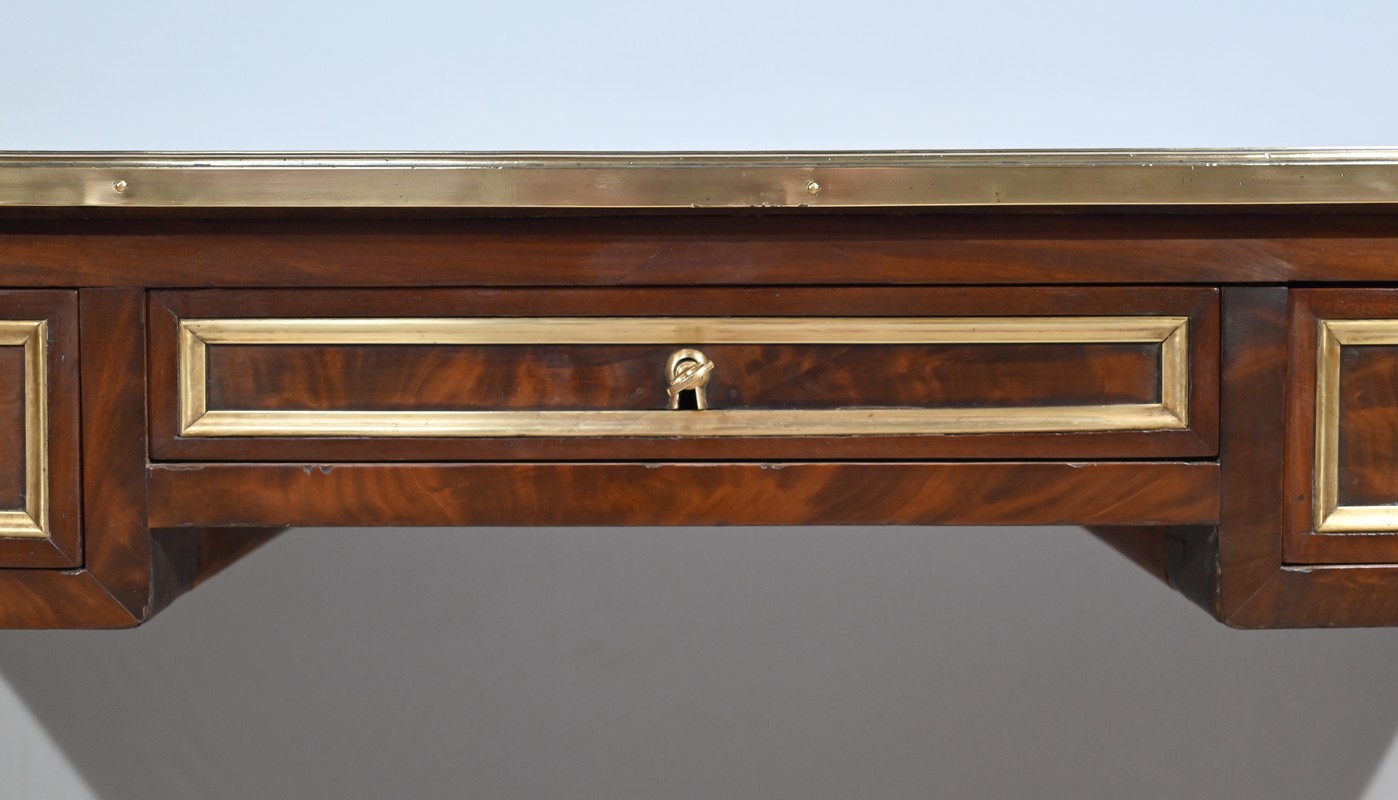 Ce bureau plat de milieu, en acajou massif et plaqué, ouvre par deux tiroirs latéraux de mêmes dimensions et un central moins haut dû au léger décrochement du passage de jambes.