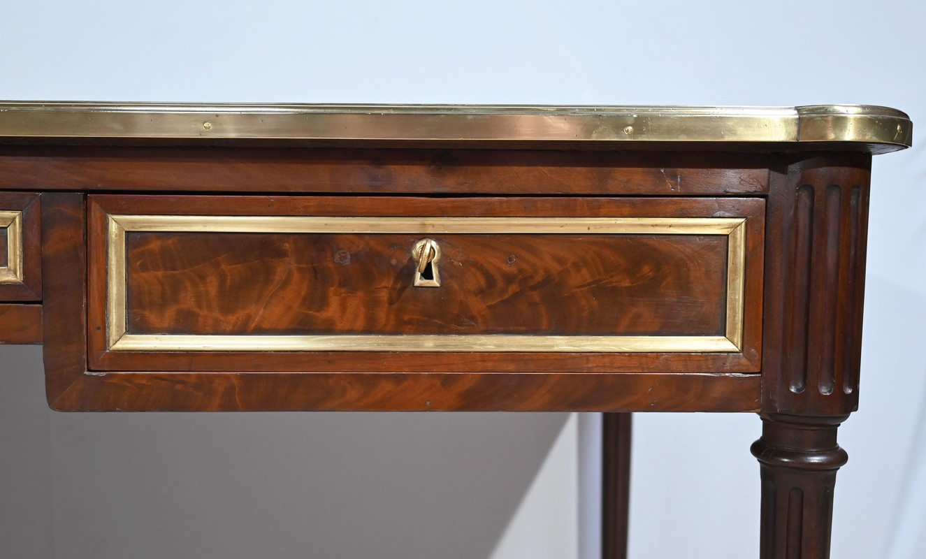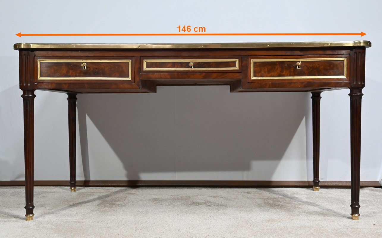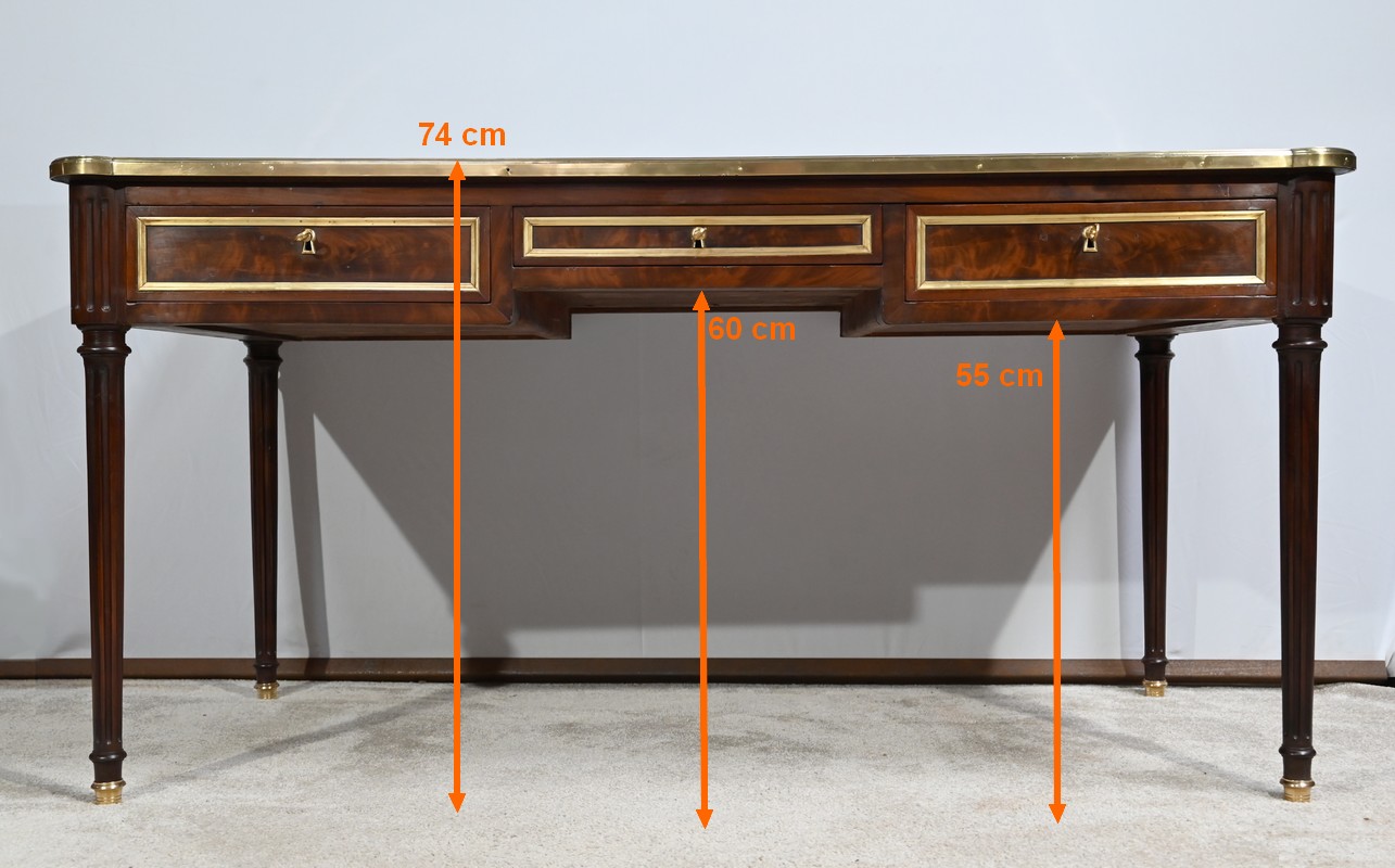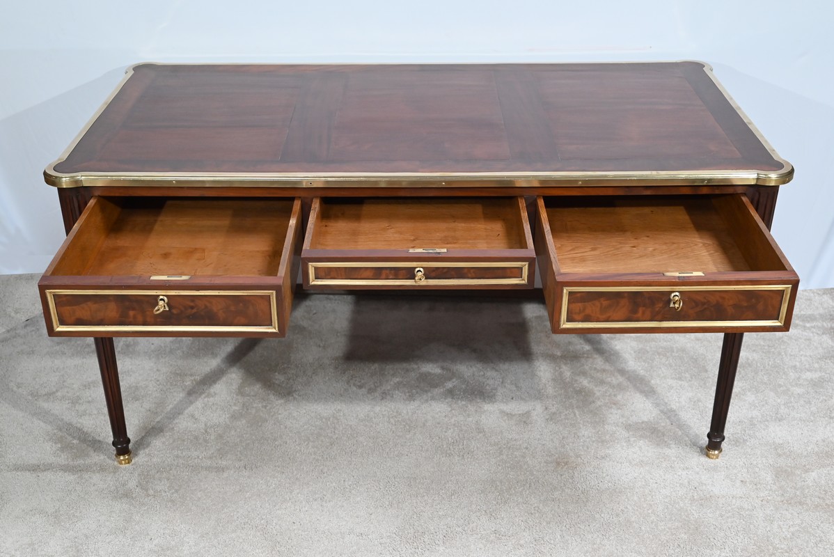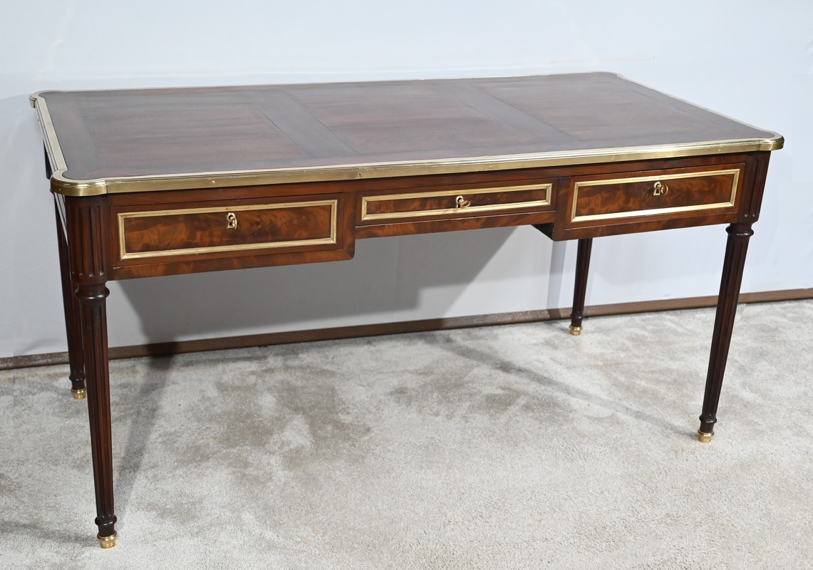 Ce bureau plat de milieu, en acajou massif et plaqué, ouvre par deux tiroirs latéraux de mêmes dimensions et un central moins haut dû au léger décrochement du passage de jambes.