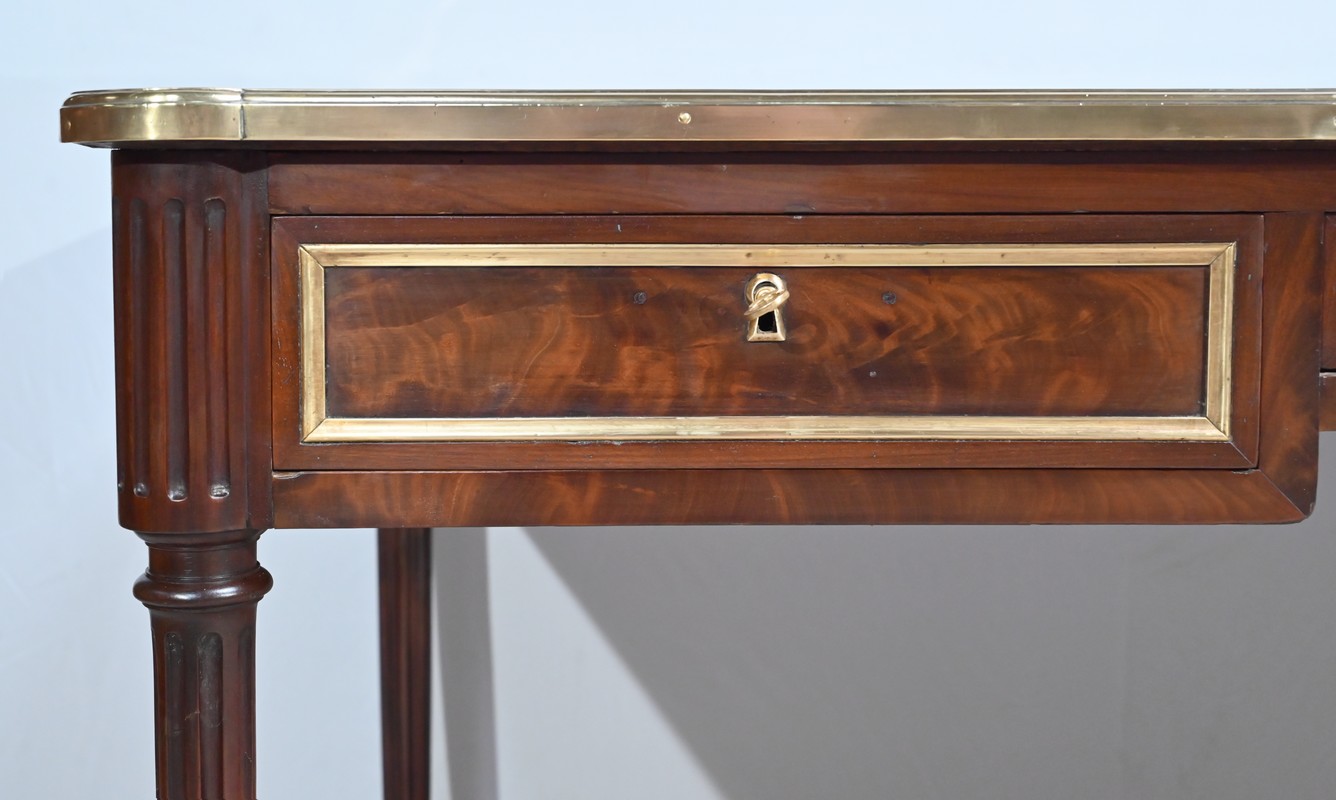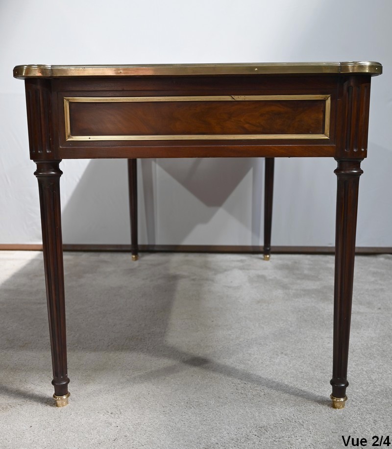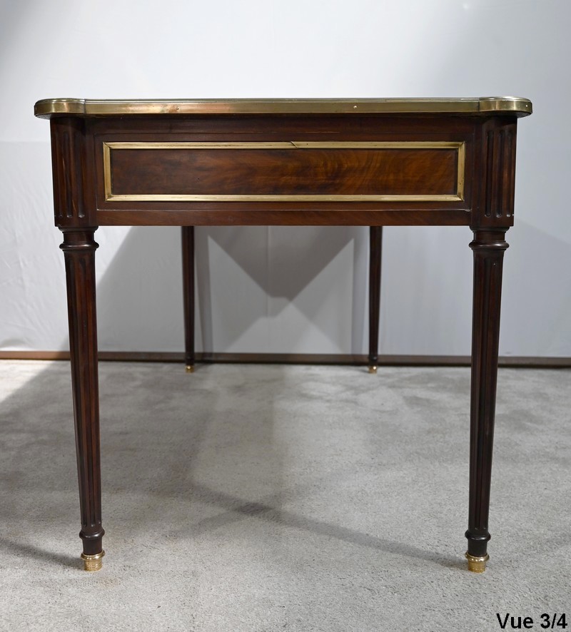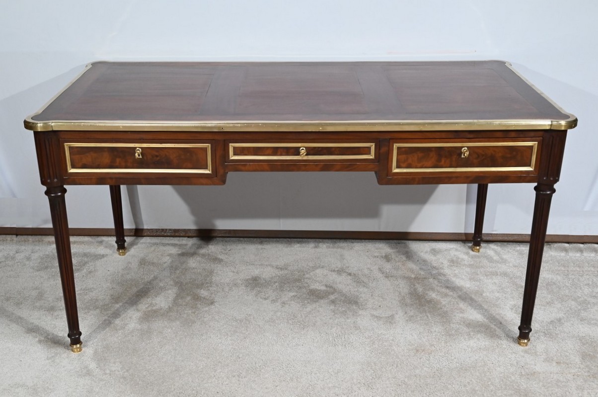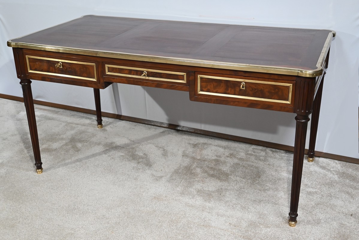 Ce bureau plat de milieu, en acajou massif et plaqué, ouvre par deux tiroirs latéraux de mêmes dimensions et un central moins haut dû au léger décrochement du passage de jambes.