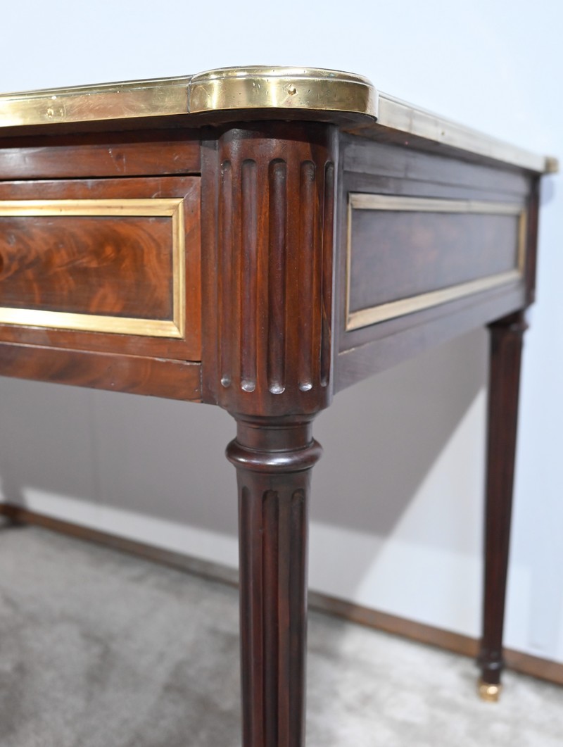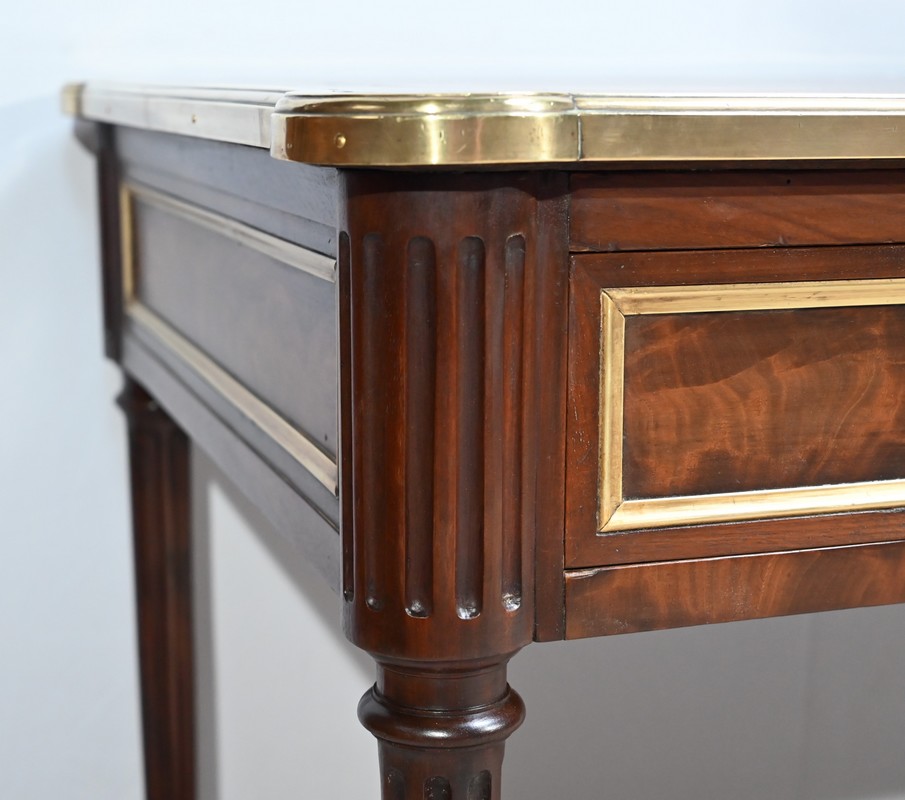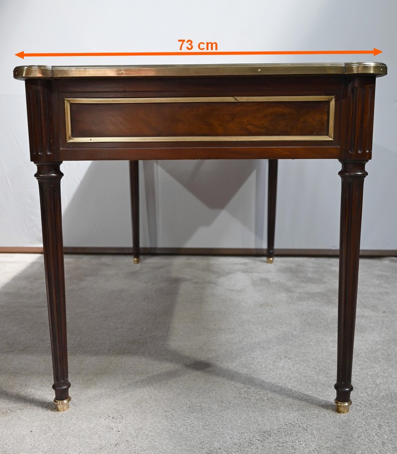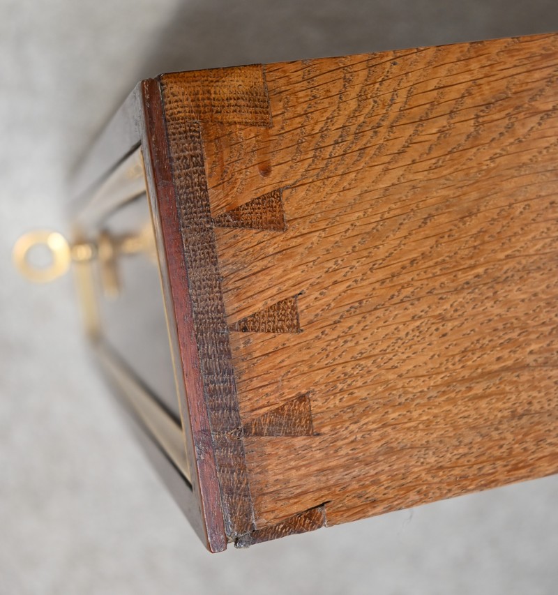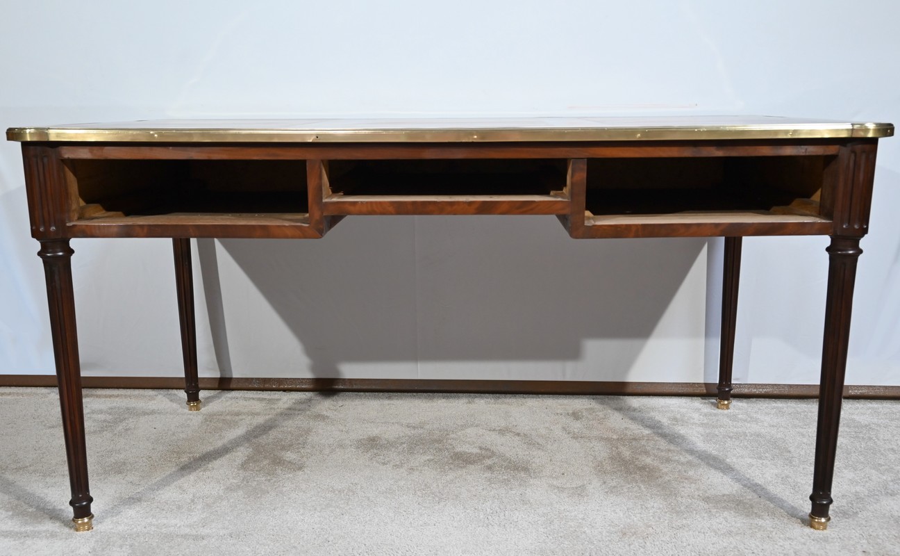 Le plateau est composé d’un cadre à coupe d’onglet, de deux traverses et trois panneaux identiques. Son pourtour est habillé d’un élément en laiton, recouvrant le chant et le dessus, comportant sur l’arête un quart de rond avec deux carrés fins.