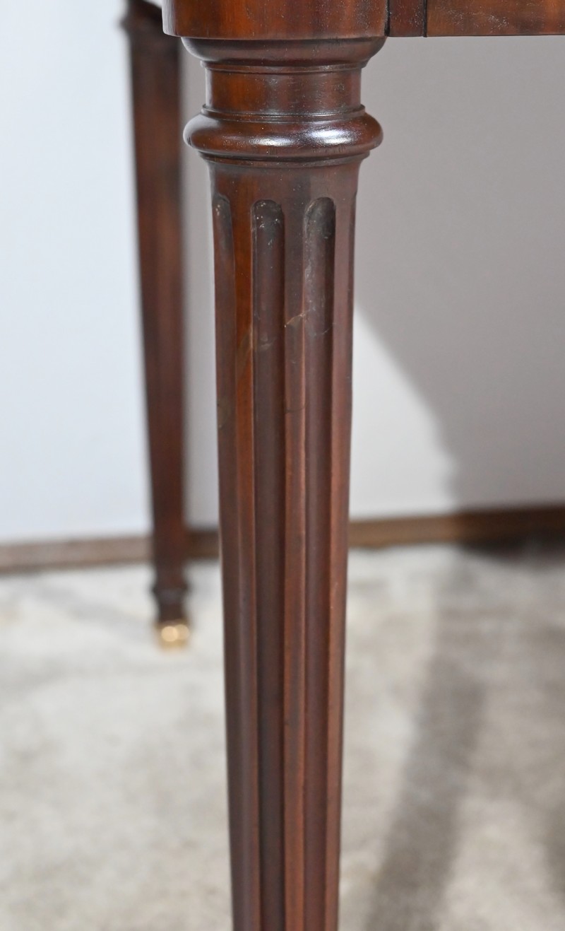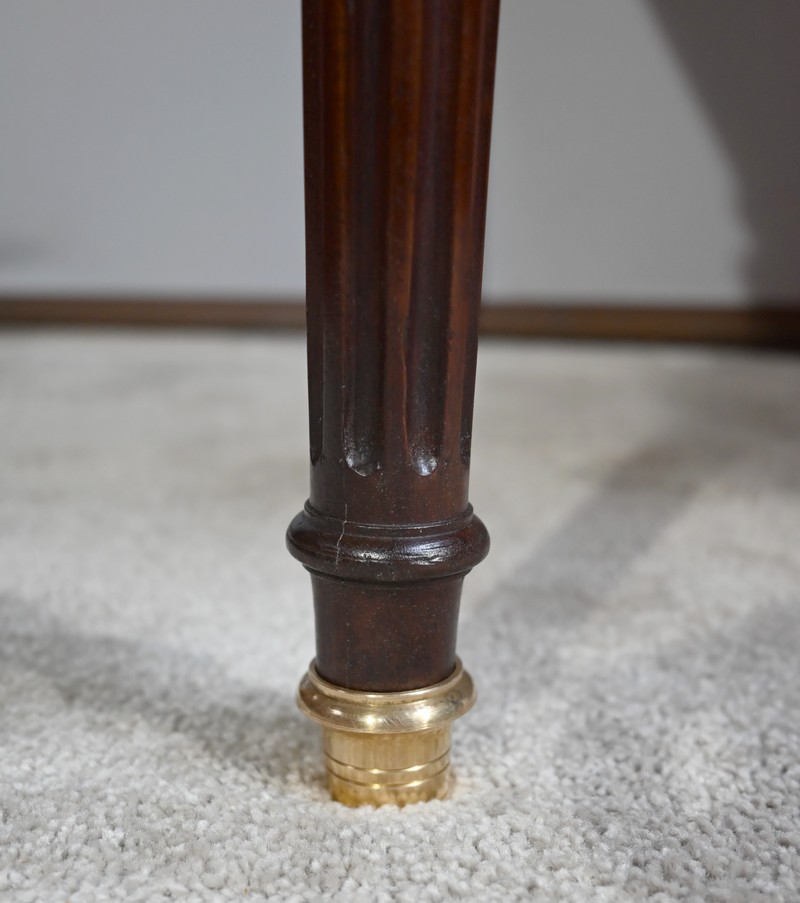 Ces éléments reposent sur quatre pieds cannelés à ressaut avec bagues et fuseaux rudentés se terminant par des sabots laiton.