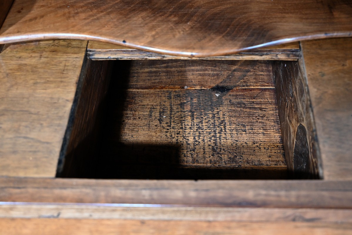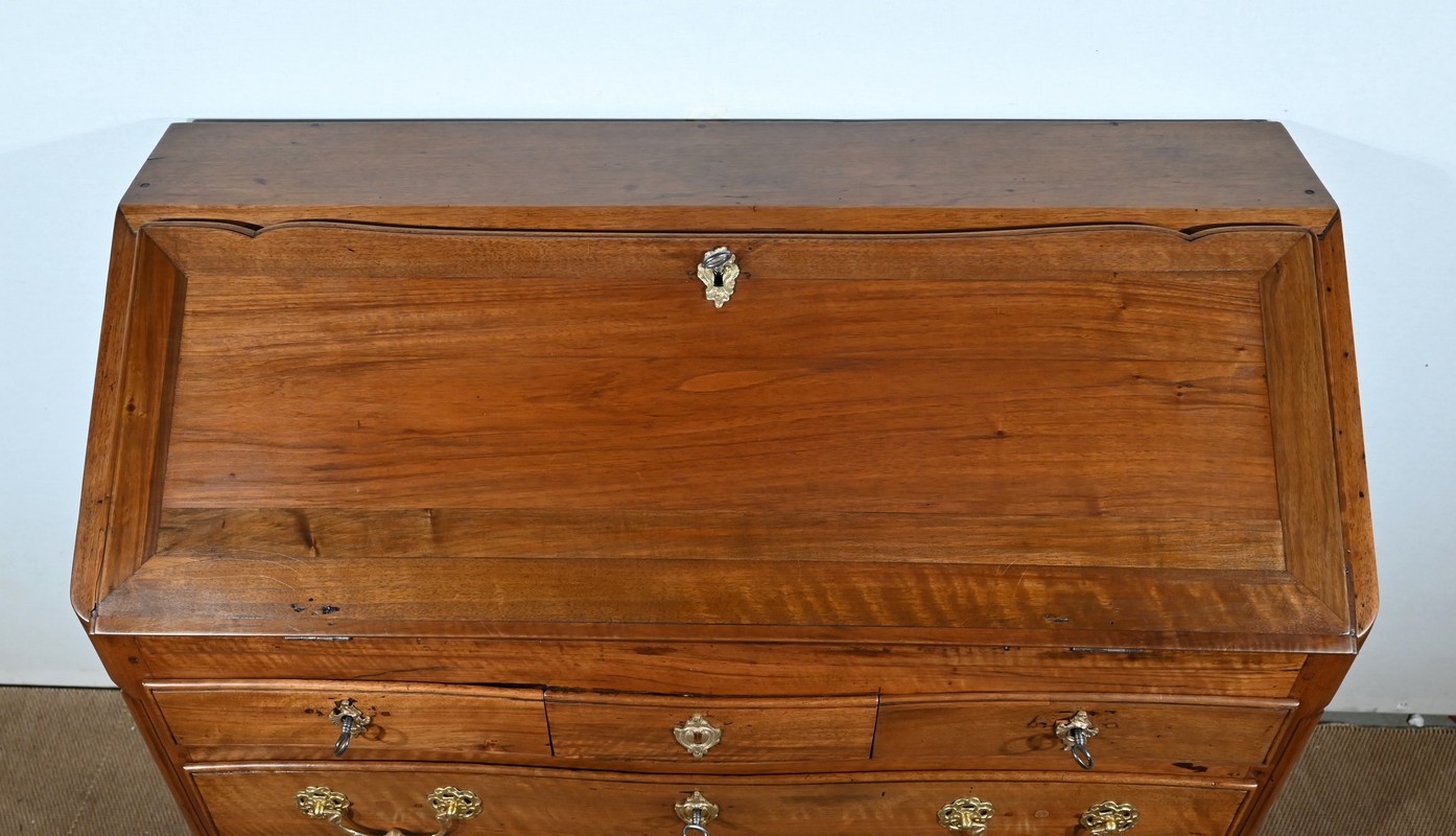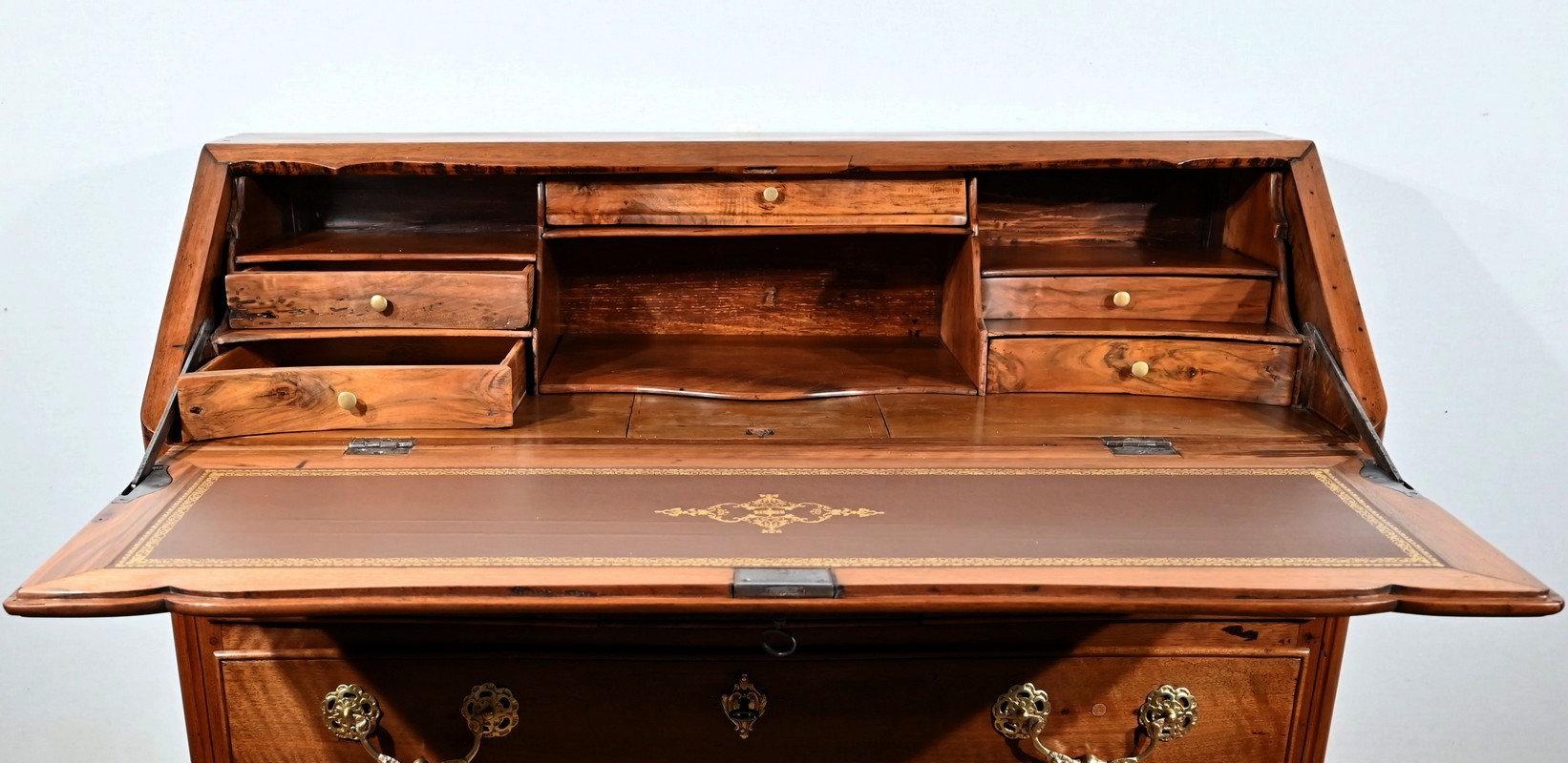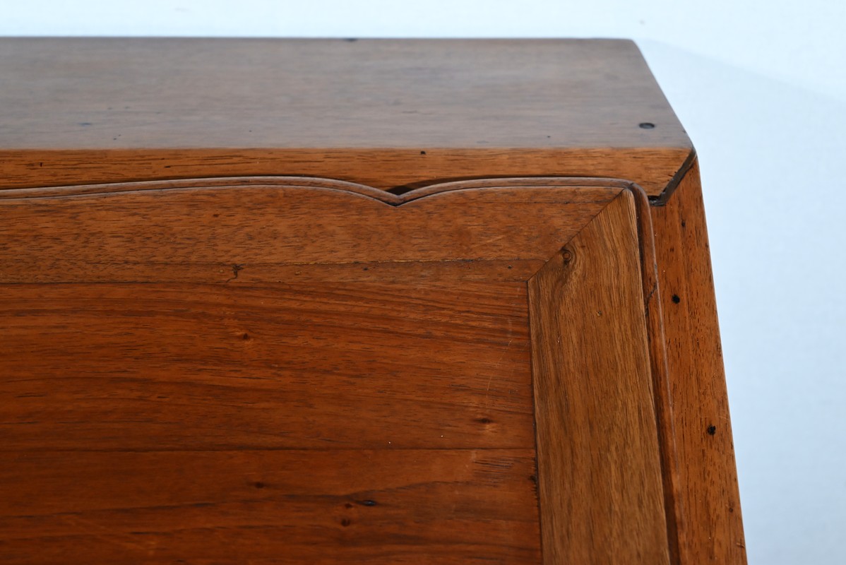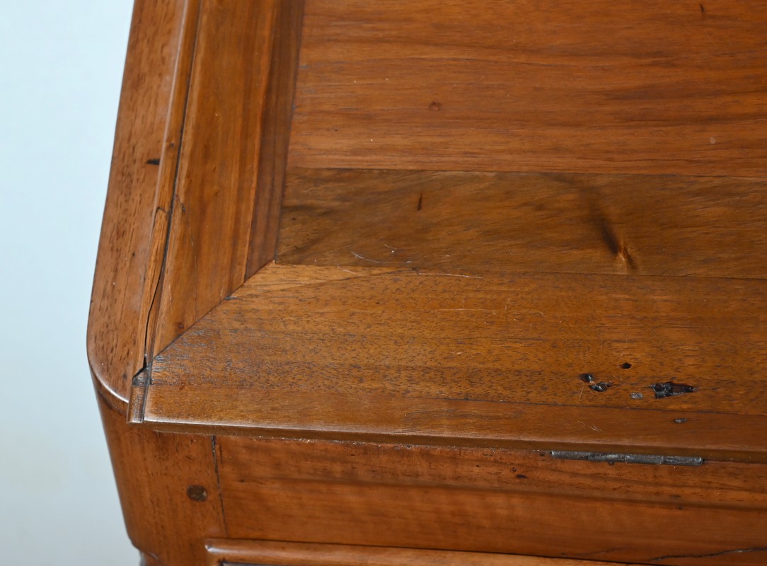 L’abattant en pente, à recouvrement, présente un encadrement à coupe d’onglet et en demi-rond. On notera que les parties de bois sont bien jointives et exemptes d’éléments ne correspondant pas à l’époque de ce meuble (composite ou autres). Cet abattant est fixé sur deux charnières d’origine en fer et est maintenu en position horizontale par deux crochets. L’espace de travail est foncé d’un cuir de vachette vert doux agrémenté d’une vignette dorée à volutes et d’un motif central. L’intérieur propose également une niche centrale, deux tiroirs concaves à gradins et un tiroir légèrement en forme à gorge. Ces derniers s’ouvrent par des boutons laiton. La réserve (ou faux tiroir) est dissimulée par une plaque coulissante.