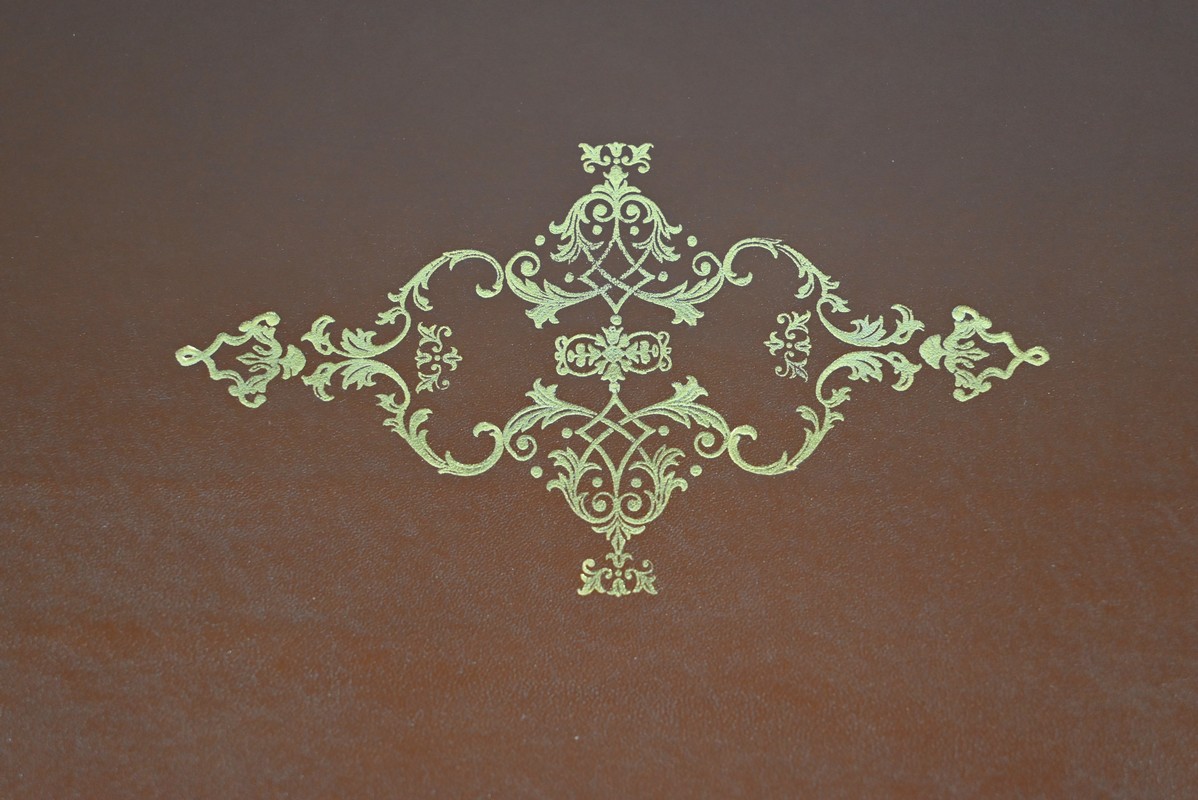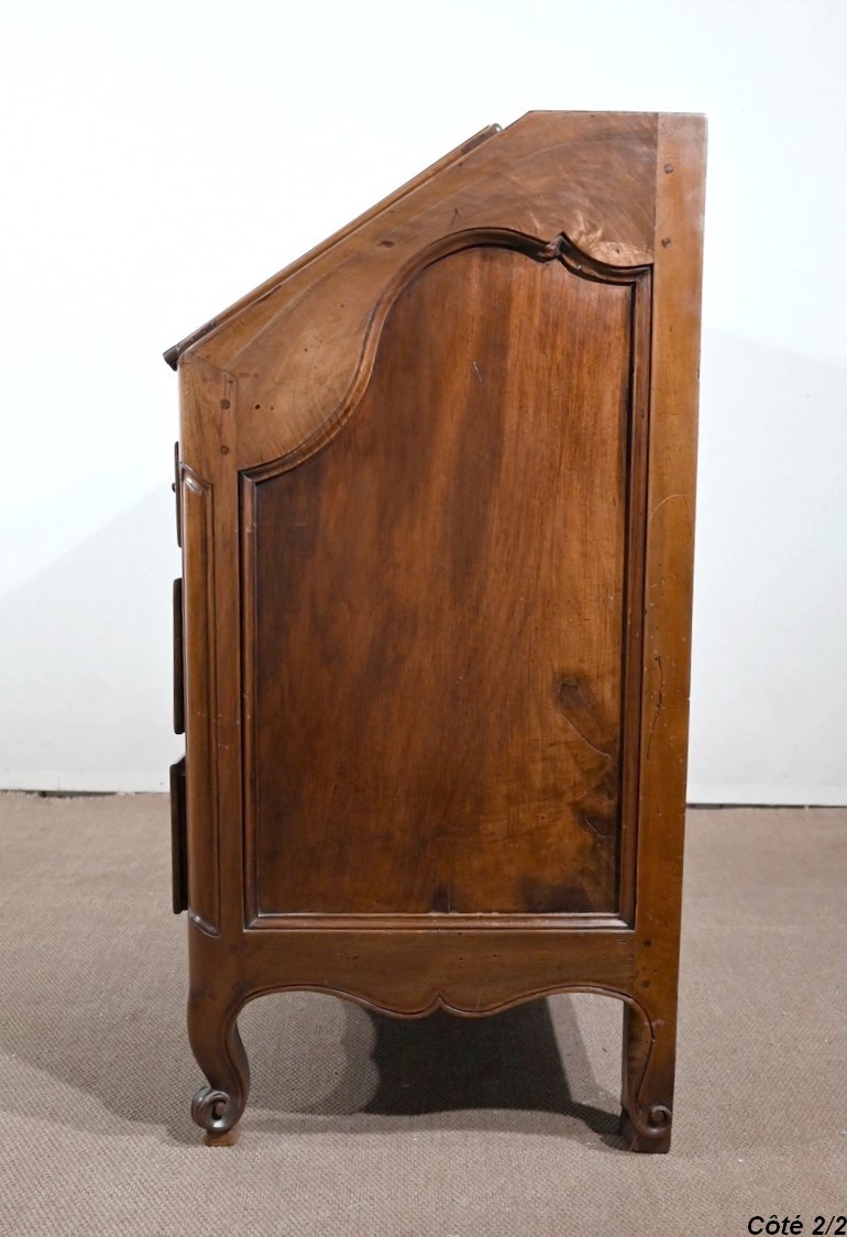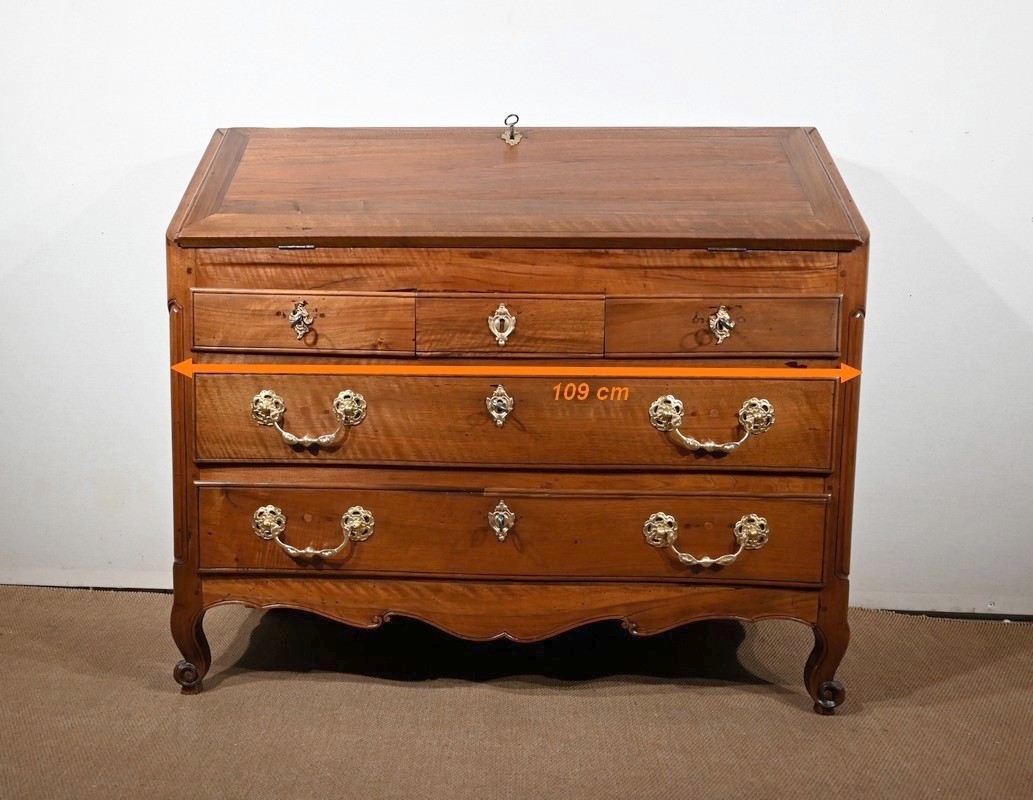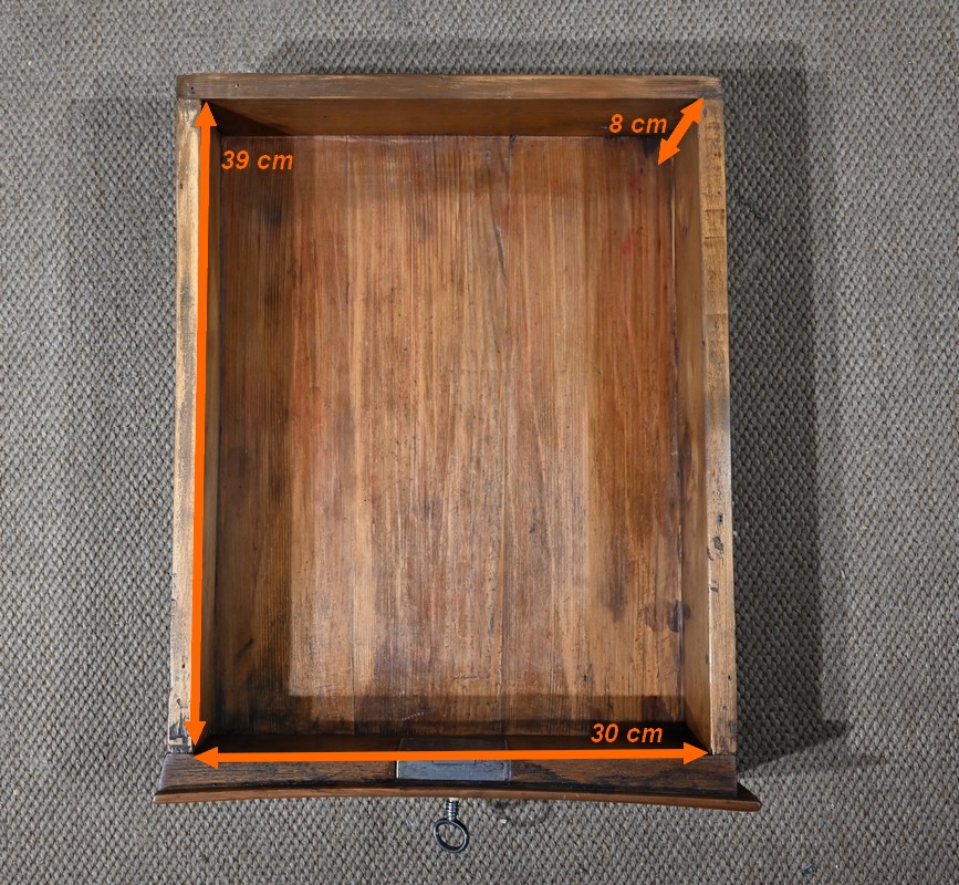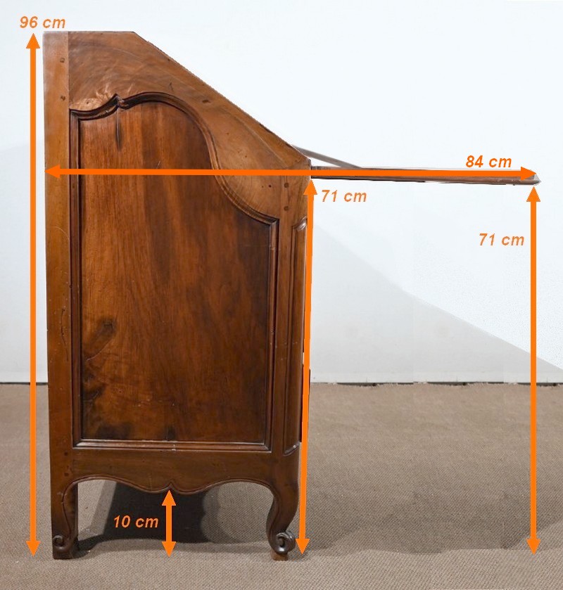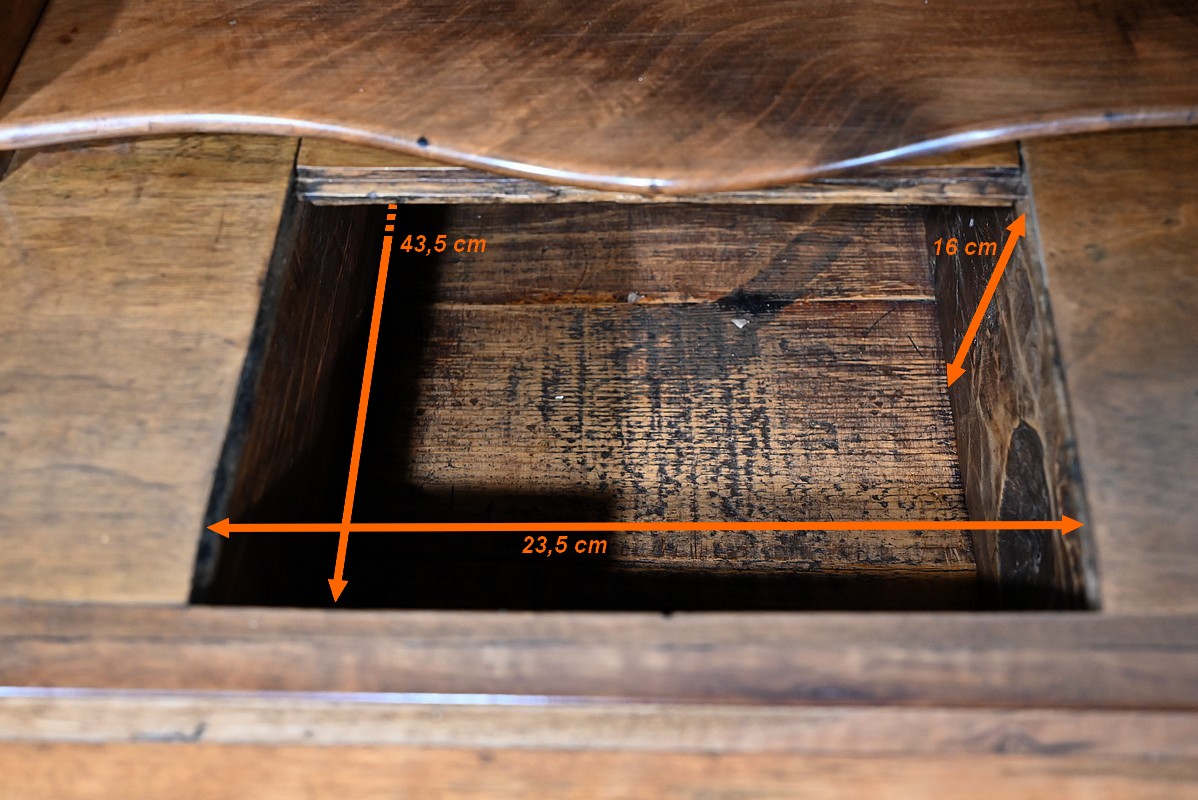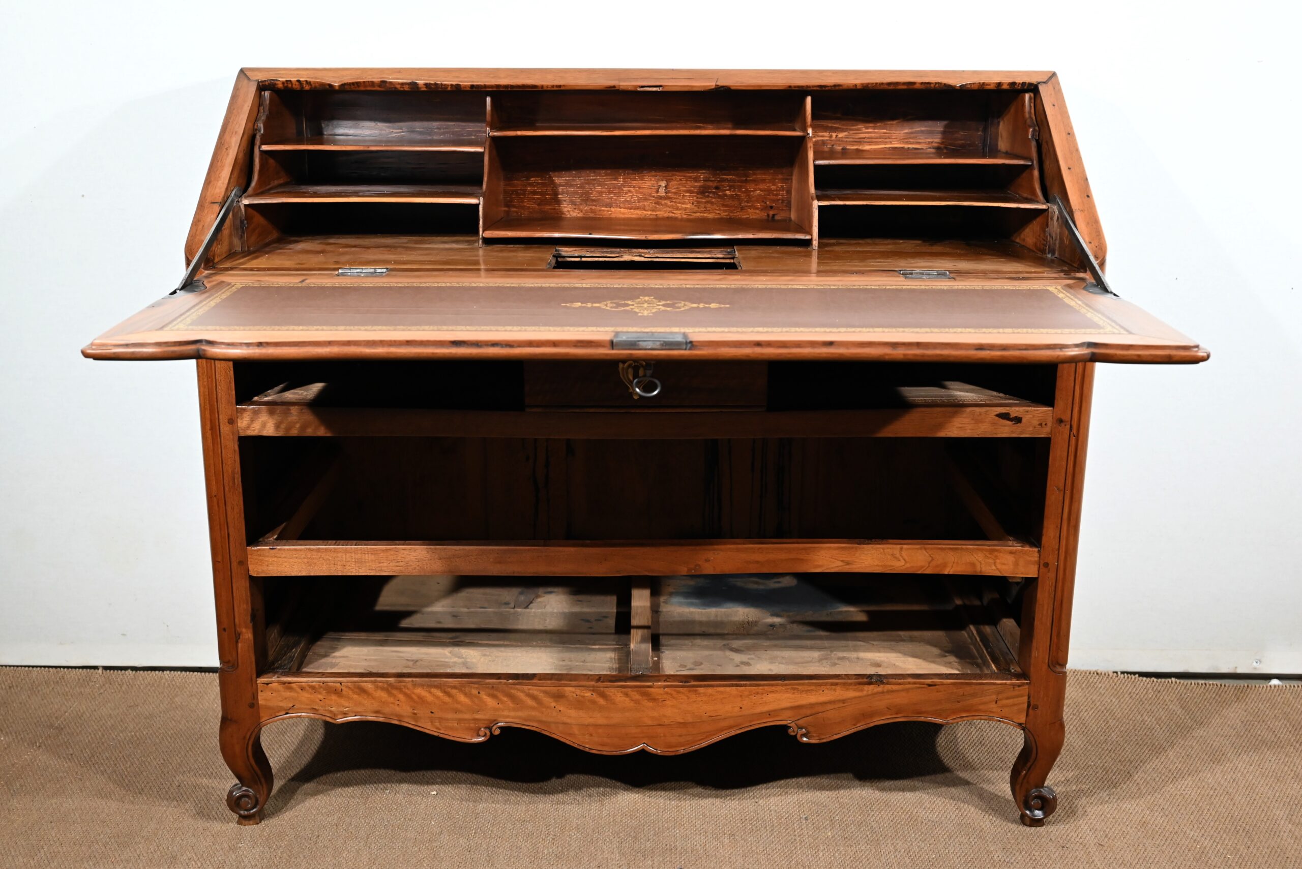 L’abattant en pente, à recouvrement, présente un encadrement à coupe d’onglet et en demi-rond. On notera que les parties de bois sont bien jointives et exemptes d’éléments ne correspondant pas à l’époque de ce meuble (composite ou autres). Cet abattant est fixé sur deux charnières d’origine en fer et est maintenu en position horizontale par deux crochets. L’espace de travail est foncé d’un cuir de vachette vert doux agrémenté d’une vignette dorée à volutes et d’un motif central. L’intérieur propose également une niche centrale, deux tiroirs concaves à gradins et un tiroir légèrement en forme à gorge. Ces derniers s’ouvrent par des boutons laiton. La réserve (ou faux tiroir) est dissimulée par une plaque coulissante.