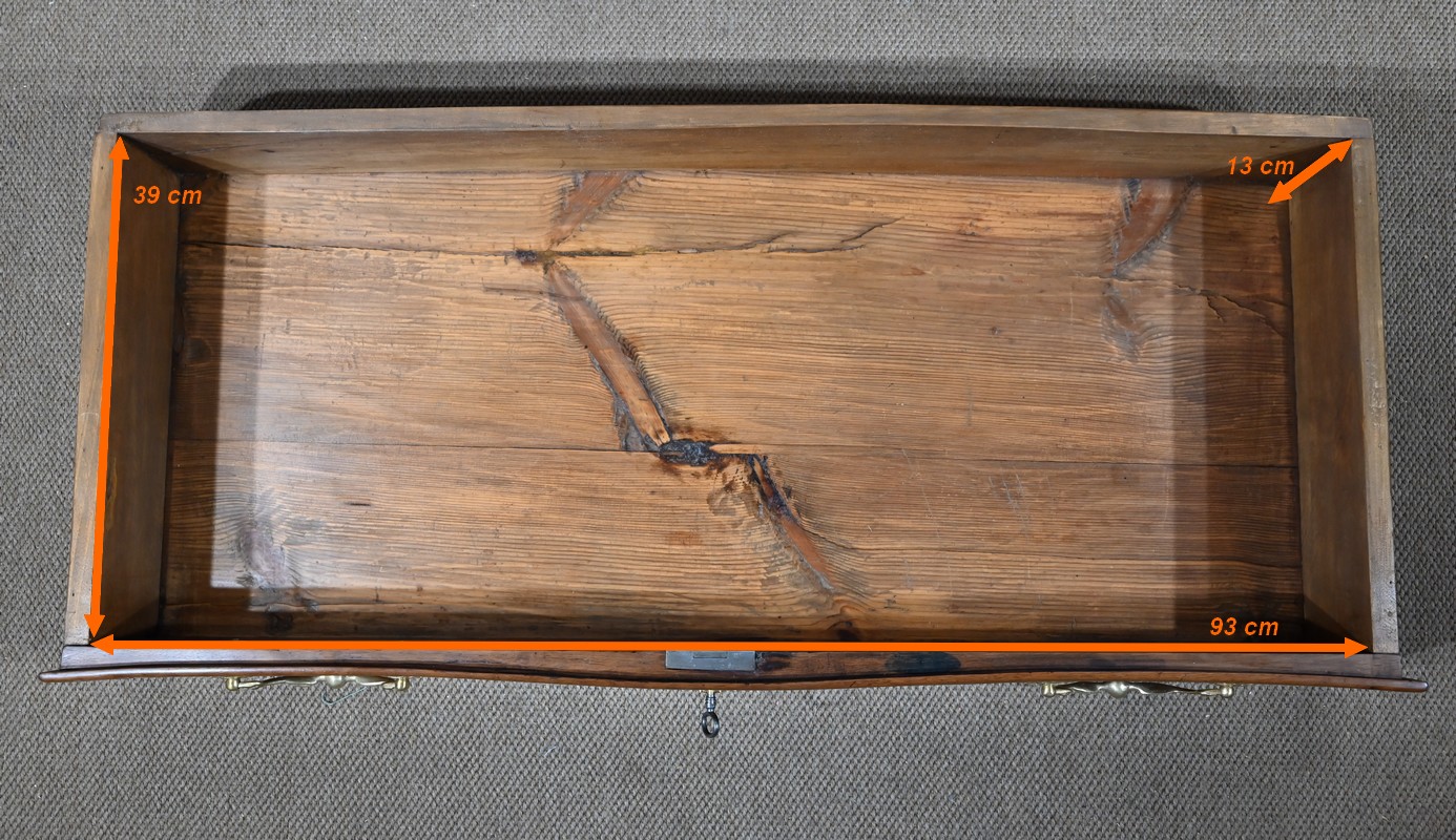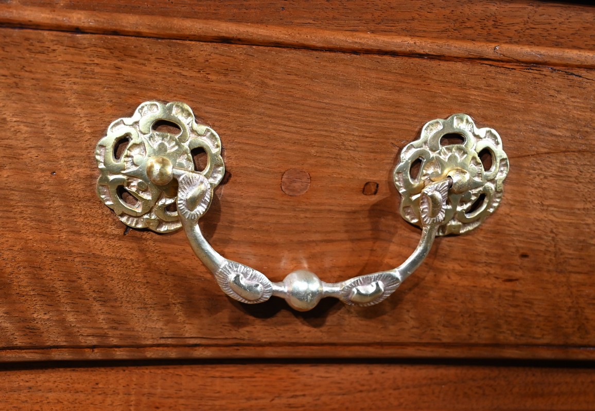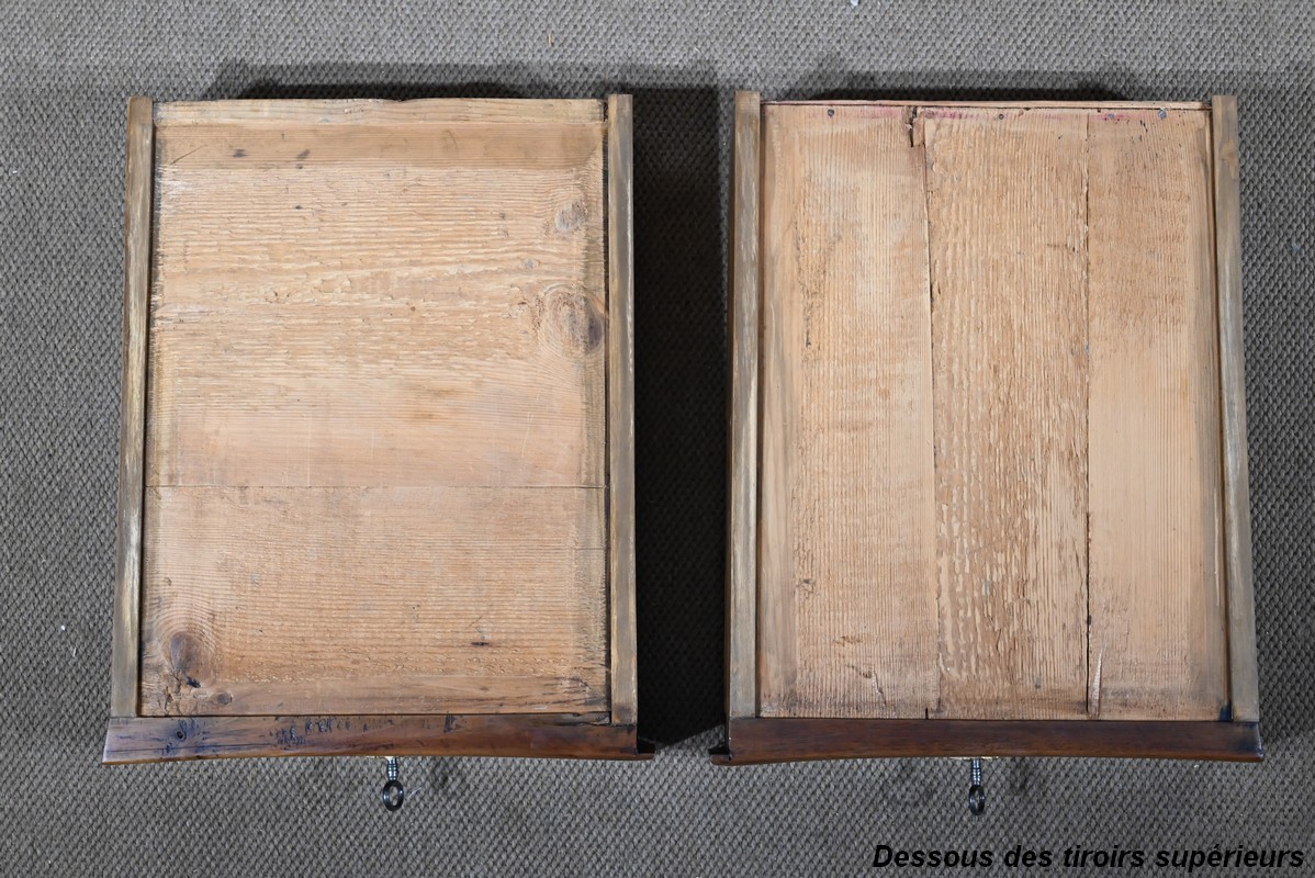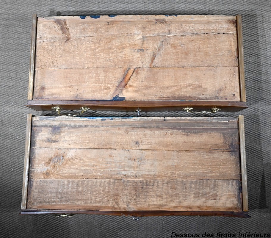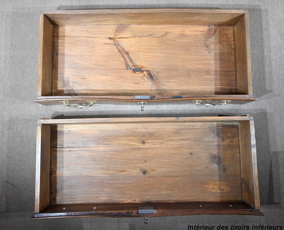 Elle ouvre par deux larges tiroirs identiques, en applique sur le corps, aux pourtours légèrement façonnés en demi-jonc. Ils sont surplombés de deux tiroirs plus petits. Ils sont équipés de serrures fer fonctionnelles, d’entrées bronze authentiques, de clés postérieures et de poignées tombantes à deux attaches avec rosaces ajourées et ciselées. Dans la partie centrale on trouve également un faux tiroir avec entrée bronze.