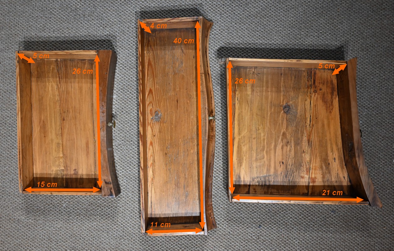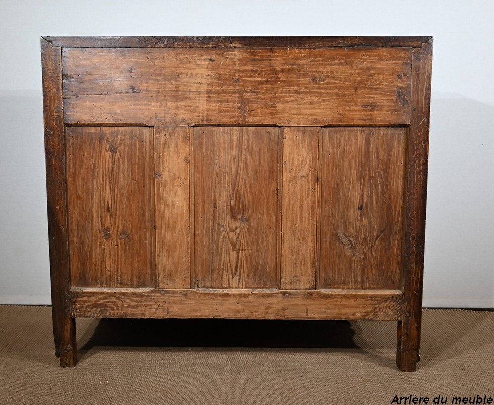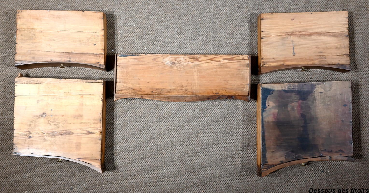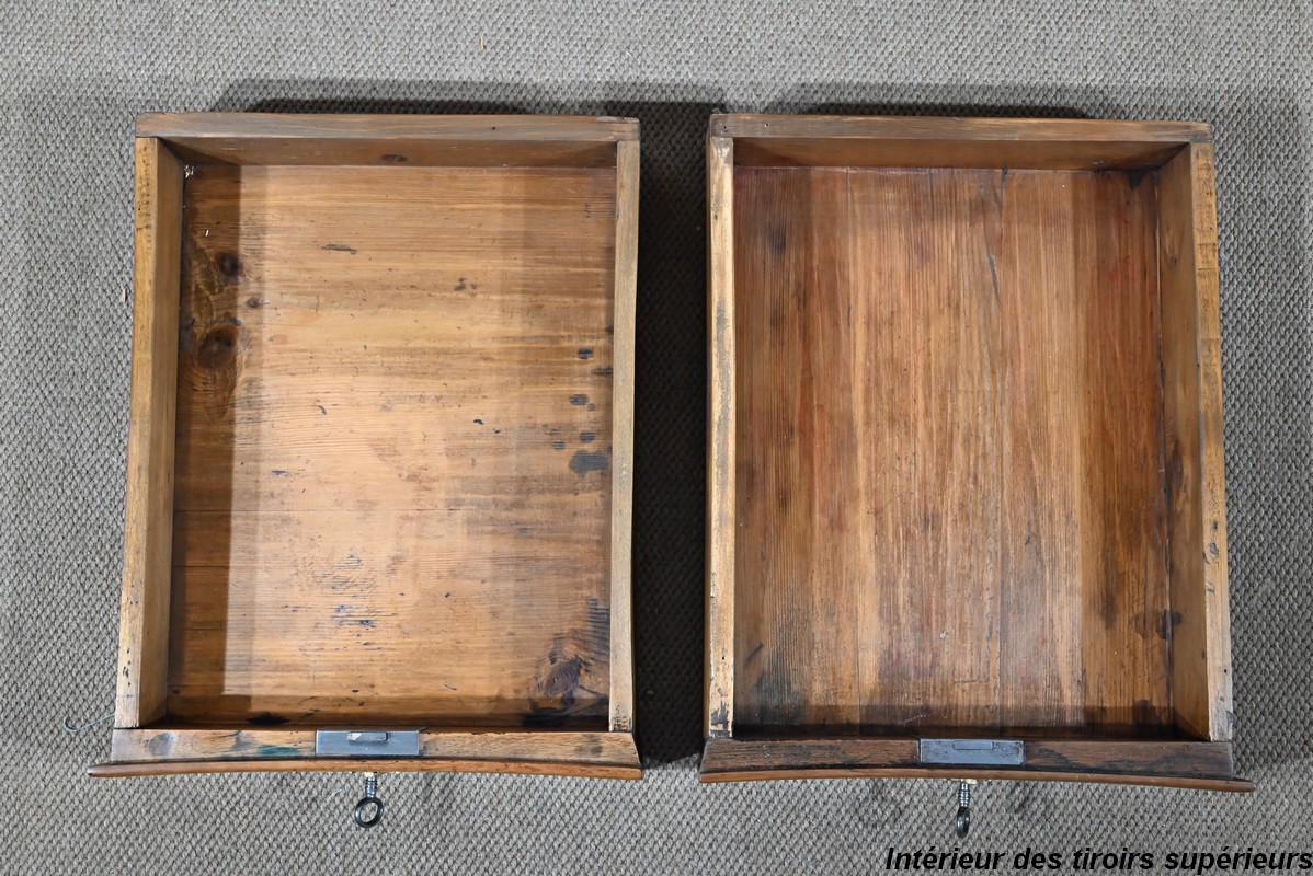 Elle ouvre par deux larges tiroirs identiques, en applique sur le corps, aux pourtours légèrement façonnés en demi-jonc. Ils sont surplombés de deux tiroirs plus petits. Ils sont équipés de serrures fer fonctionnelles, d’entrées bronze authentiques, de clés postérieures et de poignées tombantes à deux attaches avec rosaces ajourées et ciselées. Dans la partie centrale on trouve également un faux tiroir avec entrée bronze.
