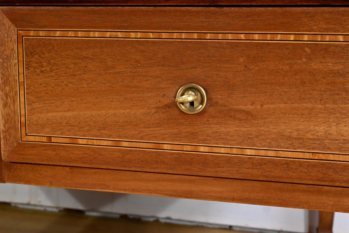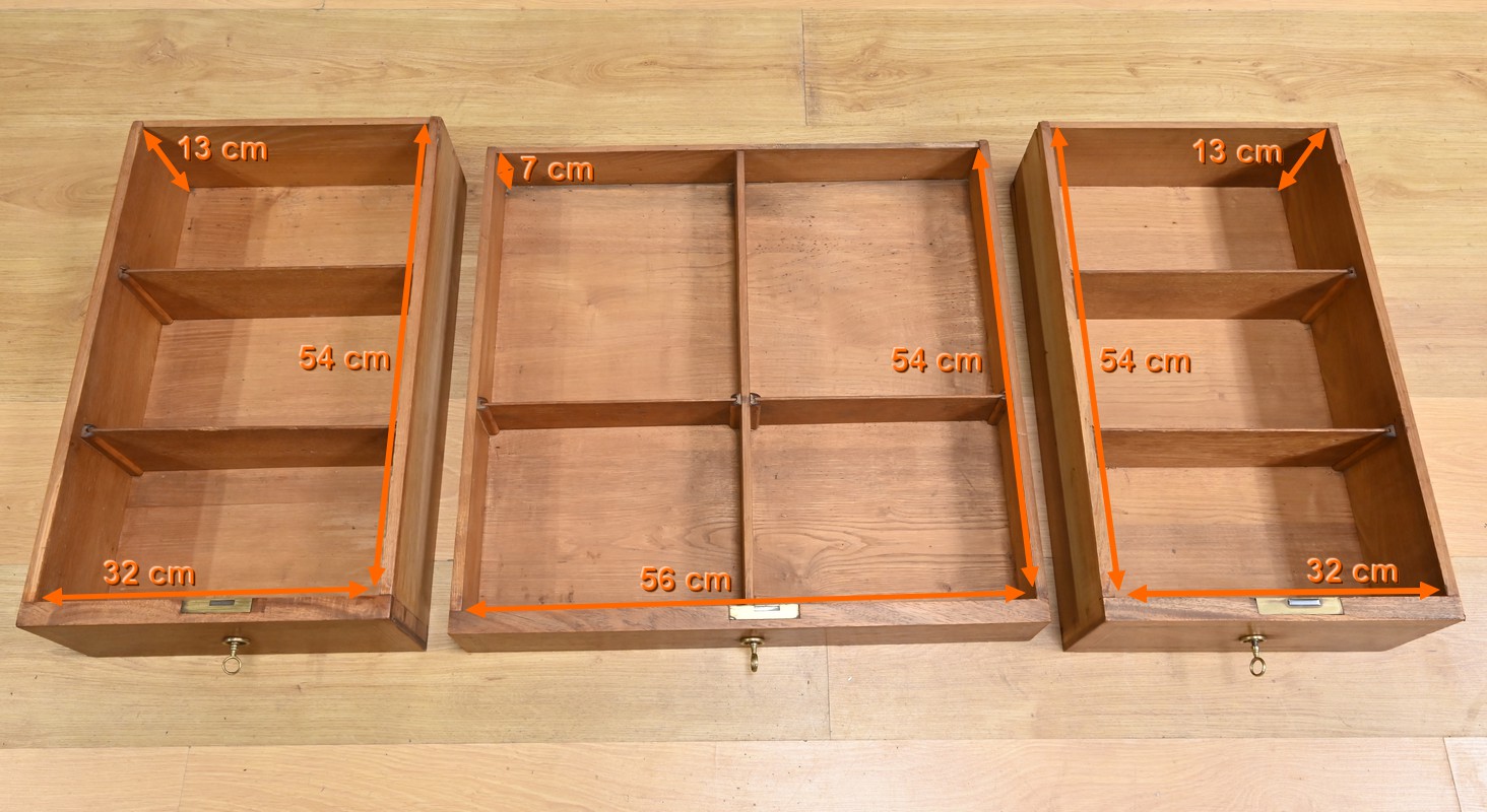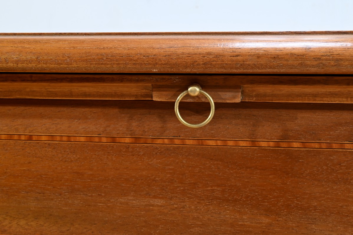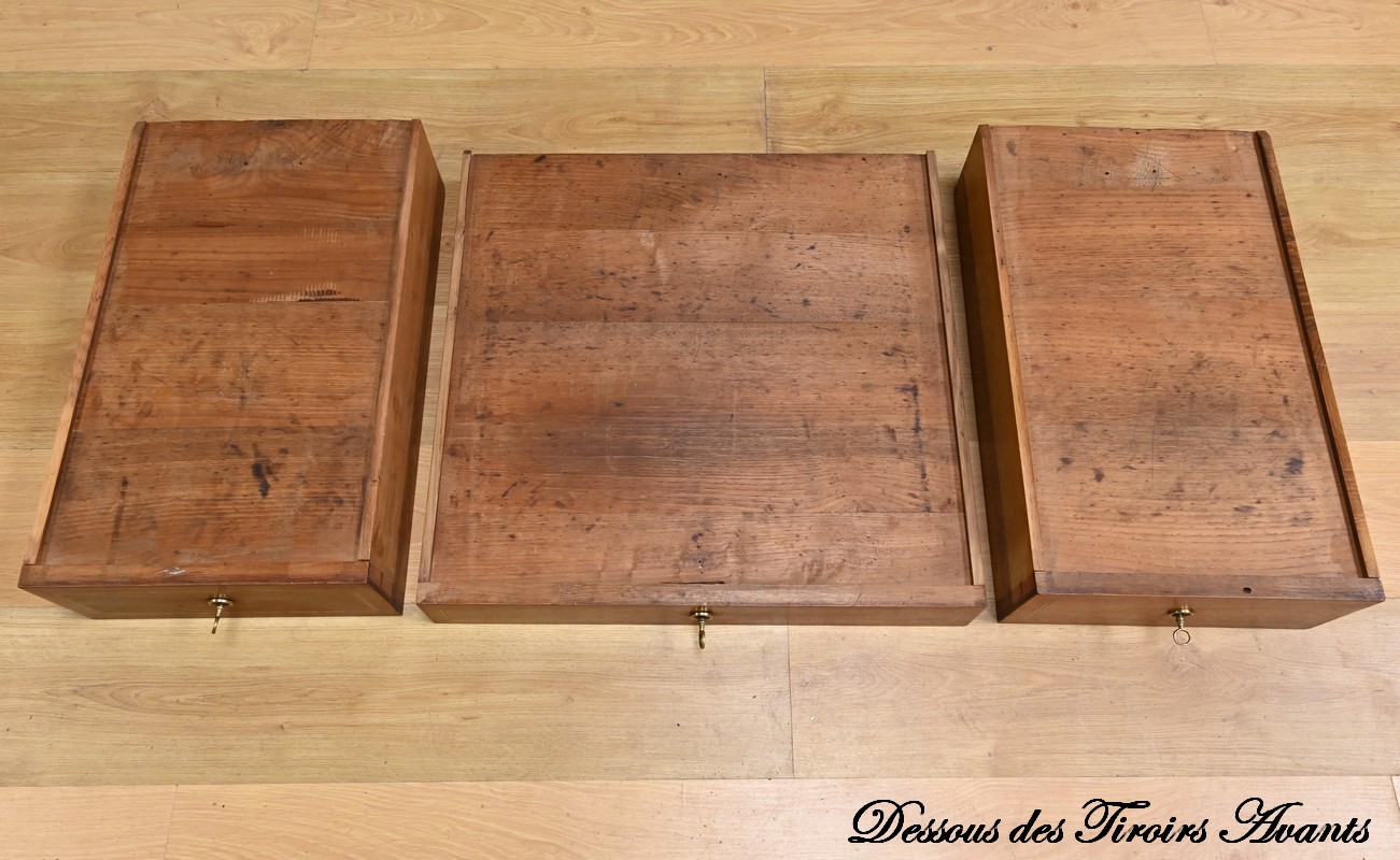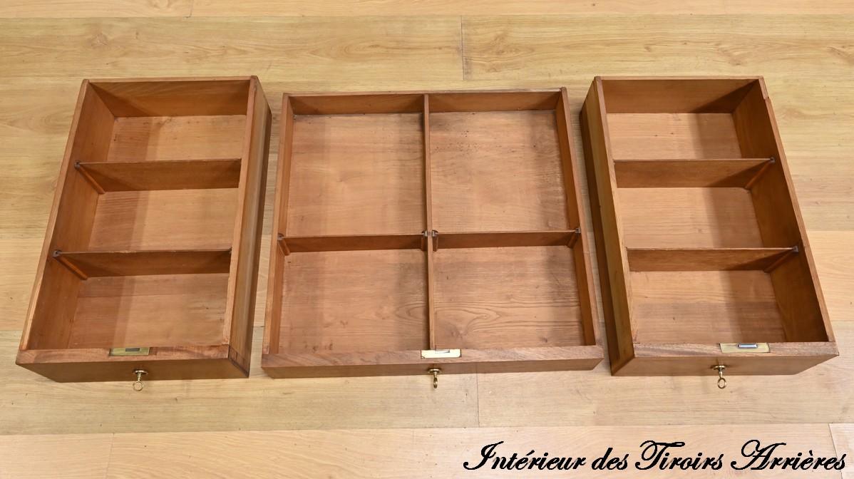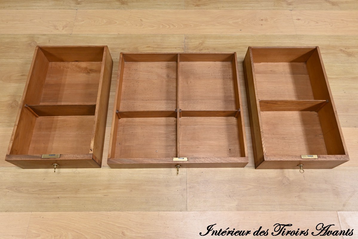 Les façades des tiroirs sont agrémentées de filets de bois de rose et d’ébène, ajoutant une touche de sophistication.