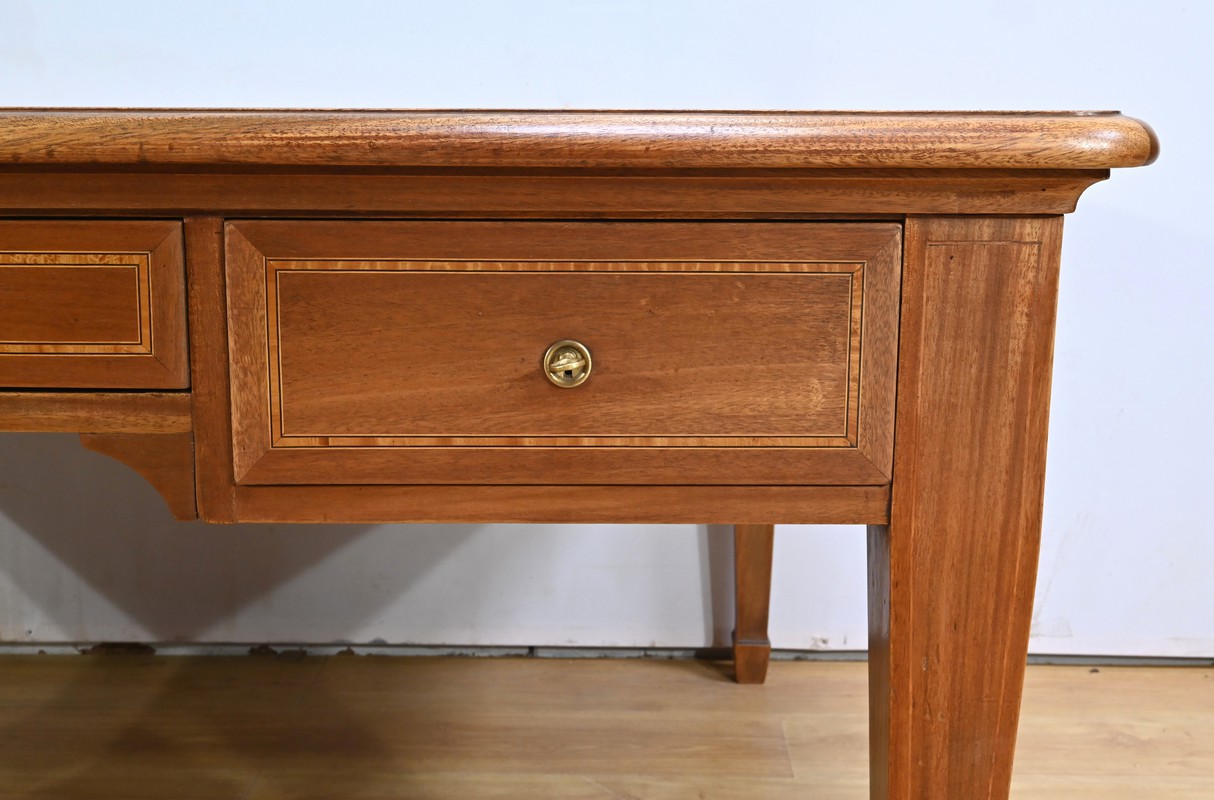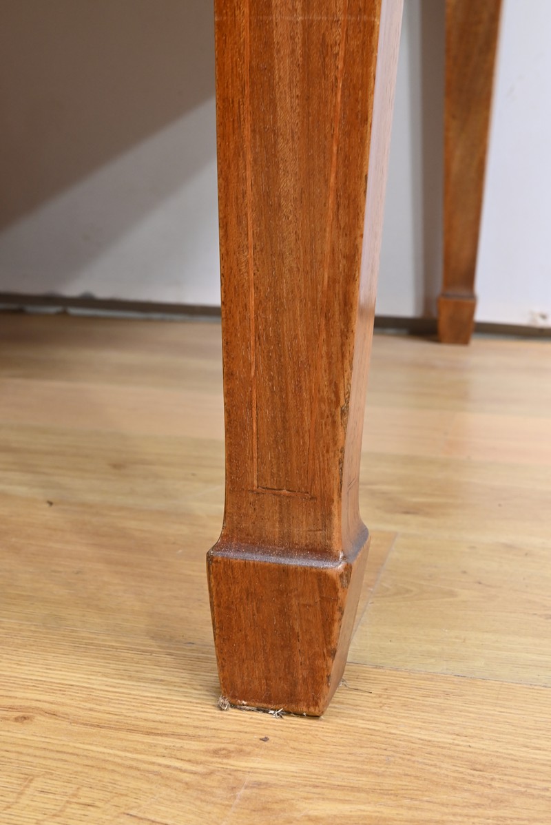 Fabriqué en acajou, il présente un cadre à coupe d’onglet raffiné par un bec de corbin, une caractéristique qui témoigne de l’attention méticuleuse portée aux détails par les ébénistes de l’époque.