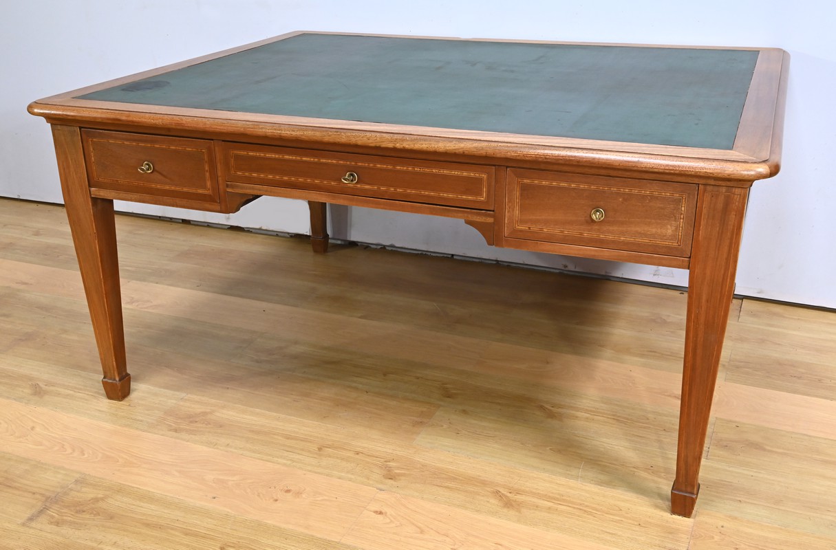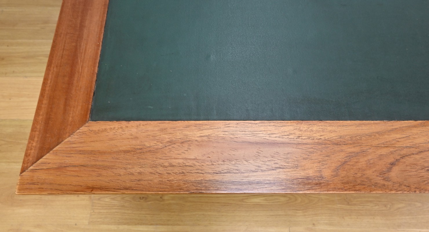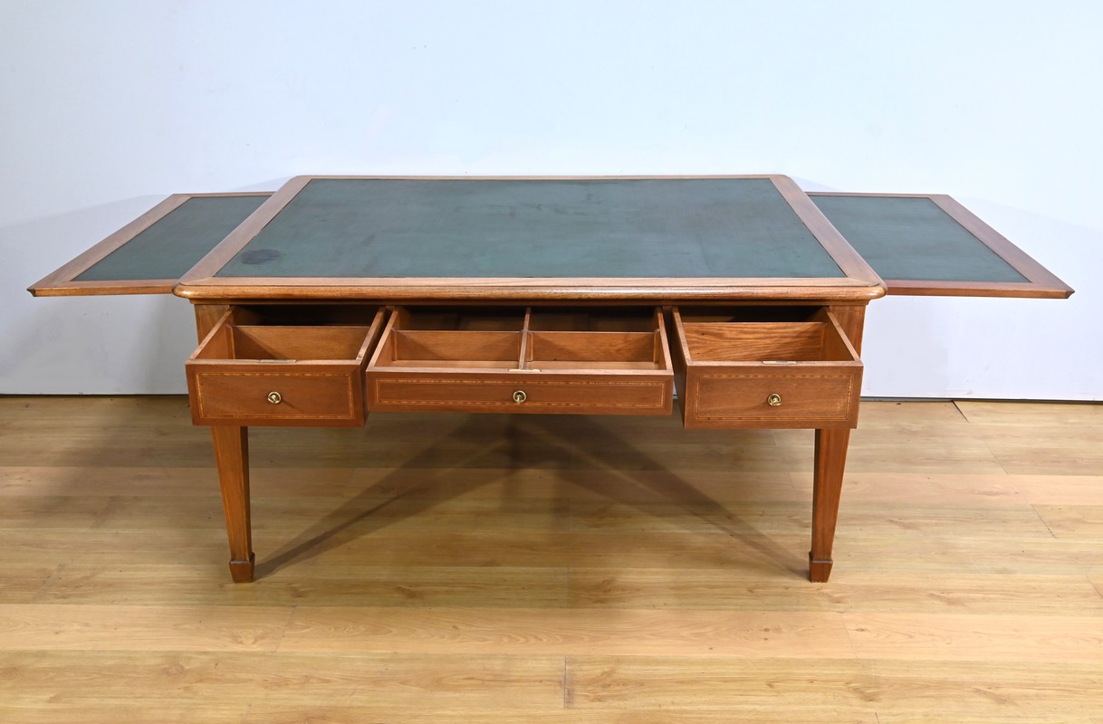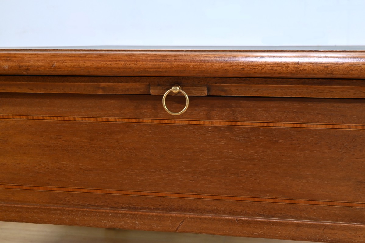 Ses deux allonges, ouvragées dans le même esprit que le plateau avec anneaux de tirage en laiton, sont revêtues d’un simili cuir vert, offrant une surface de travail étendue et confortable.