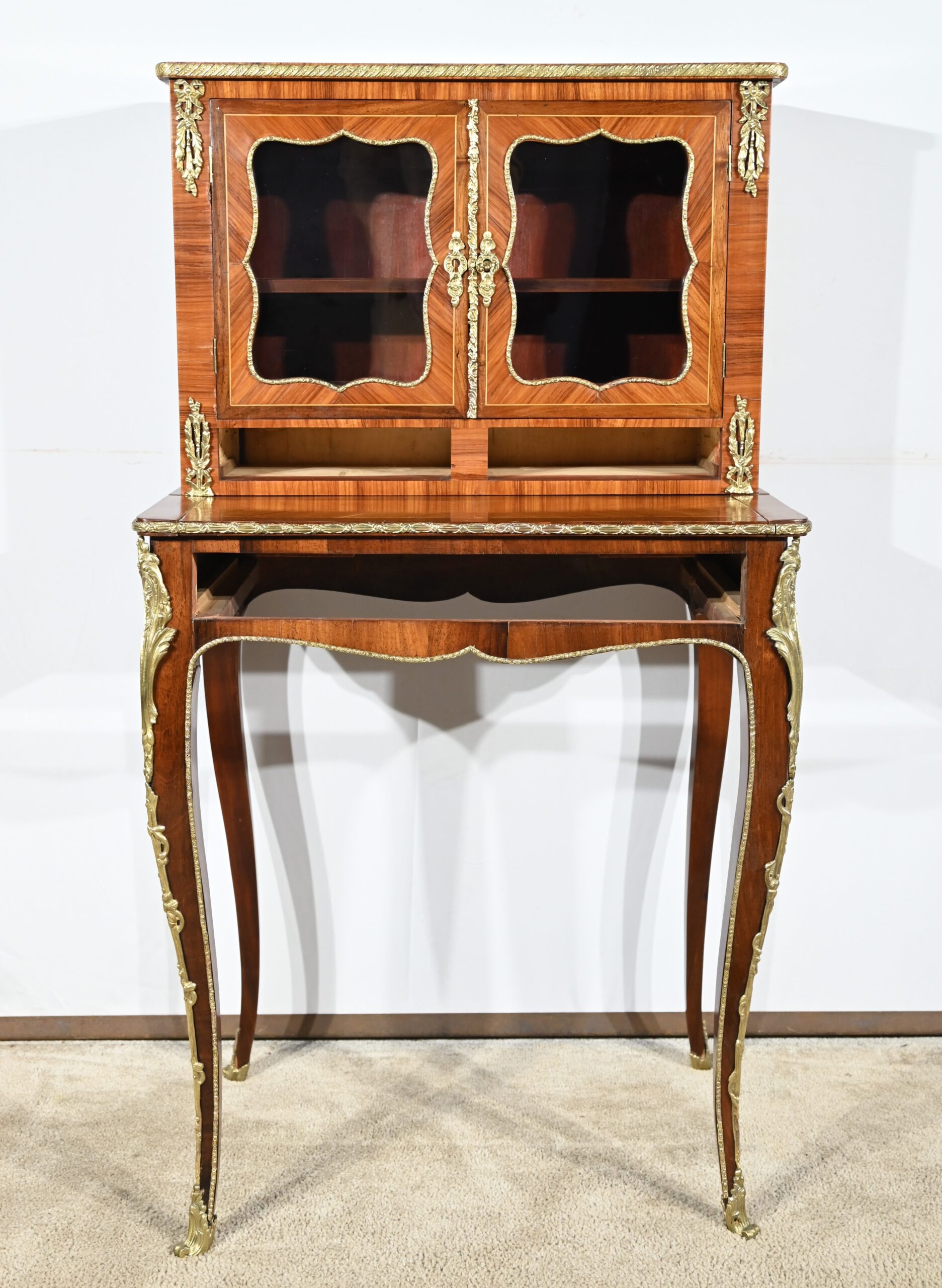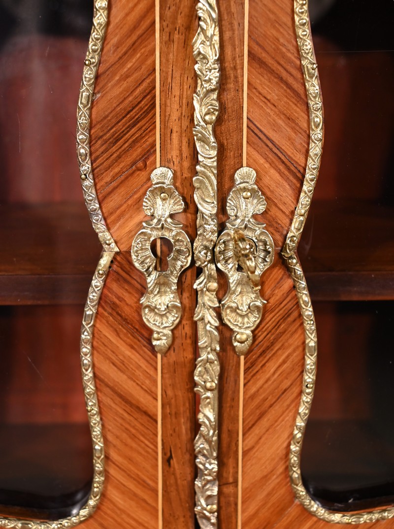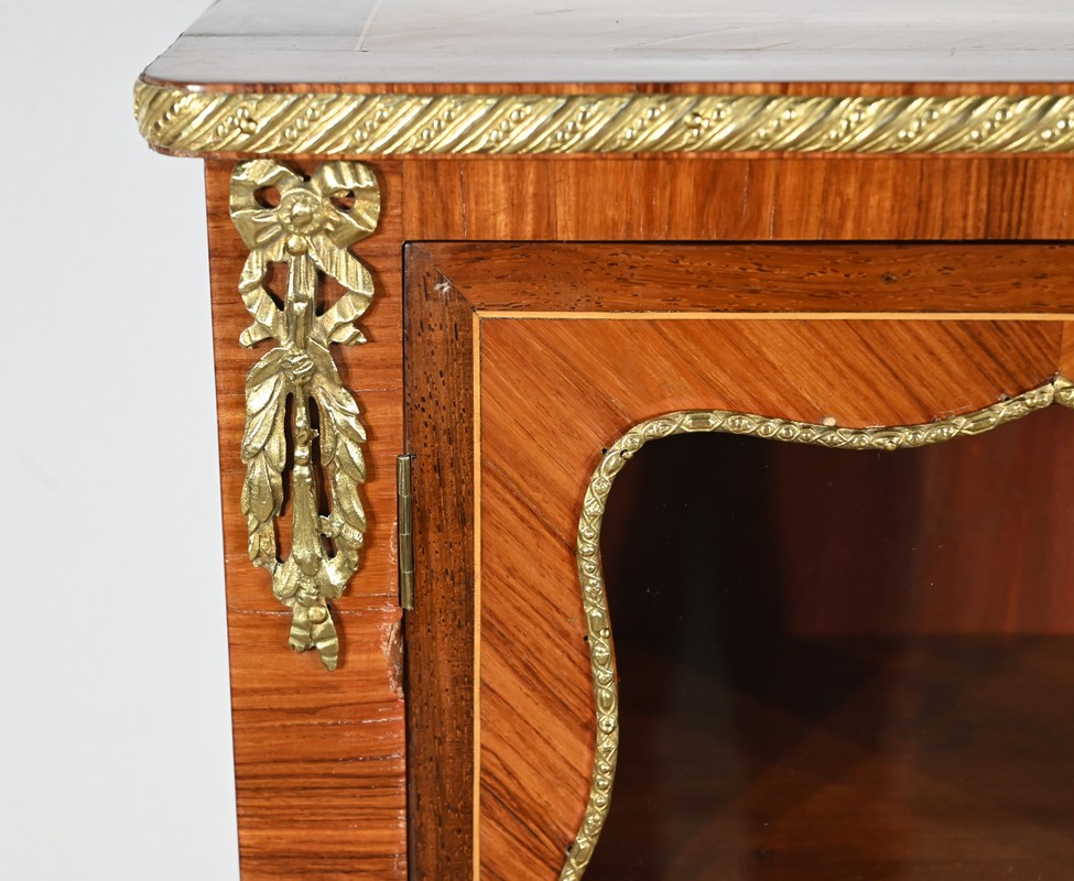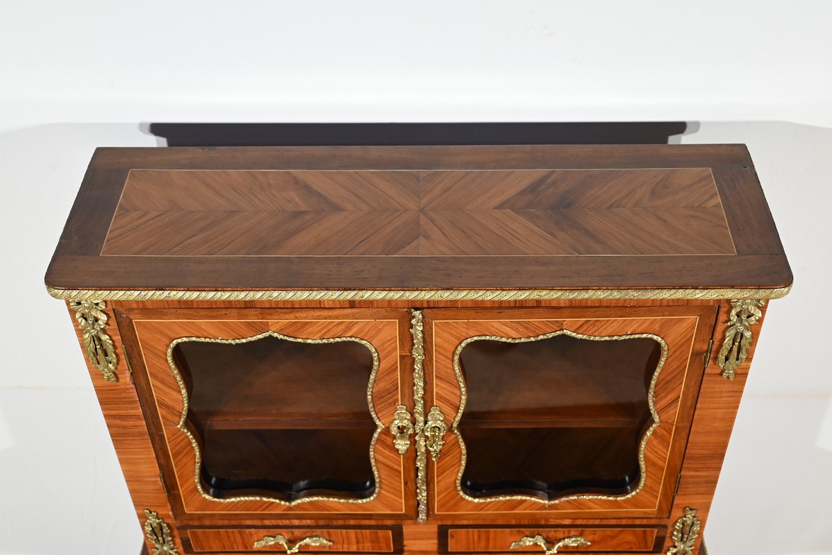 Au-dessus, les deux portes vitrées, soulignés de baguettes en bronze, sont munis d’une serrure en parfait état de fonctionnement avec clé et entrée.