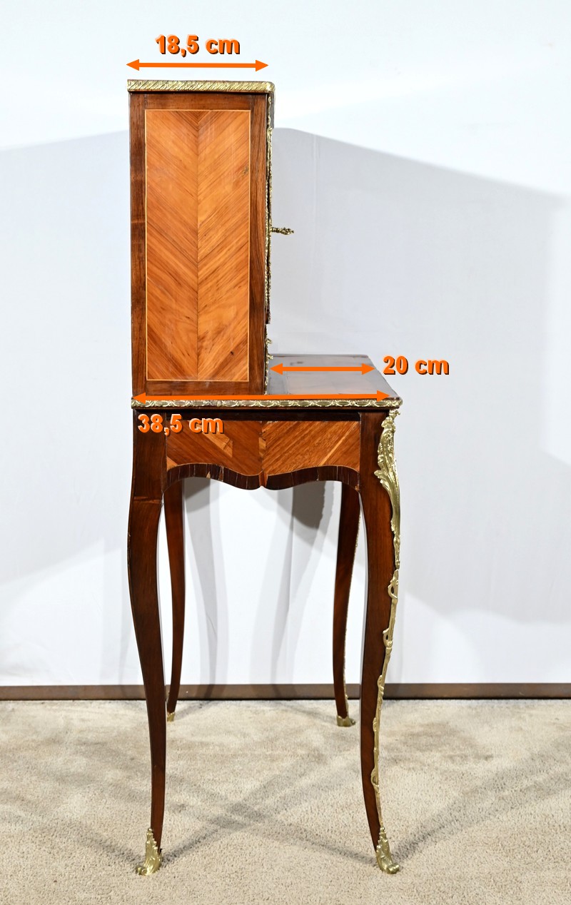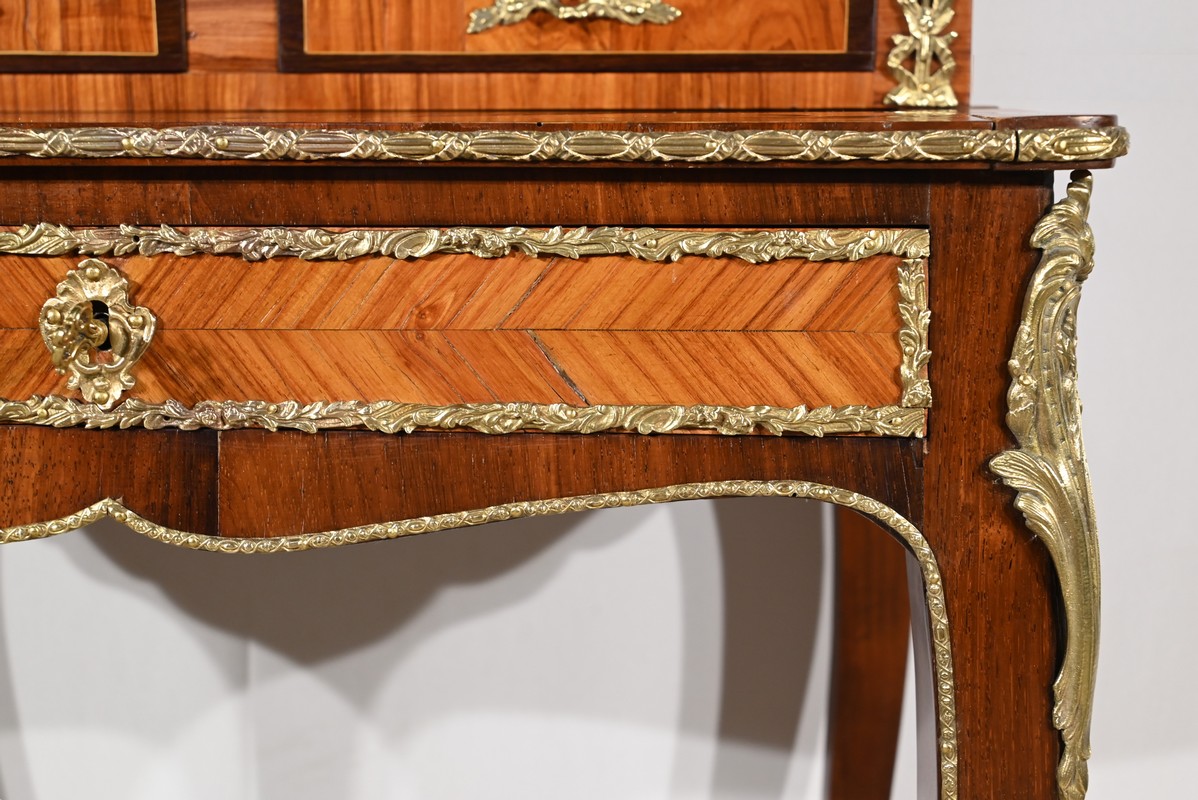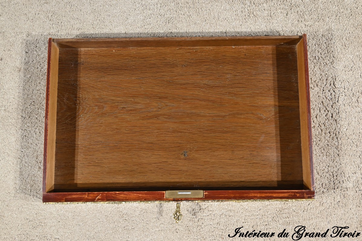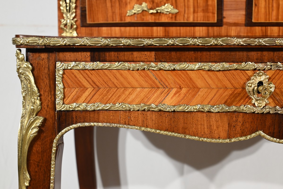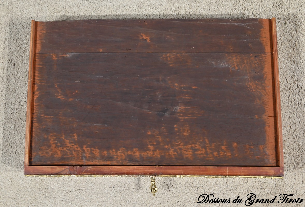 Ce petit bonheur du jour ouvre par un tiroir en placage de bois de rose disposé en ailes de papillon. Celui-ci, garni d’une baguette en bronze ouvragé, est équipé d’une serrure fonctionnelle avec clé ainsi qu’une entrée d’origine.