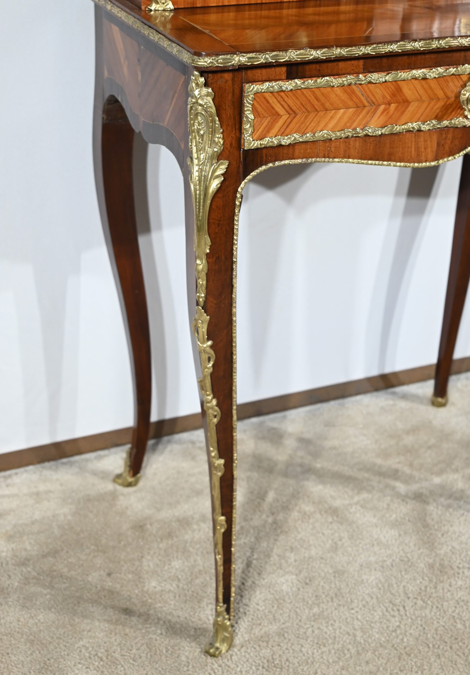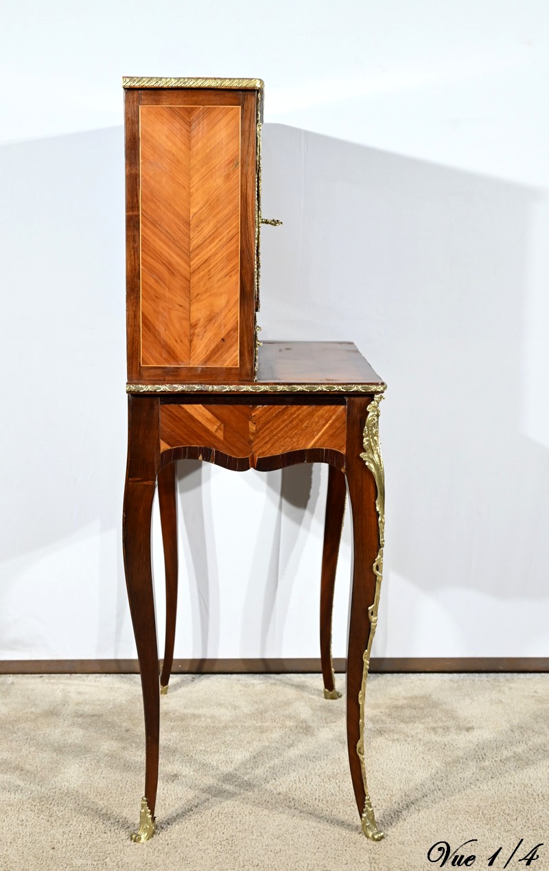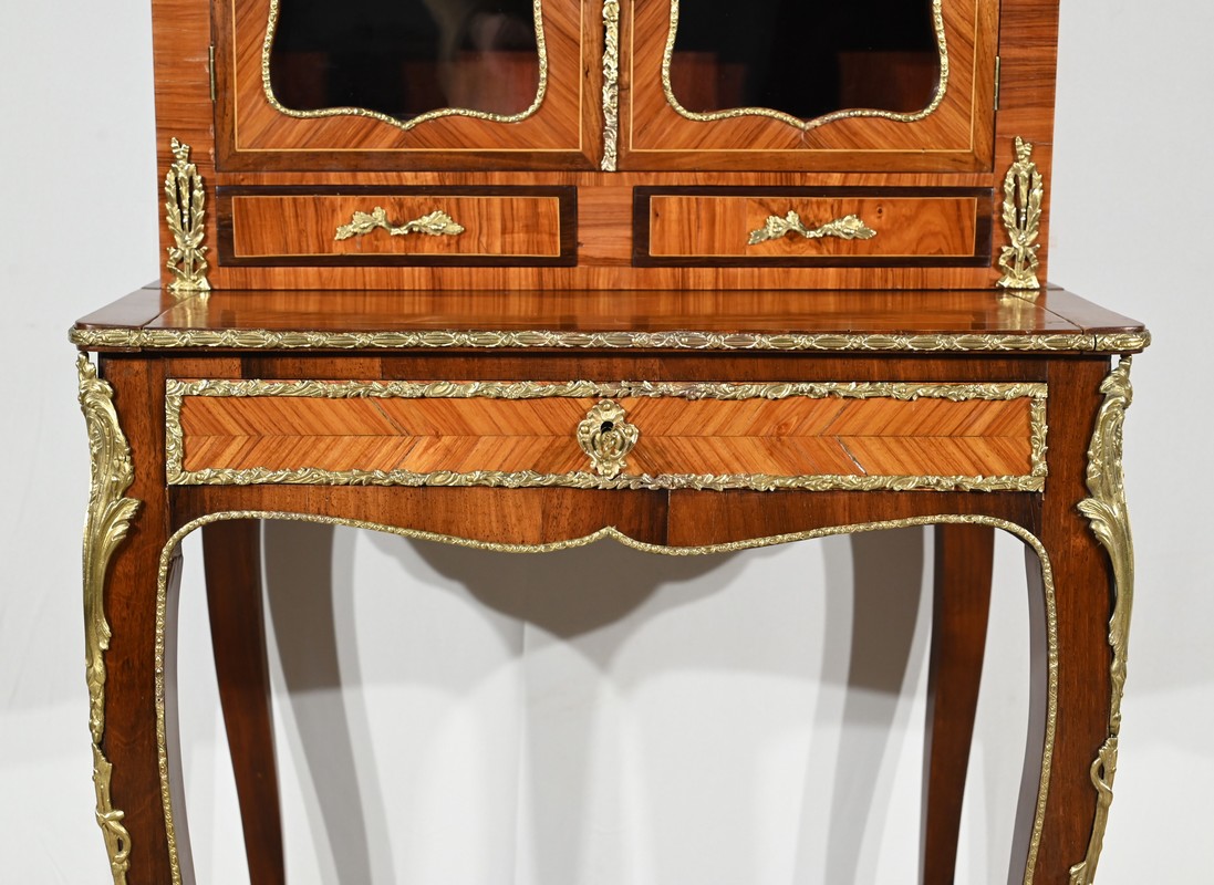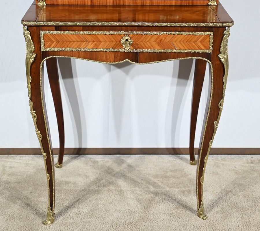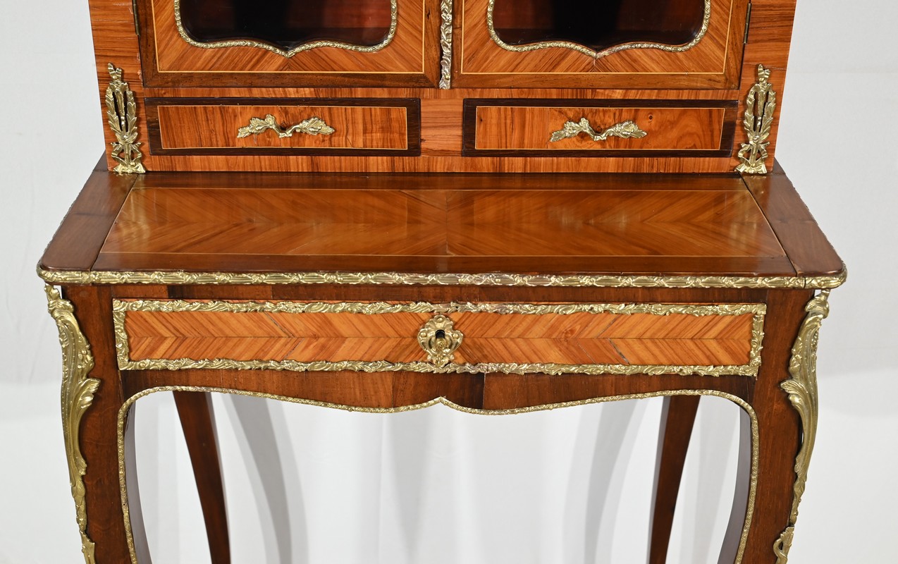 Ce petit bonheur du jour ouvre par un tiroir en placage de bois de rose disposé en ailes de papillon. Celui-ci, garni d’une baguette en bronze ouvragé, est équipé d’une serrure fonctionnelle avec clé ainsi qu’une entrée d’origine.