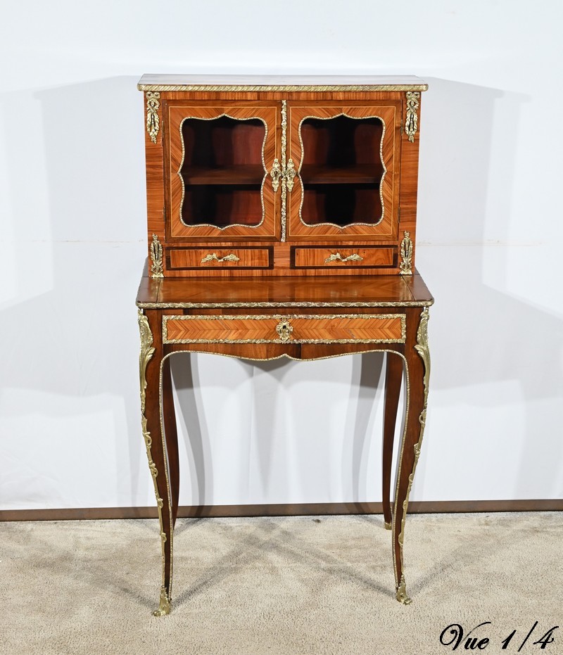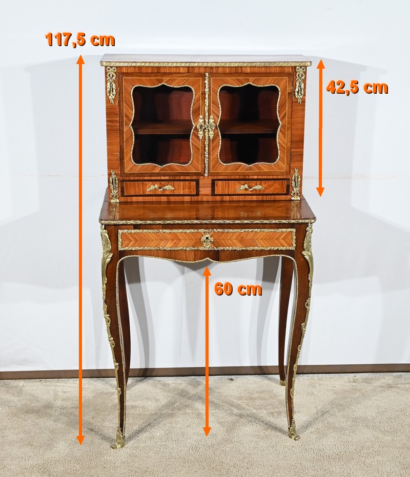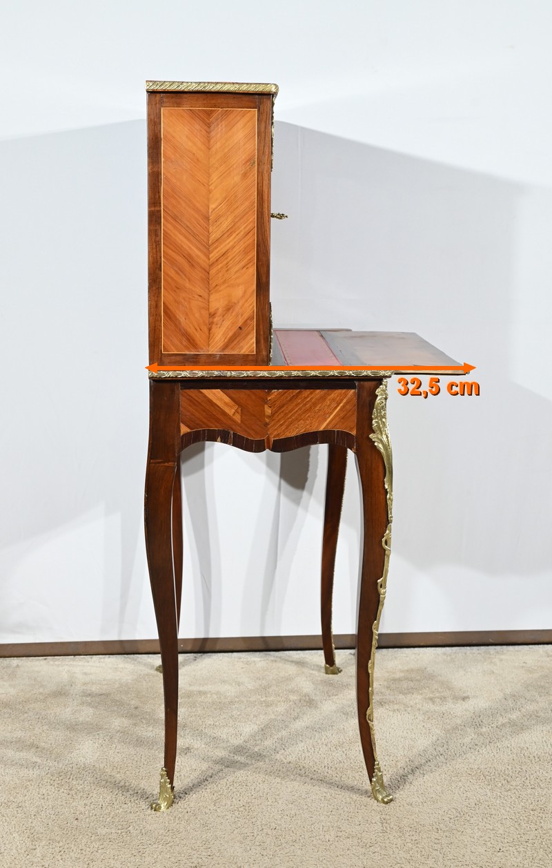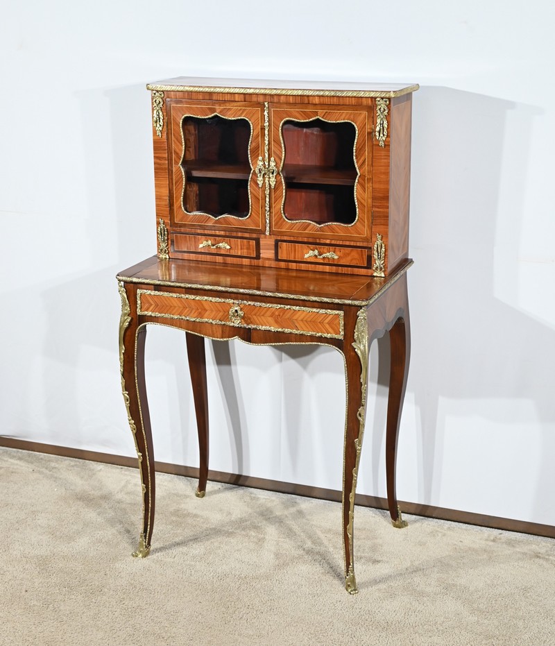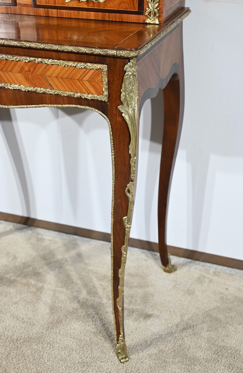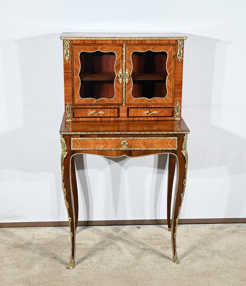 Ce petit bonheur du jour ouvre par un tiroir en placage de bois de rose disposé en ailes de papillon. Celui-ci, garni d’une baguette en bronze ouvragé, est équipé d’une serrure fonctionnelle avec clé ainsi qu’une entrée d’origine.