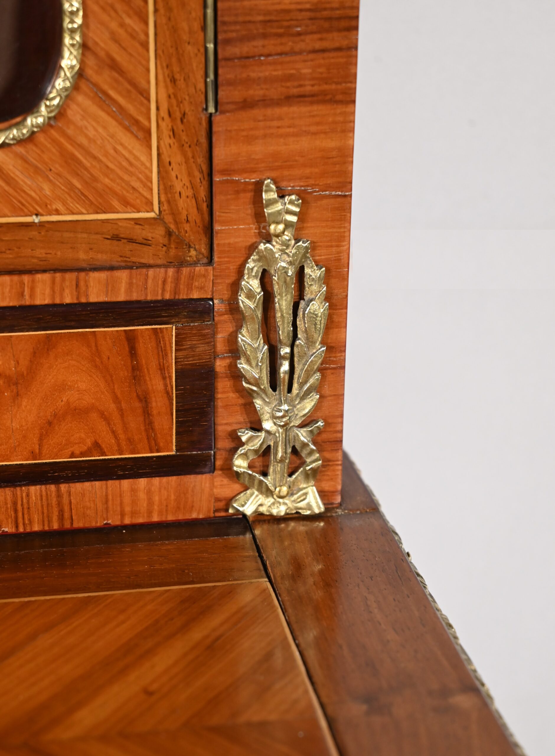Les montants sont habillés de motifs en bronze à décor de nœuds et de rameaux de laurier.