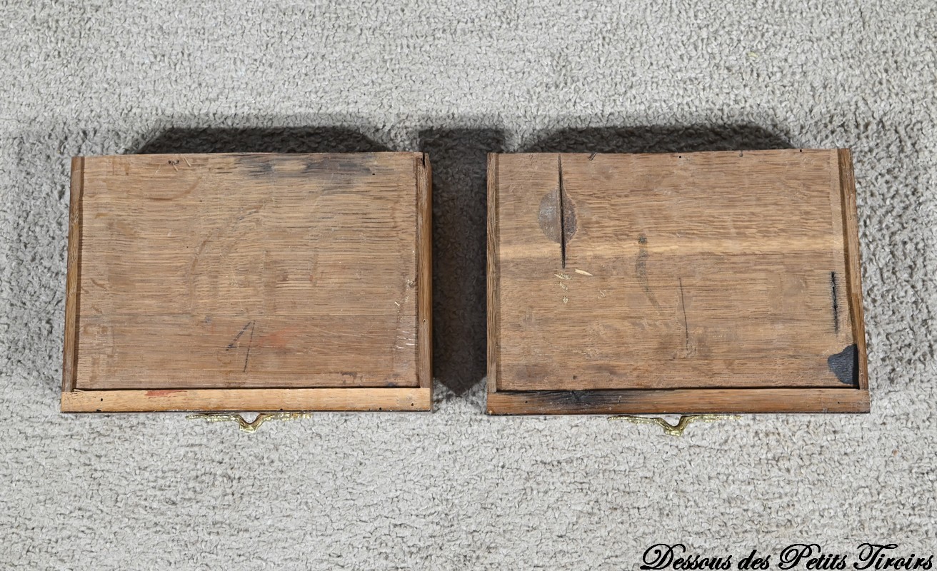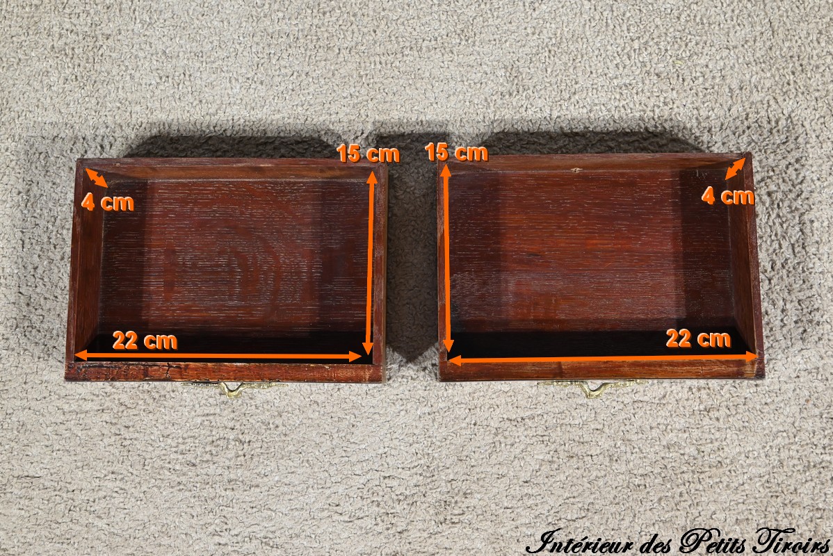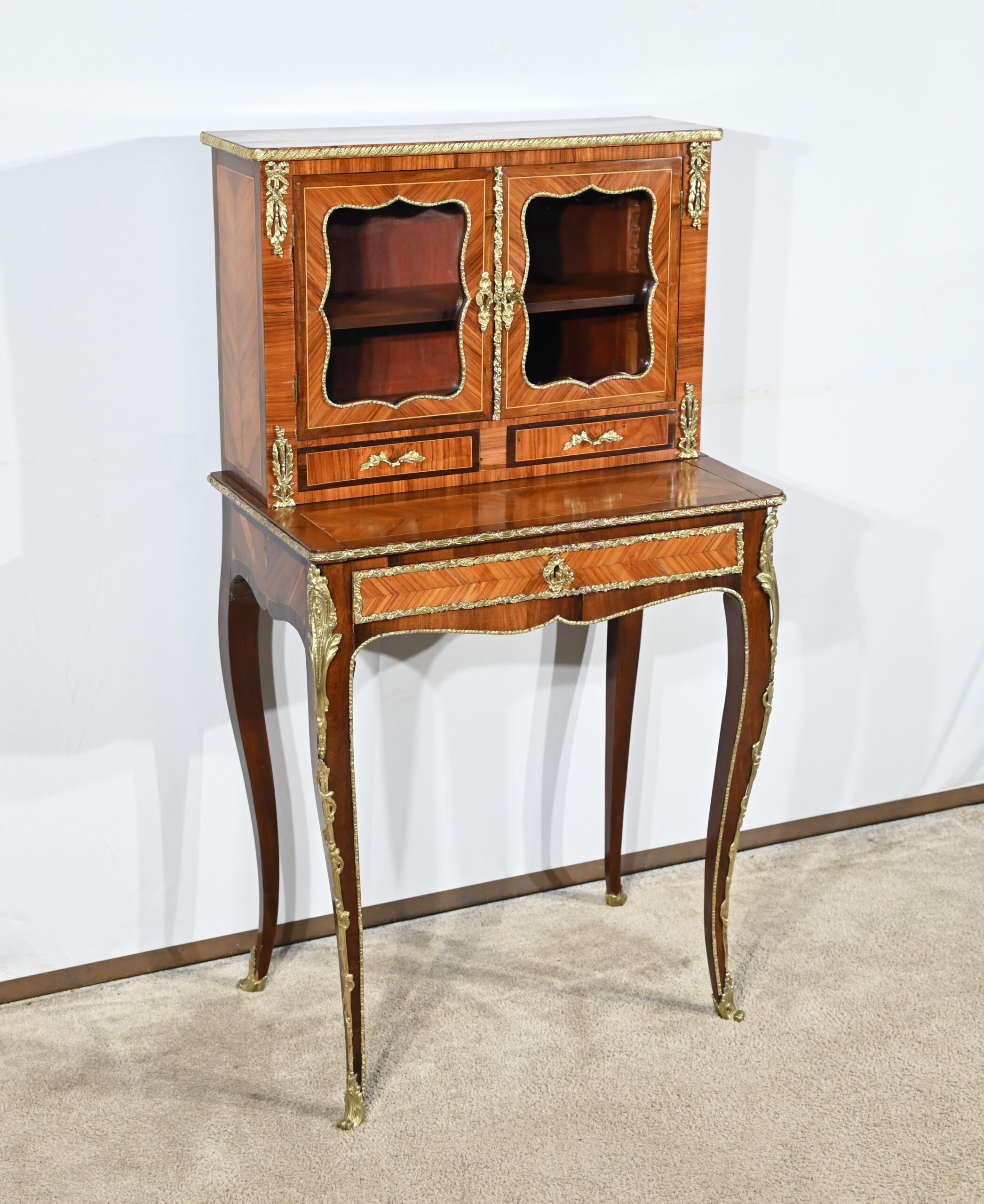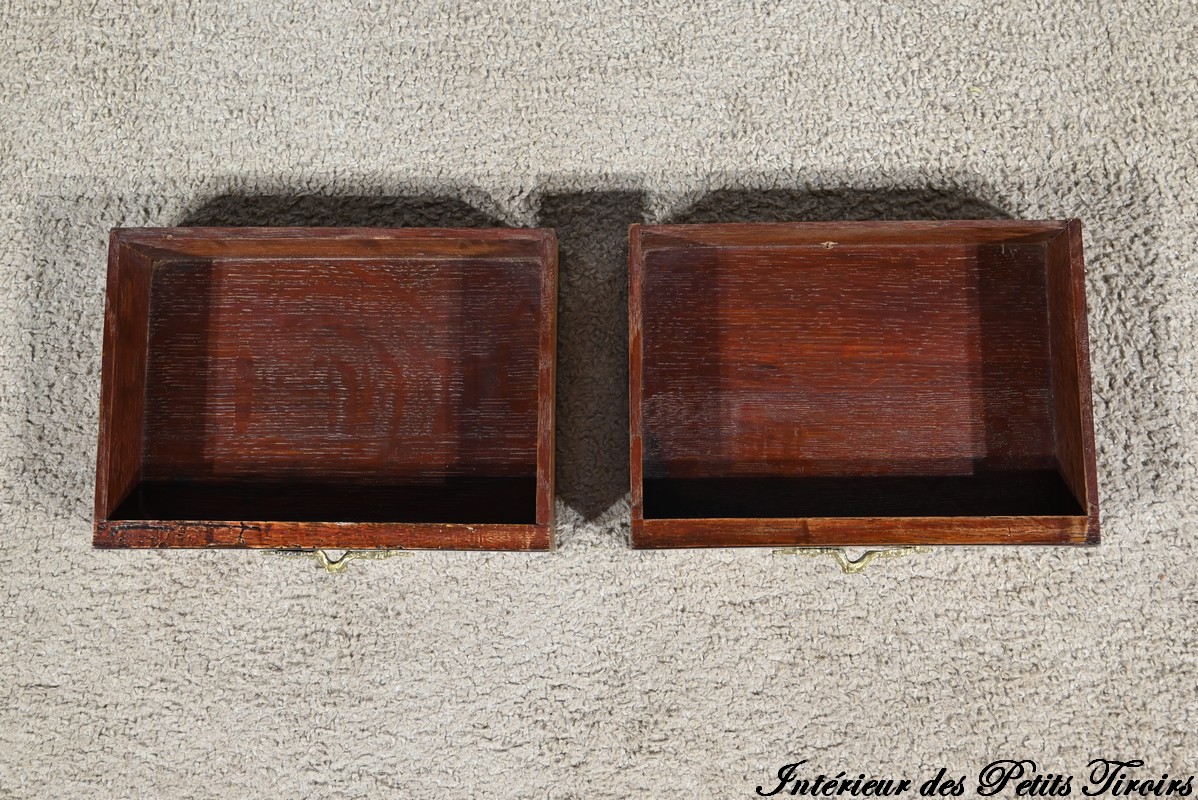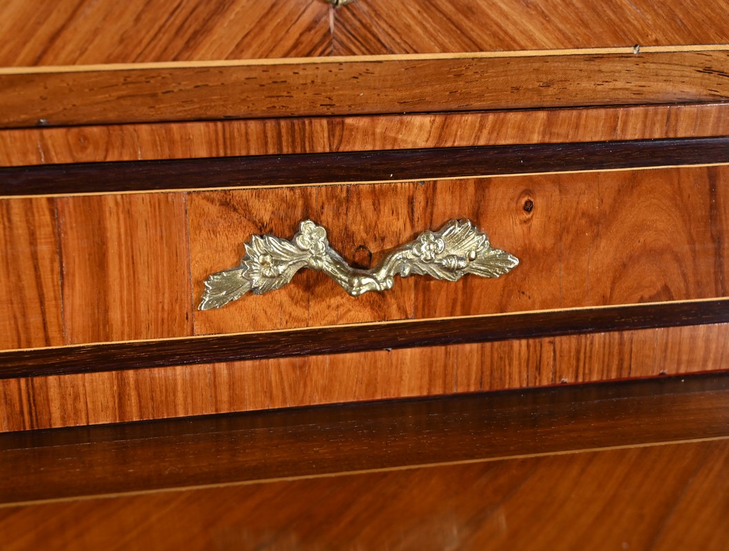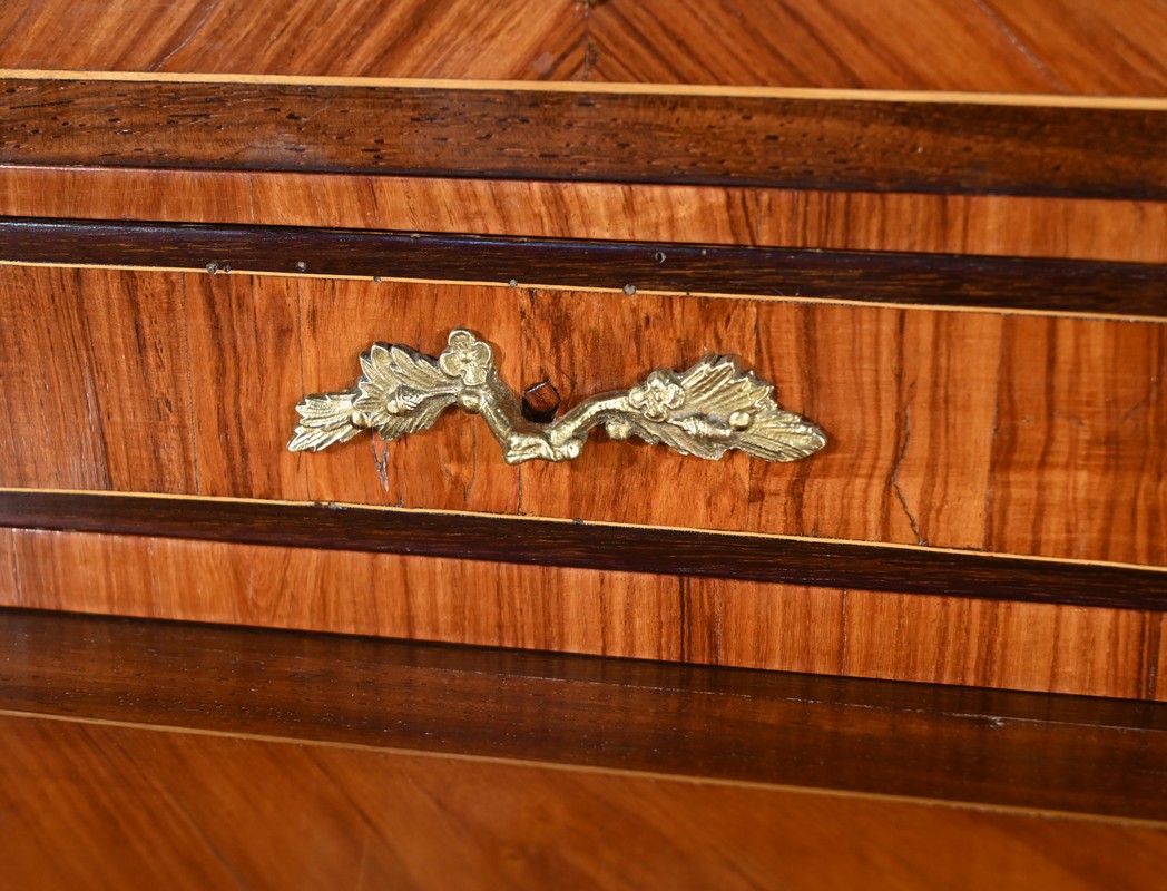 La partie supérieure en retrait comporte deux petits tiroirs à poignées bronze en placage de bois de rose et amarante.