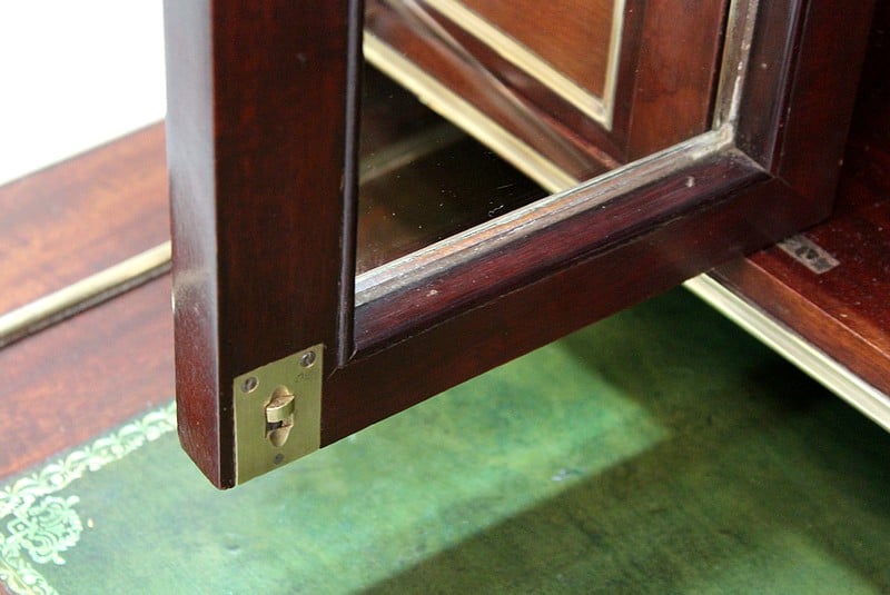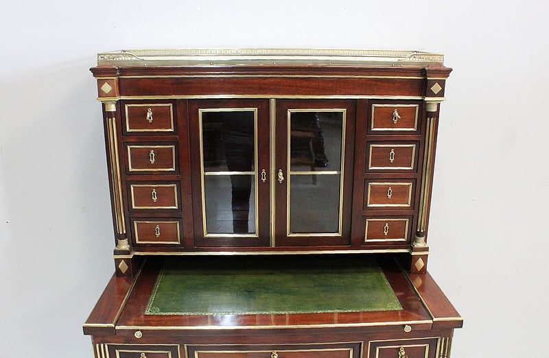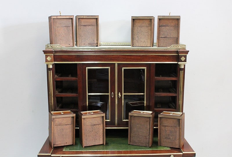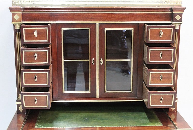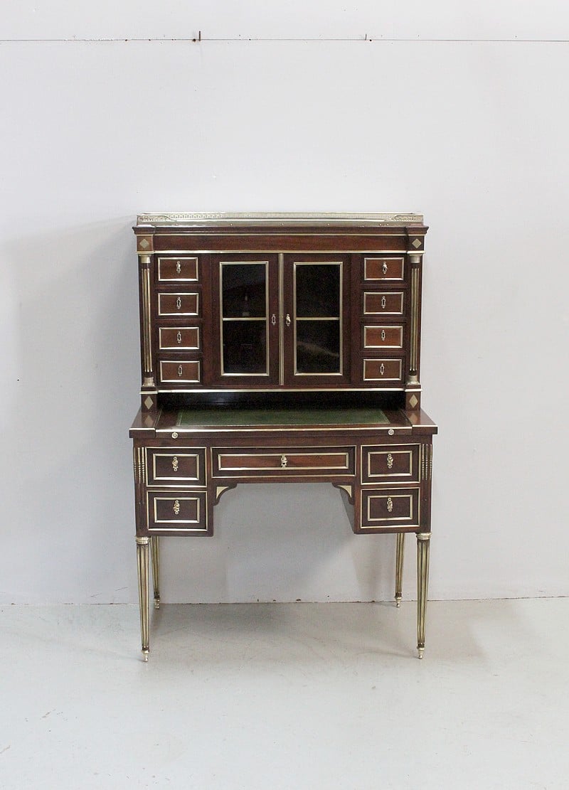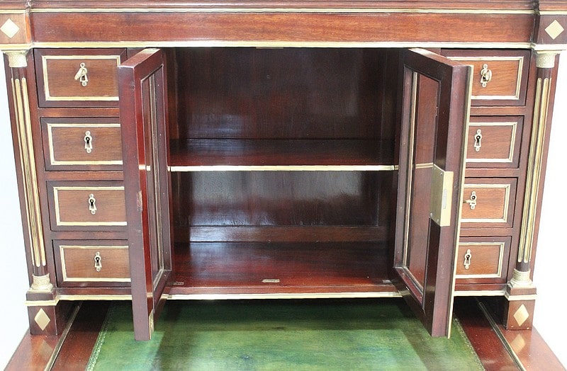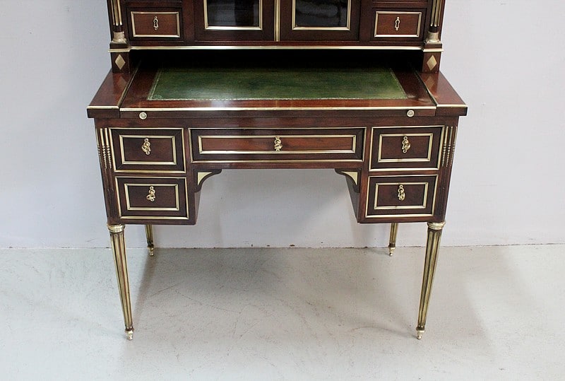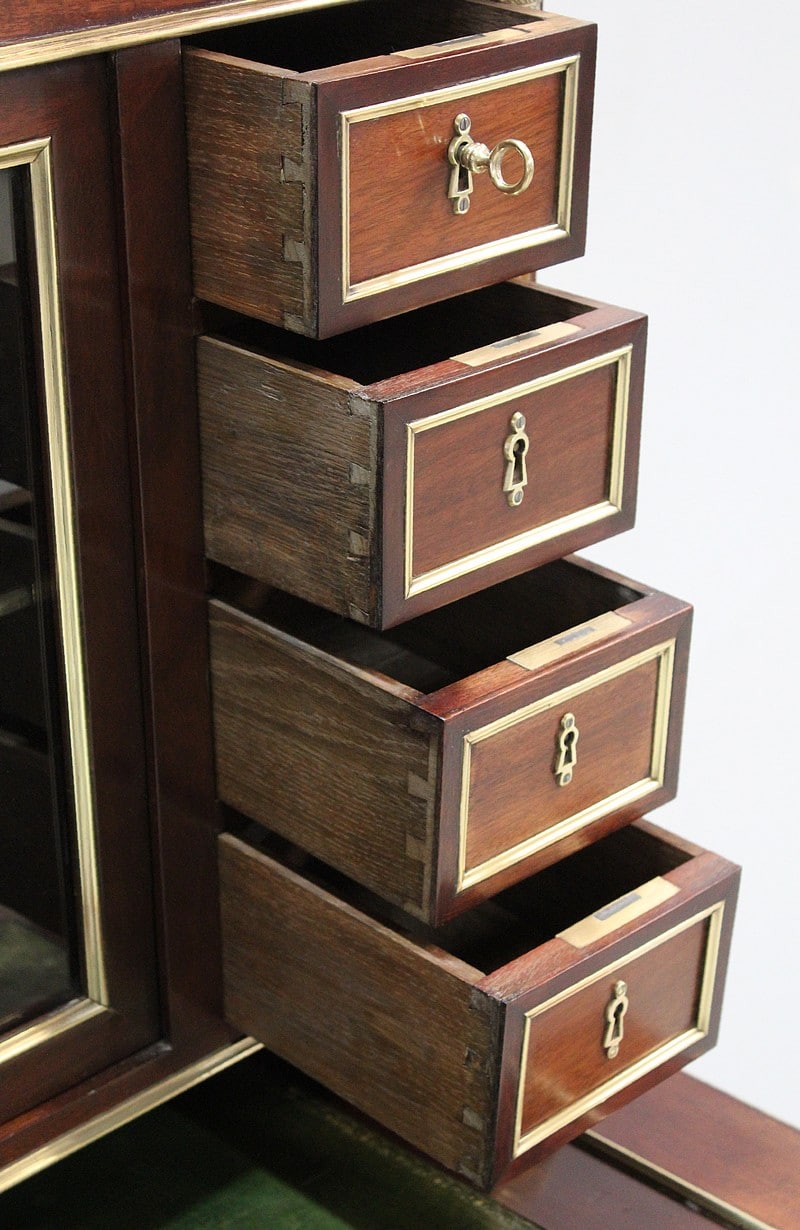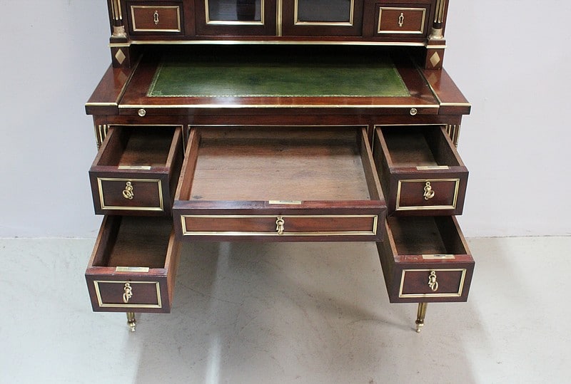 Il ouvre en partie haute à 8 tiroirs ornés de baguettes de laiton, répartis de part et d’autre de 2 petites portes vitrées, tous fermant à clef. L’intérieur est garni d’une étagère bordée de laiton et posée sur tasseaux fixes.