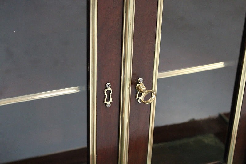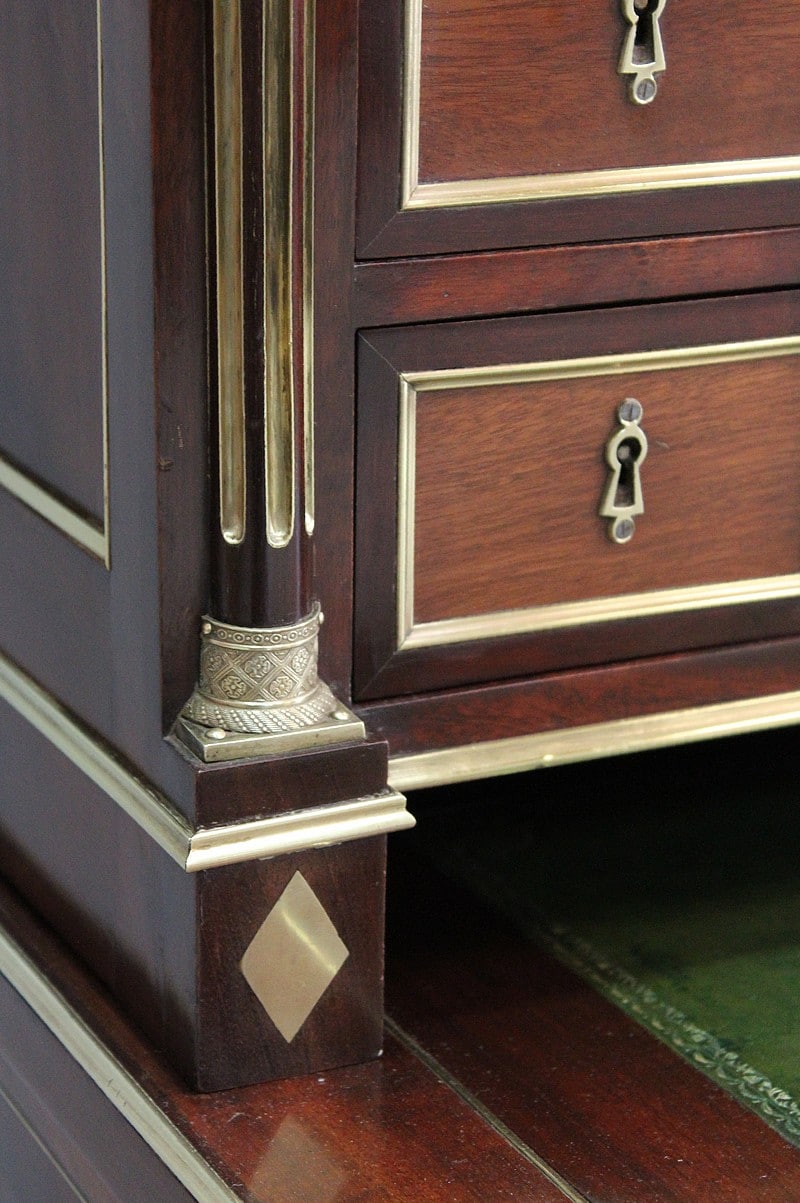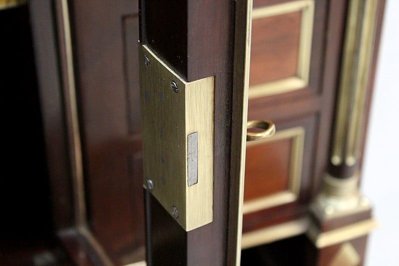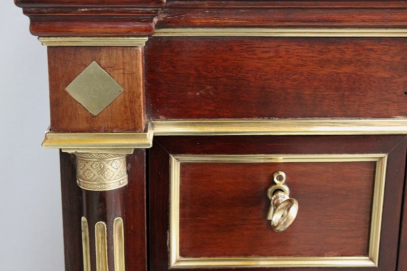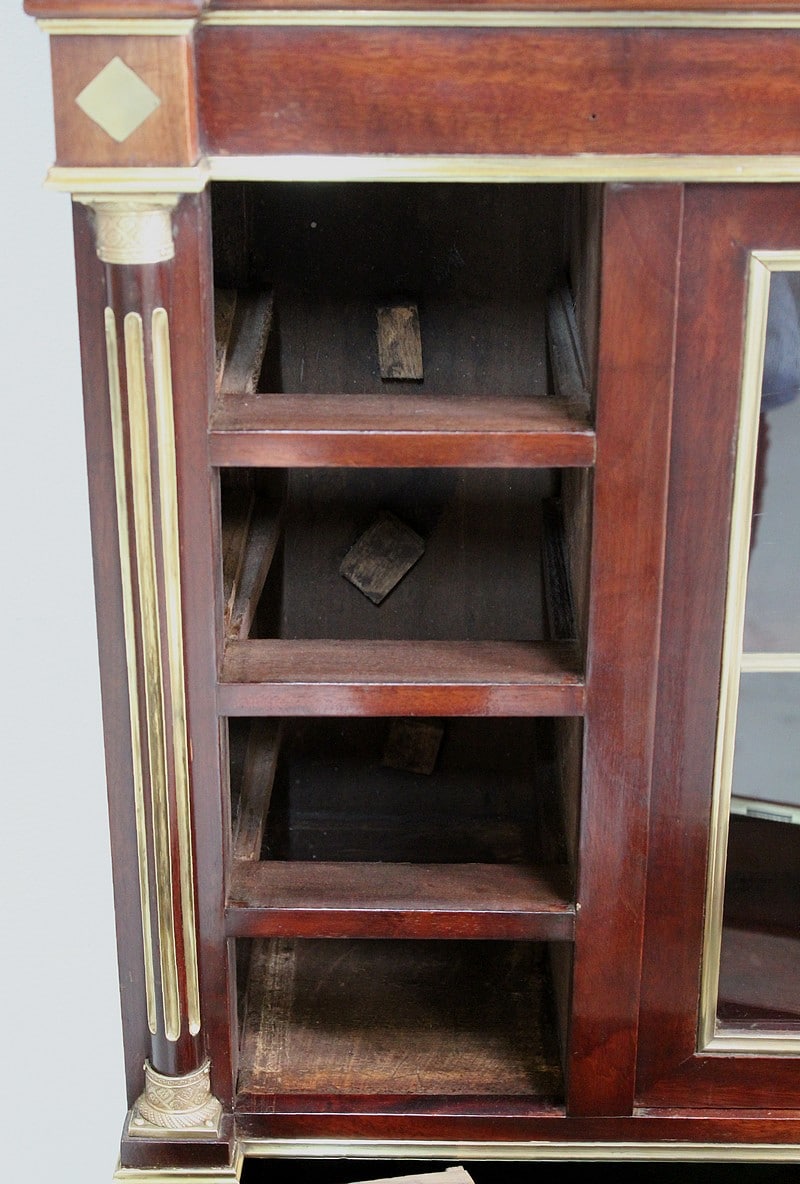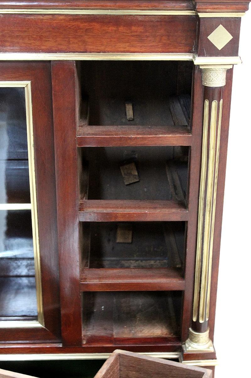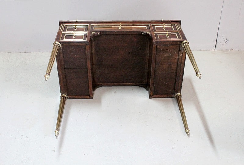 Il ouvre en partie haute à 8 tiroirs ornés de baguettes de laiton, répartis de part et d’autre de 2 petites portes vitrées, tous fermant à clef. L’intérieur est garni d’une étagère bordée de laiton et posée sur tasseaux fixes.
