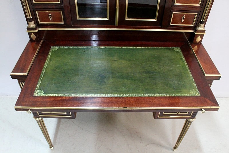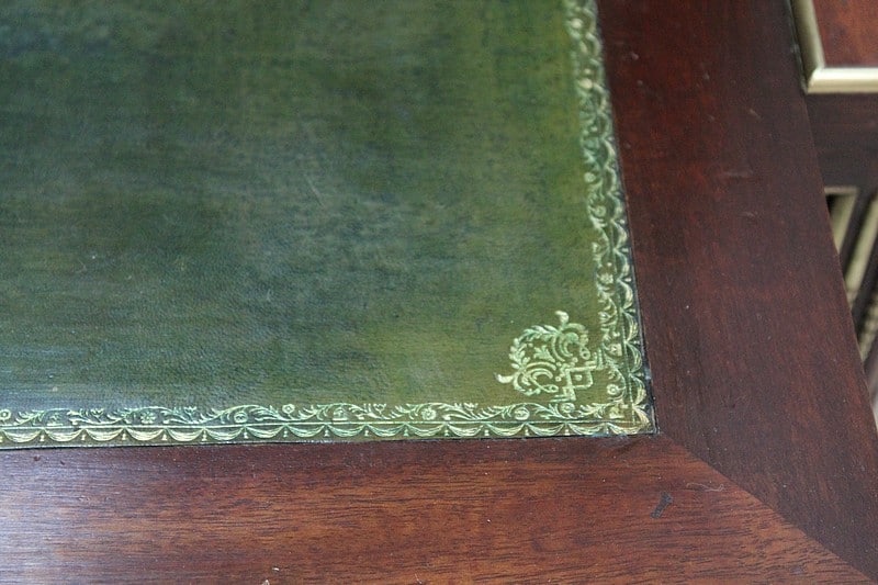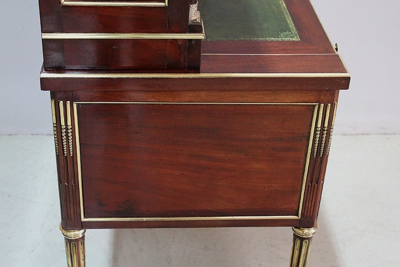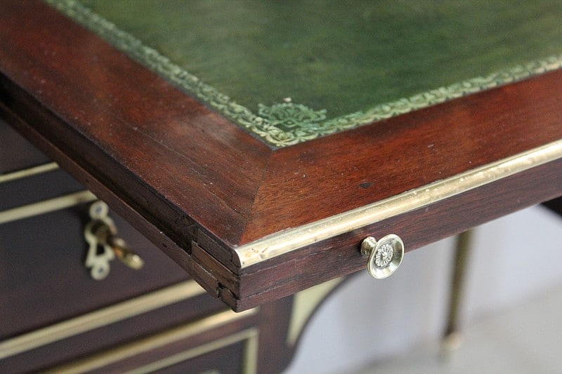 En dessous, une tablette rétractable est recouverte d’un cuir vert ancien postérieur au meuble et agrémentée de 2 petits boutons.