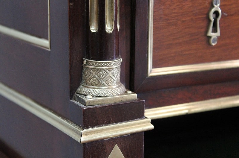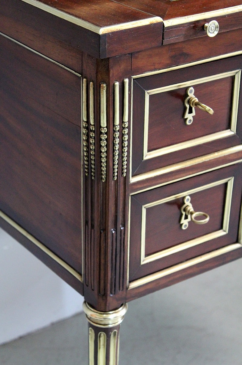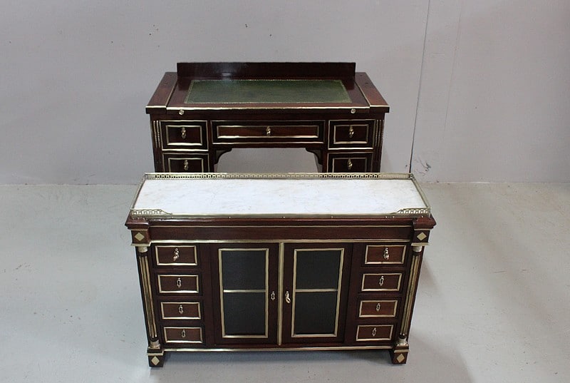 Les intérieurs, côtés et fonds de tiroirs sont en Chêne et l’arrière panneauté est en Acajou.