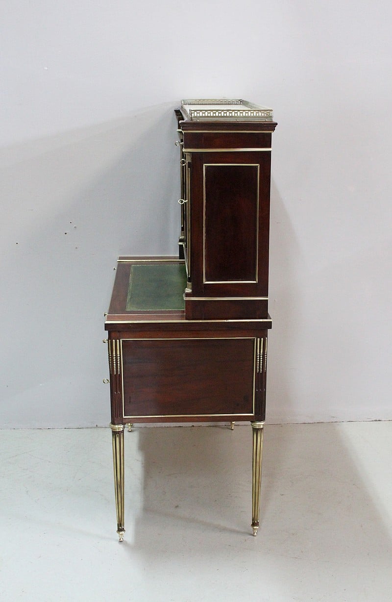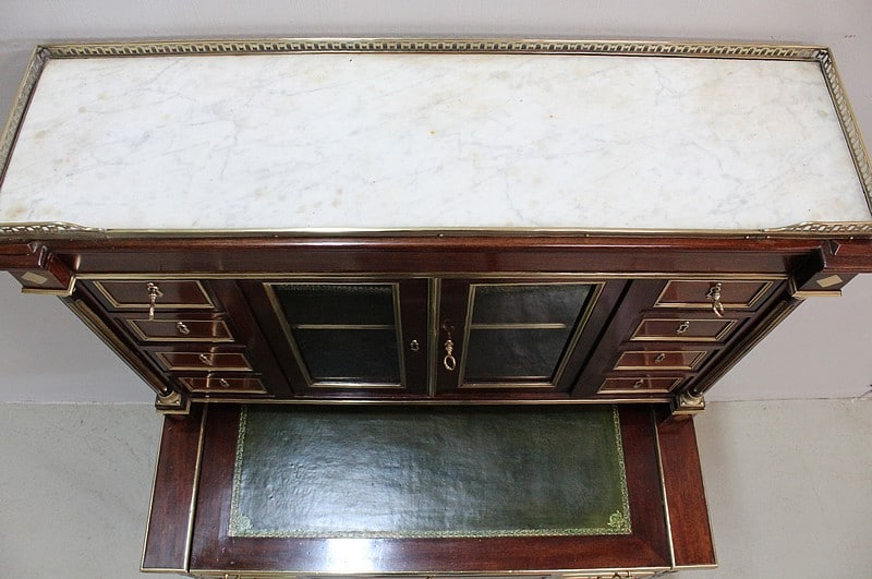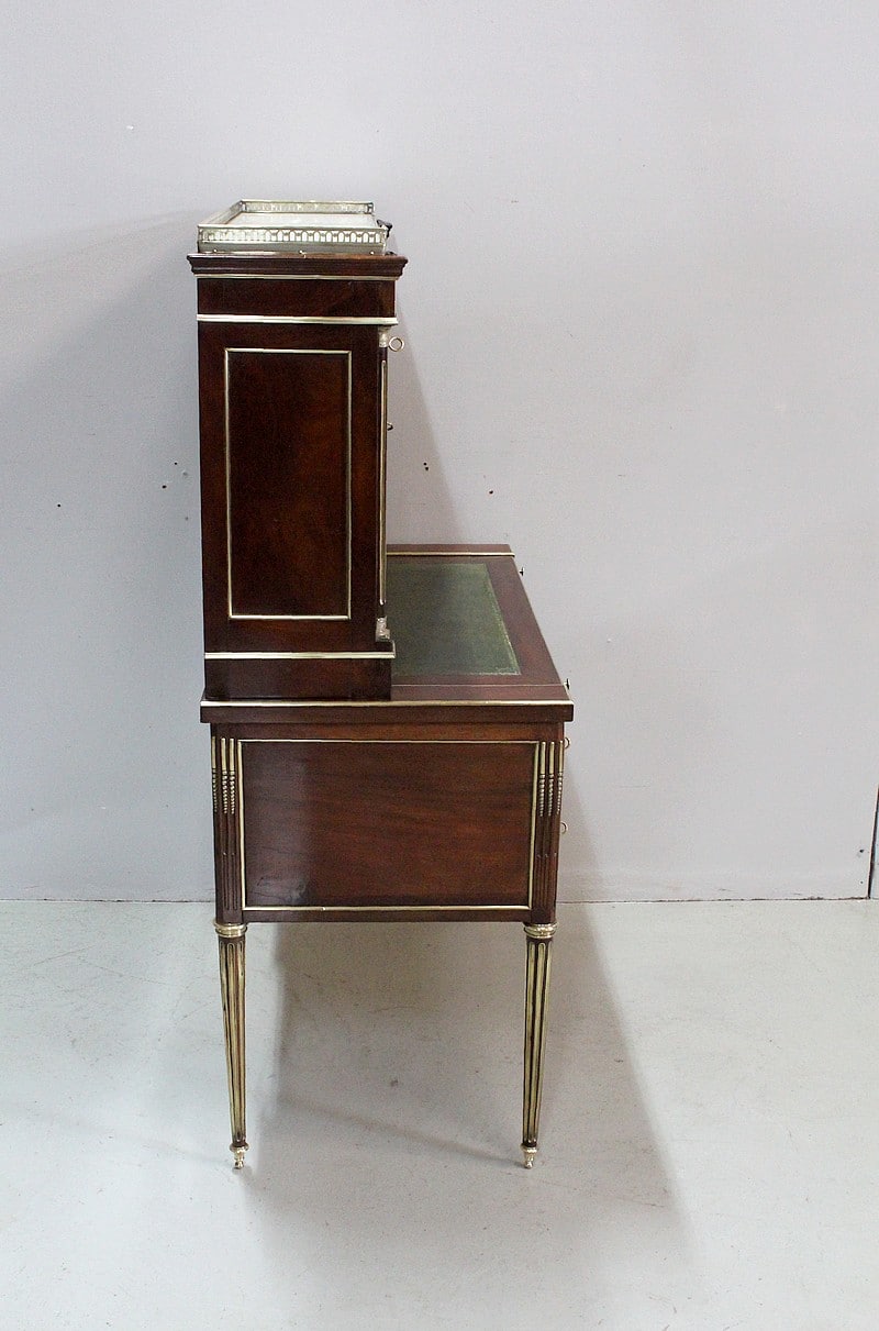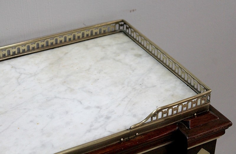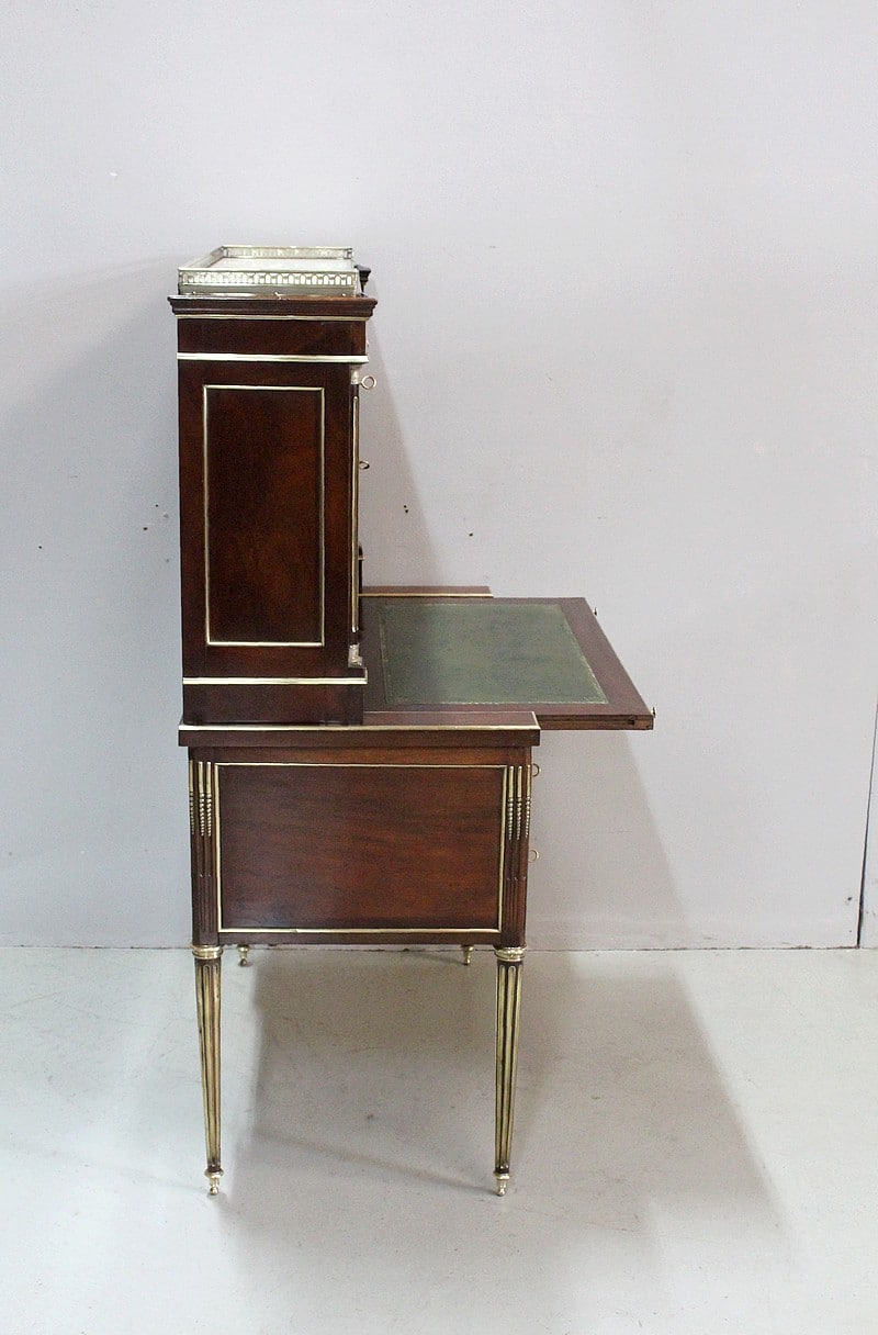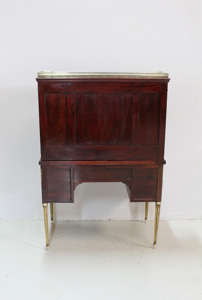 Petit bonheur du jour de style Louis XVI, de fabrication Parisienne, en Acajou massif et placage d’Acajou. Son dessus en marbre blanc de Carrare est ceinturé d’une galerie de laiton ajourée.