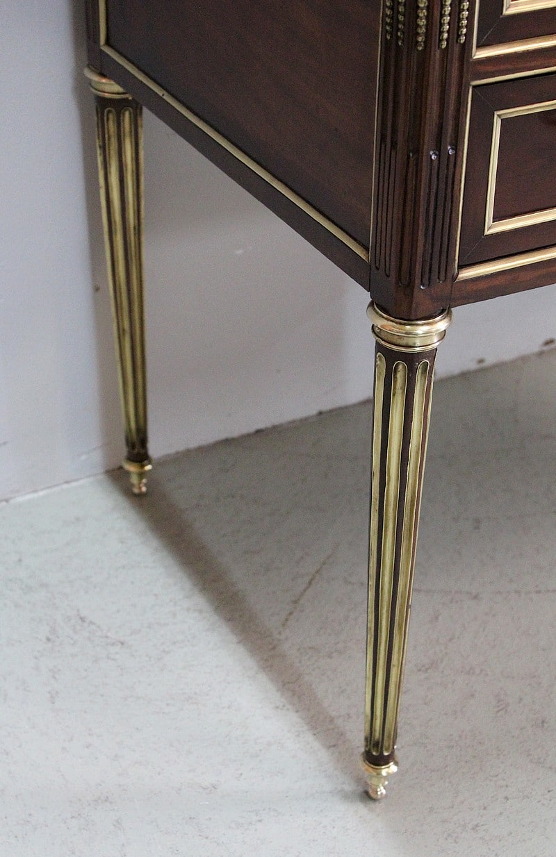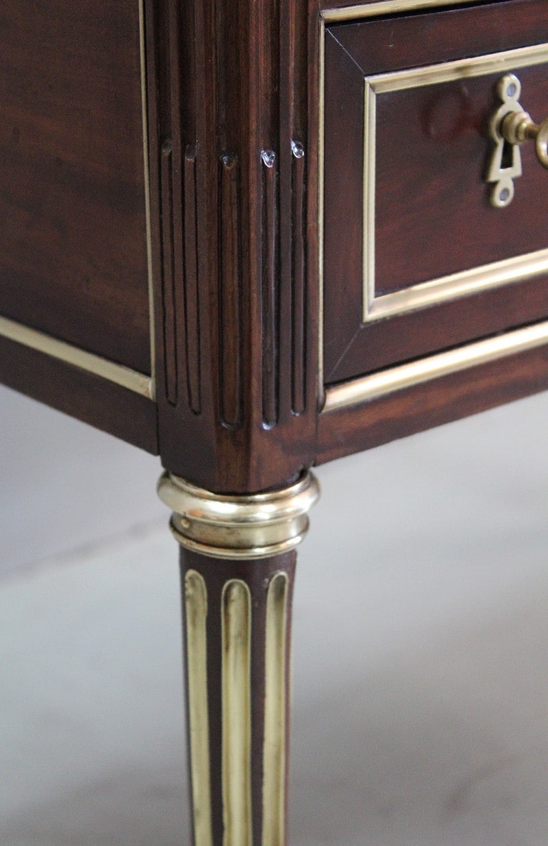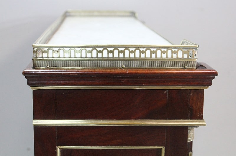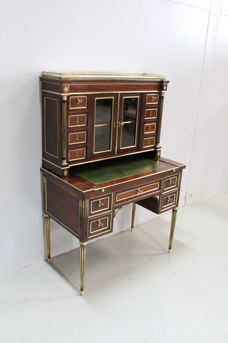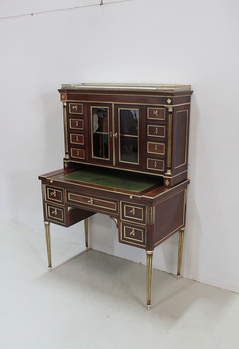Petit bonheur du jour de style Louis XVI, de fabrication Parisienne, en Acajou massif et placage d’Acajou. Son dessus en marbre blanc de Carrare est ceinturé d’une galerie de laiton ajourée.