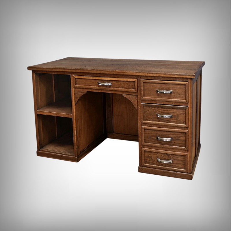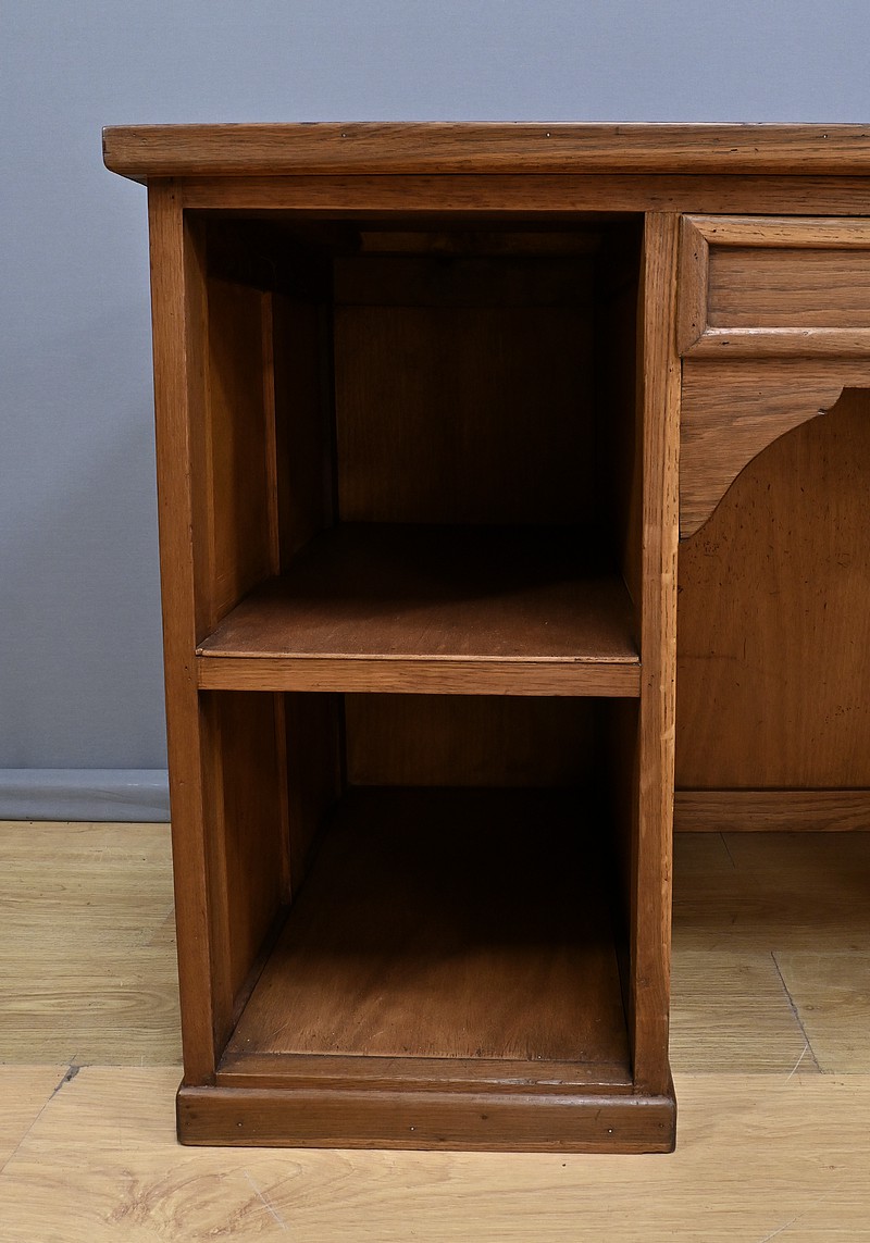 Le bureau présente un espace ouvert au centre pour les jambes, rendant son utilisation confortable.
