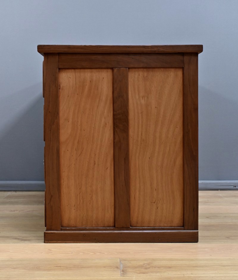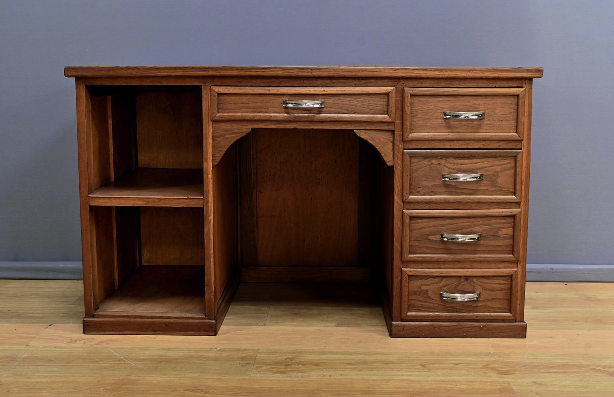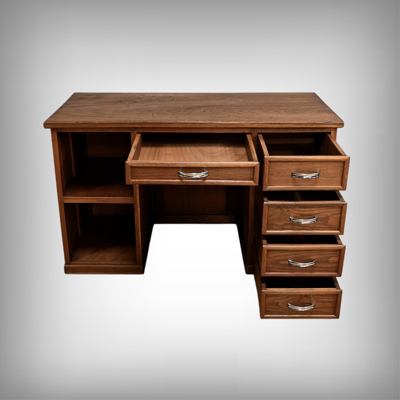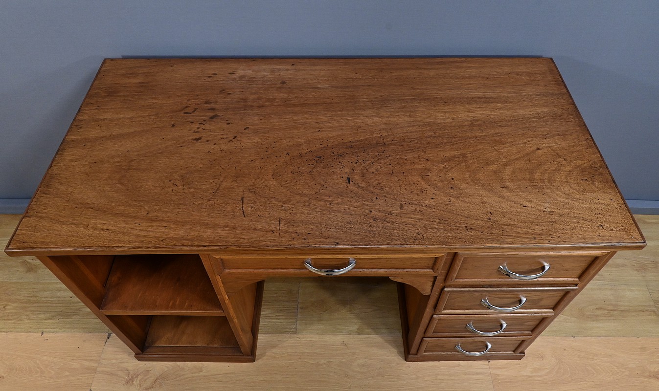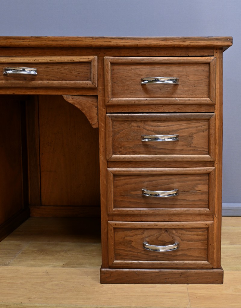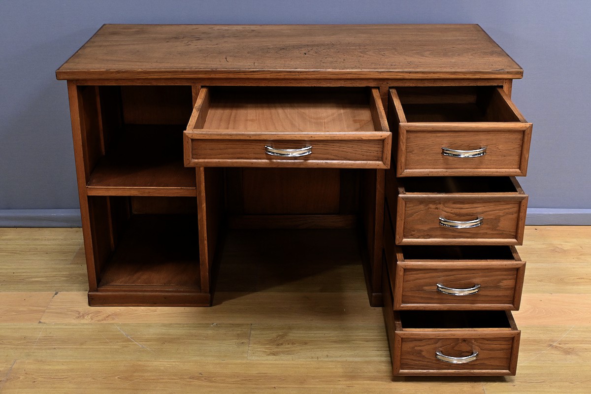 Ce petit bureau toutes faces d’époque Art Déco comporte un tiroir central avec une poignée de tirage en métal chromé, ainsi que quatre tiroirs supplémentaires sur le côté droit, équipés de poignées identiques.