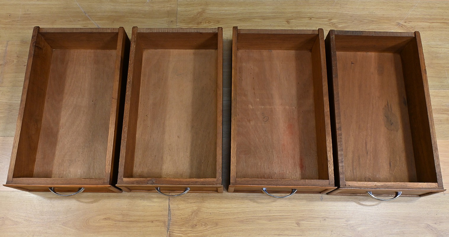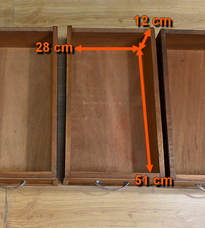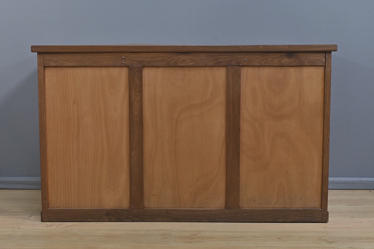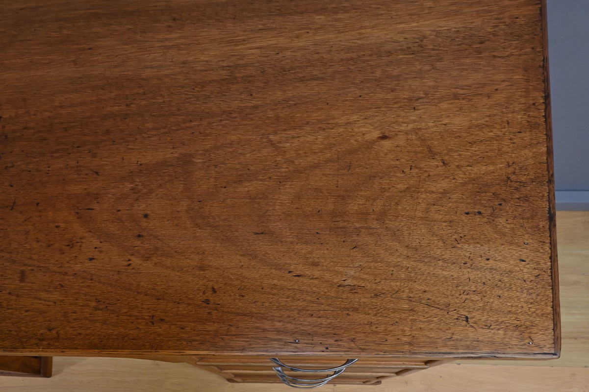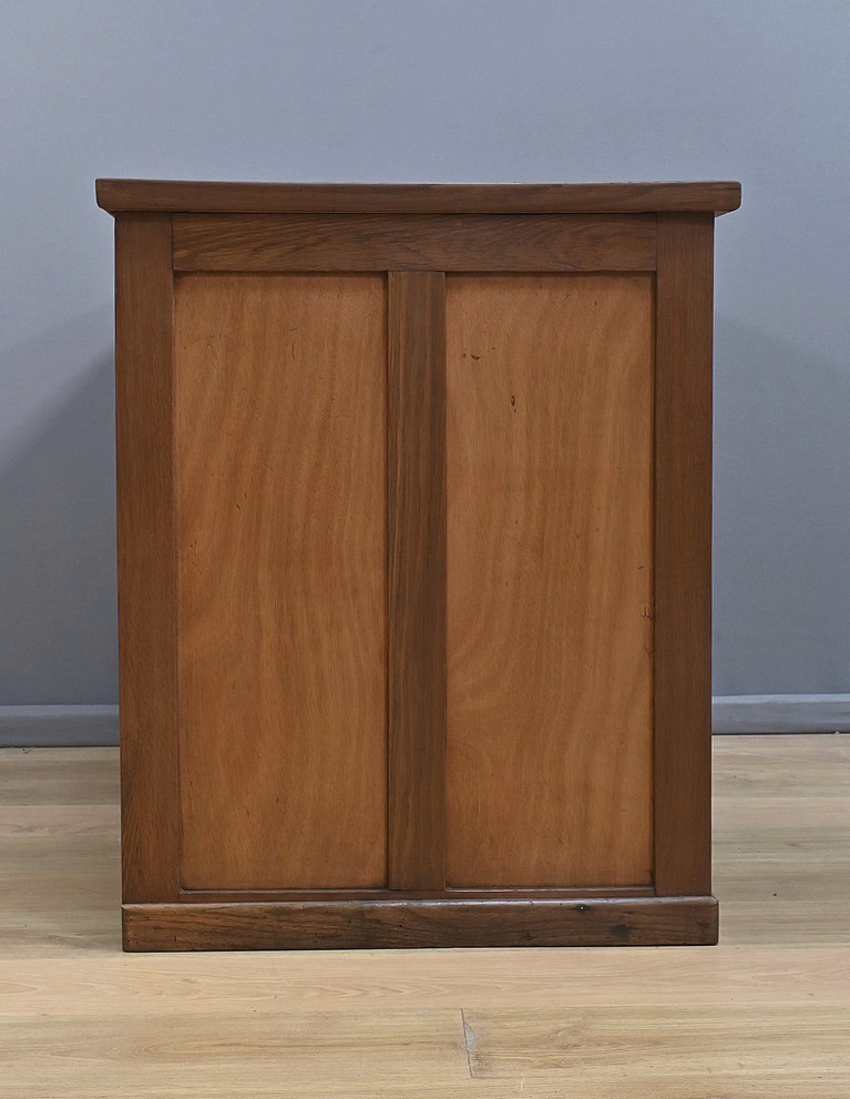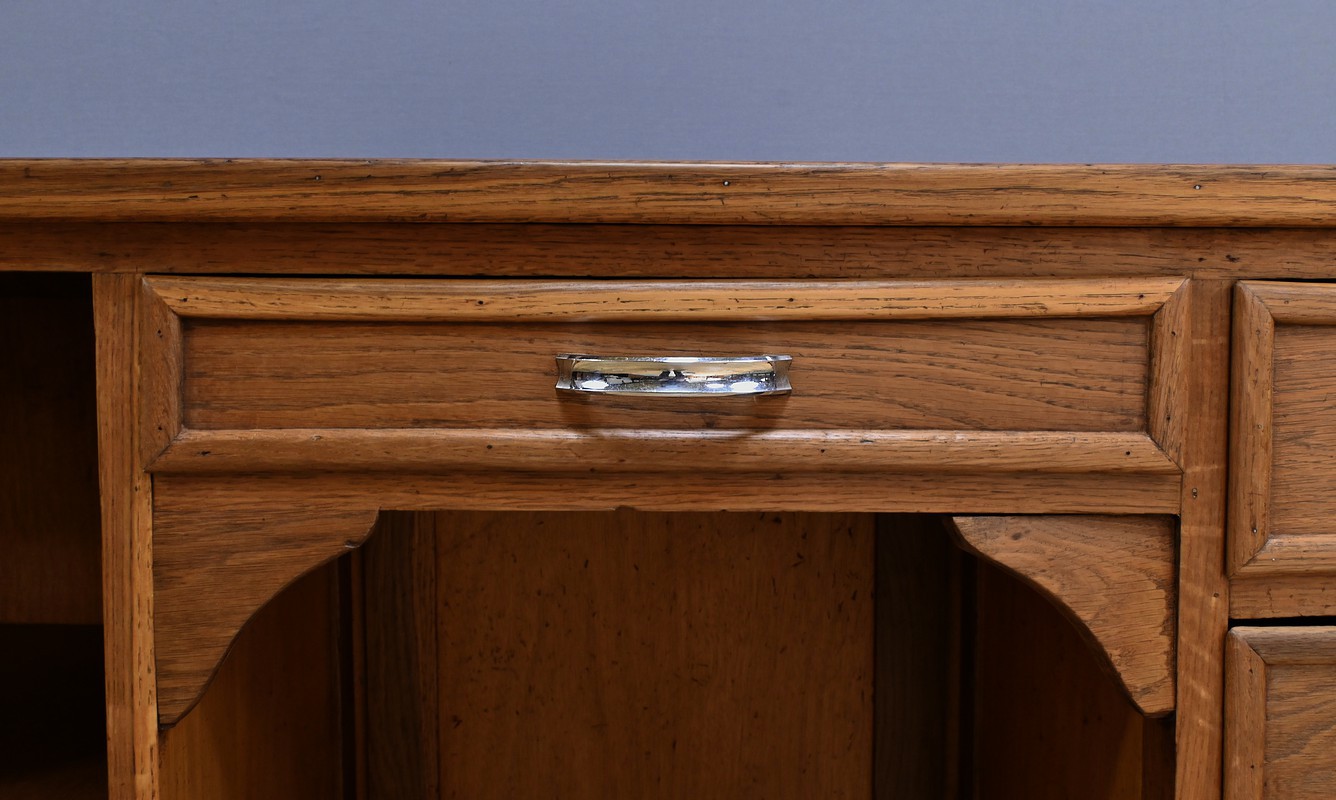 Ce petit bureau toutes faces d’époque Art Déco comporte un tiroir central avec une poignée de tirage en métal chromé, ainsi que quatre tiroirs supplémentaires sur le côté droit, équipés de poignées identiques.