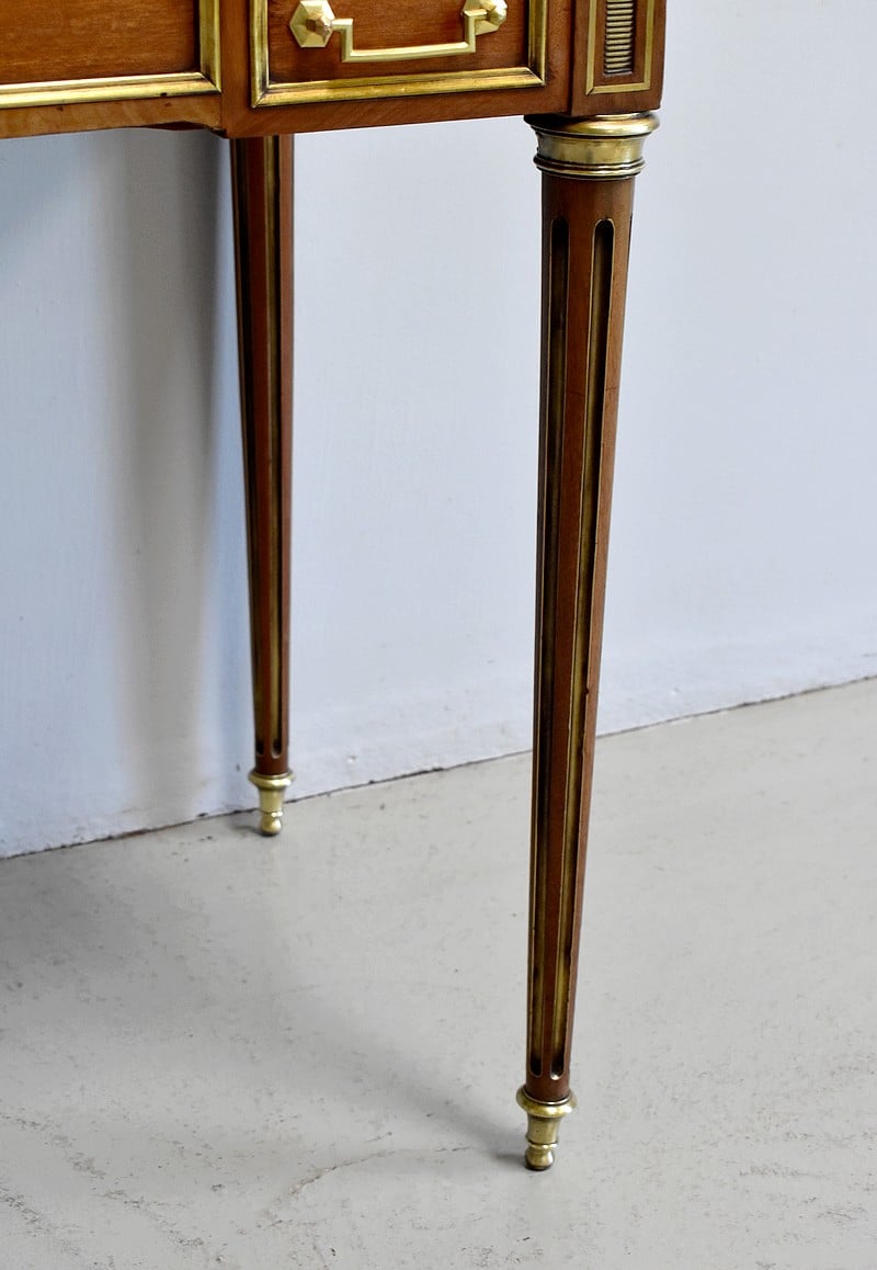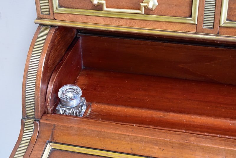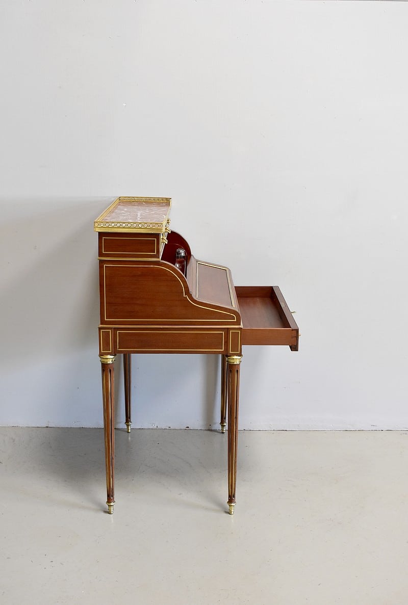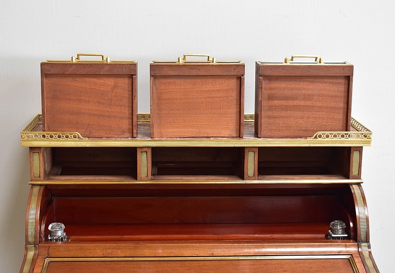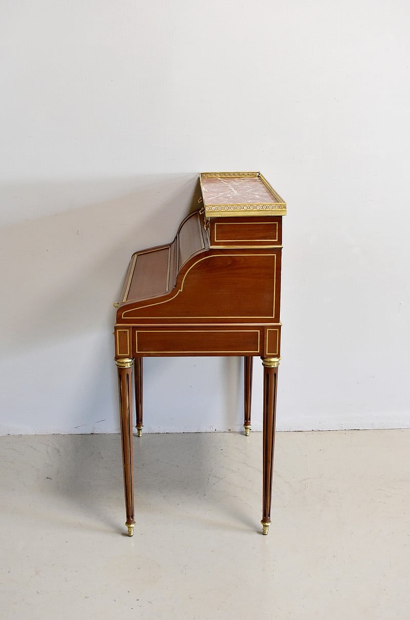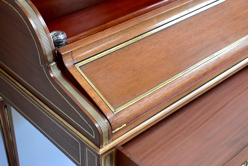 Petit bureau à cylindre et mécanisme de style Louis XVI, en Acajou et placage d’Acajou avec incrustations de filets, baguettes et quarts de rond de laiton.