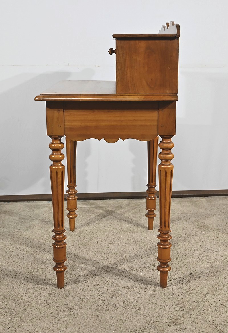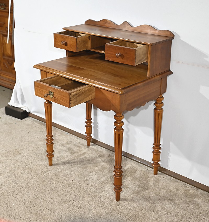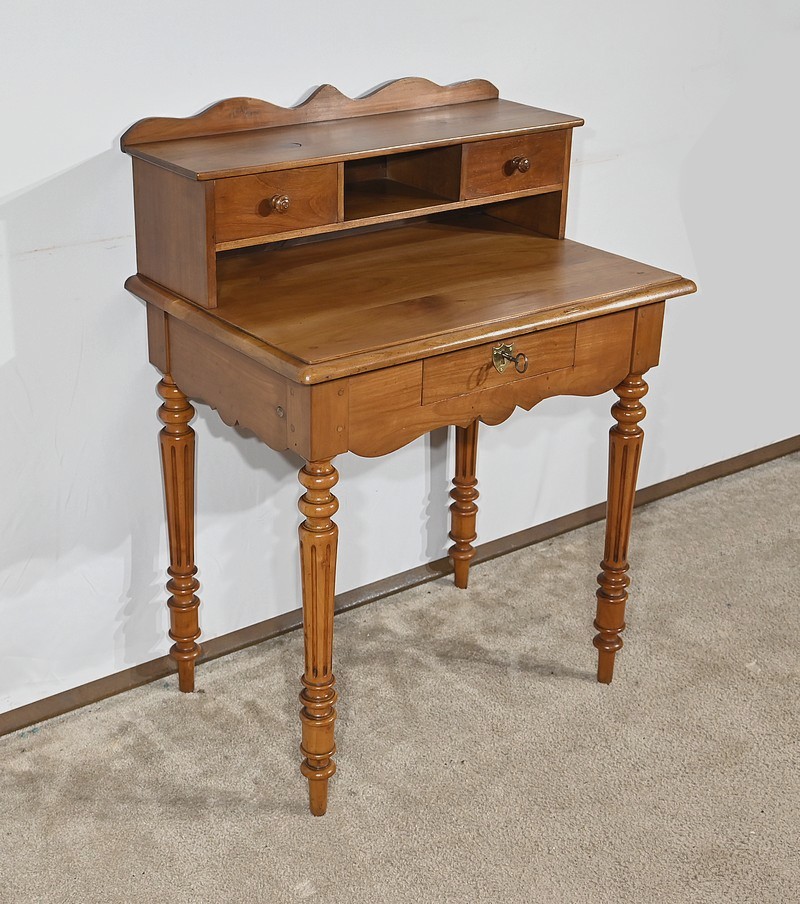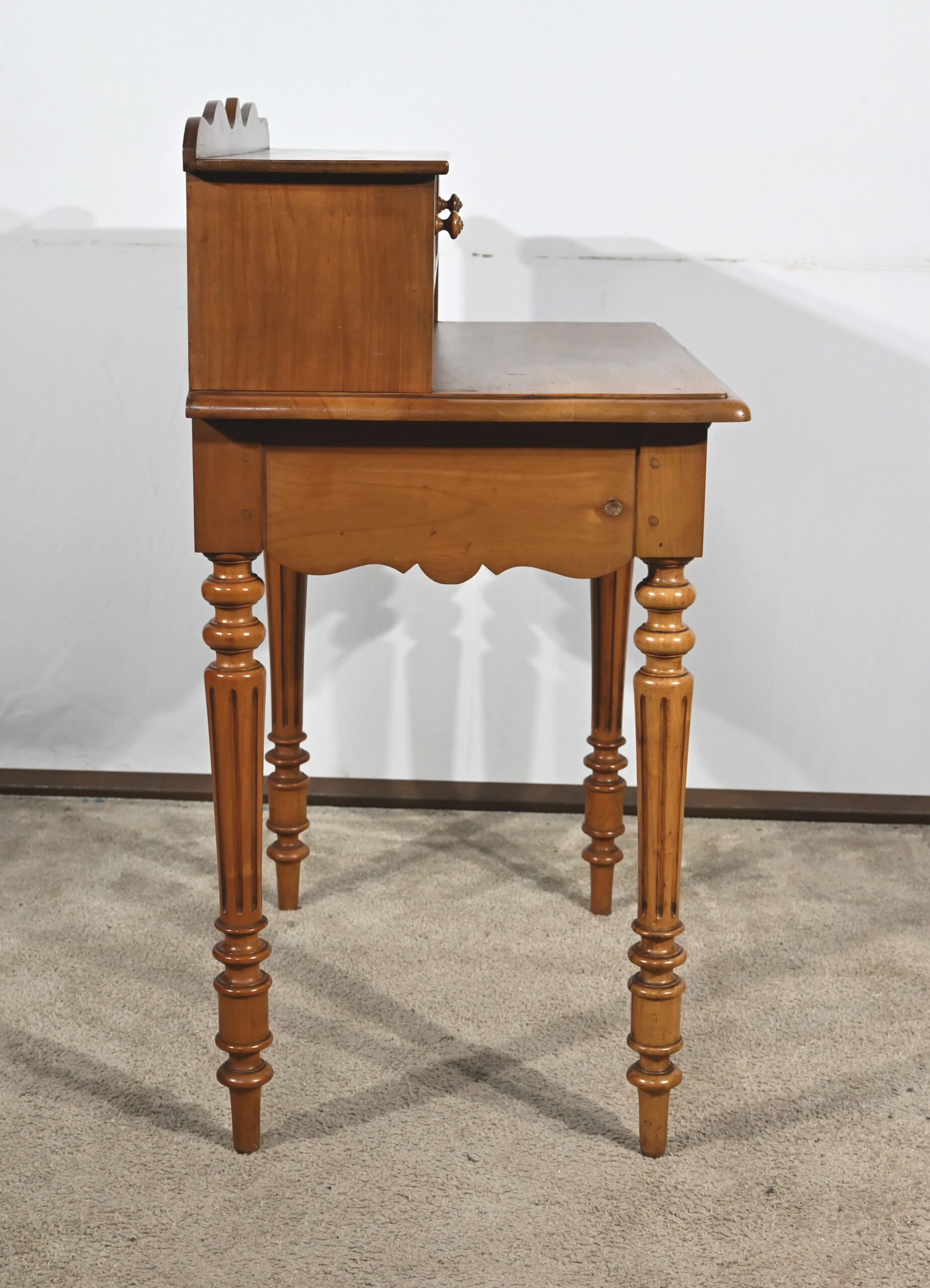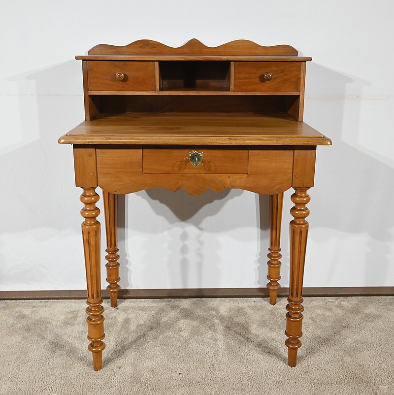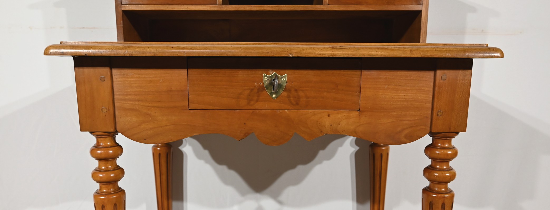 Bureau en merisier blond massif doté d’une ceinture découpée avec un tiroir central muni d’une clé et d’une serrure d’origine. Ce meuble repose sur quatre pieds tournés avec cannelures arrêtées. Le dessus présente un bec de corbin en son pourtour. La partie gradin, qui est démontable, est composée de deux tiroirs avec bouton bois, d’une niche et d’un large espace de rangement. Enfin, au sommet, ce mobilier possède un fronton légèrement découpé rappelant les traverses.