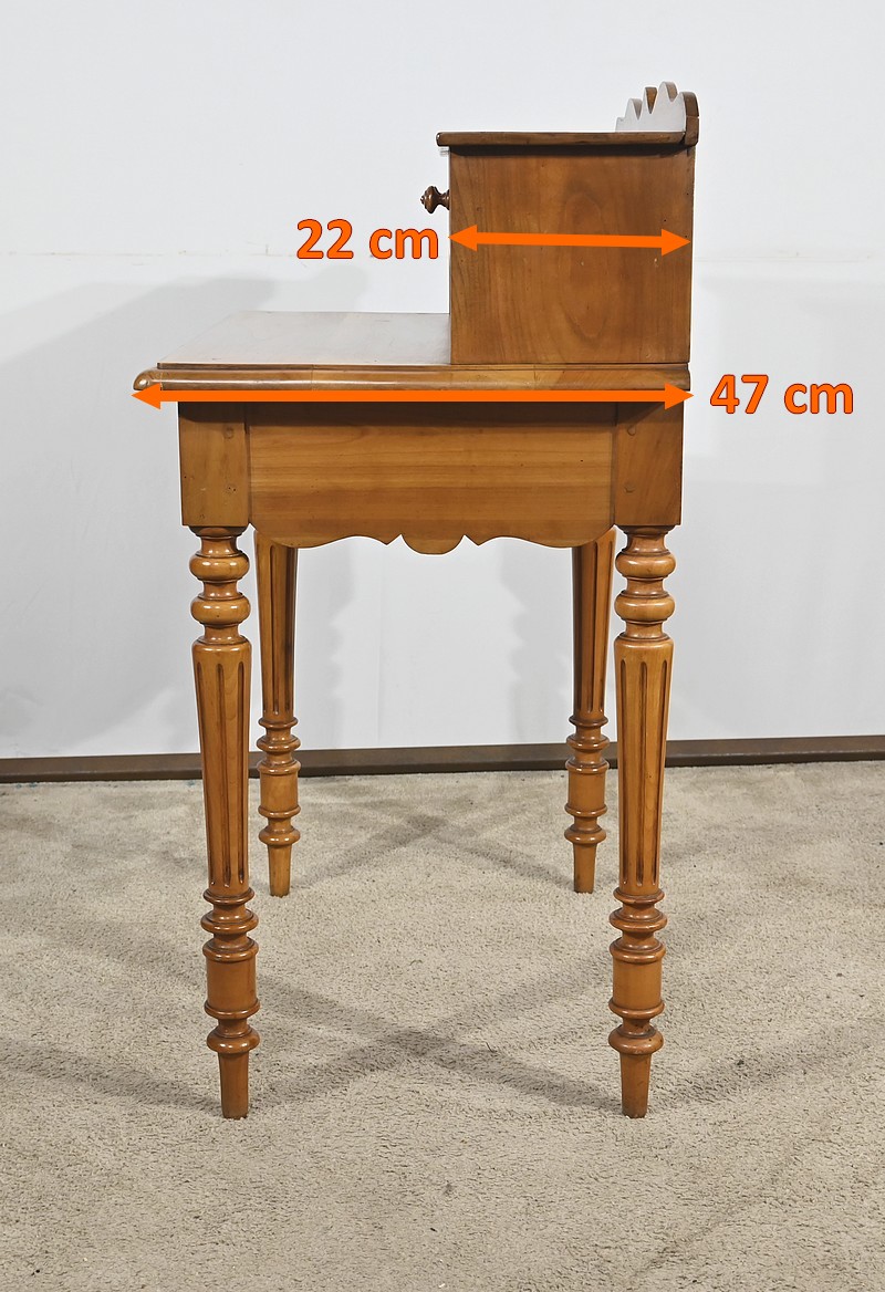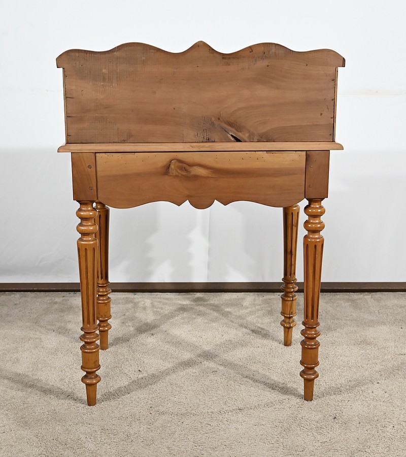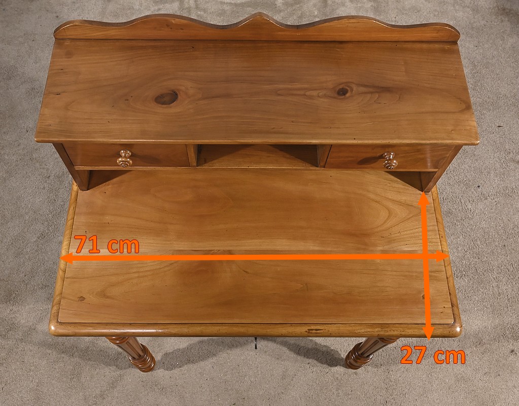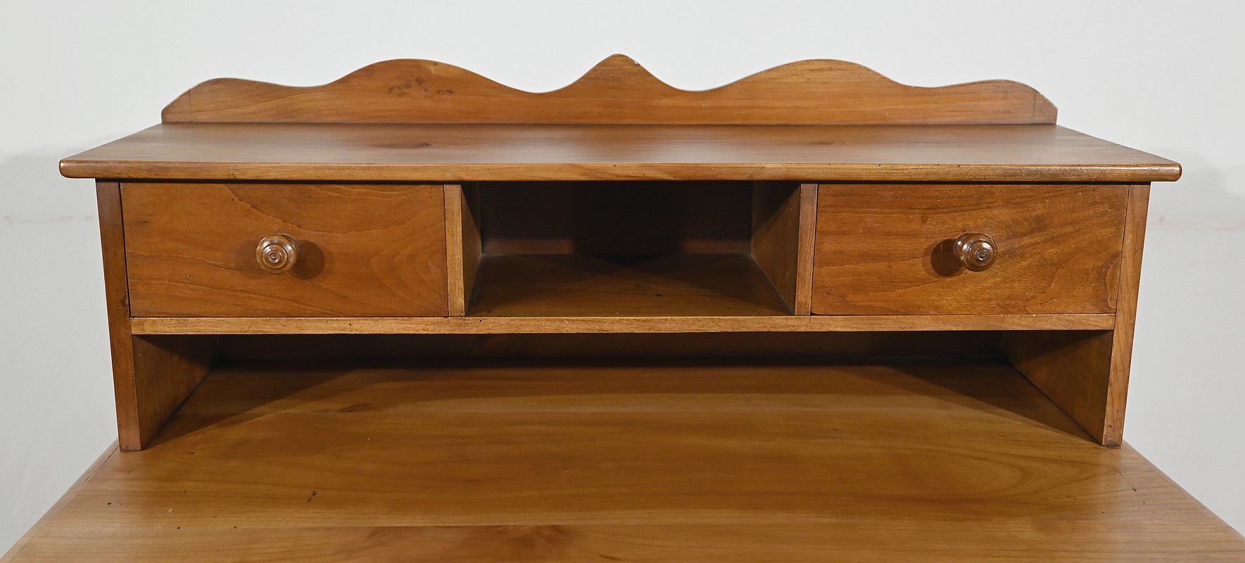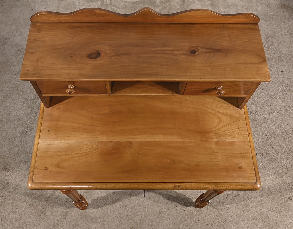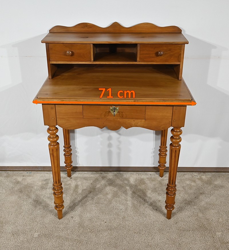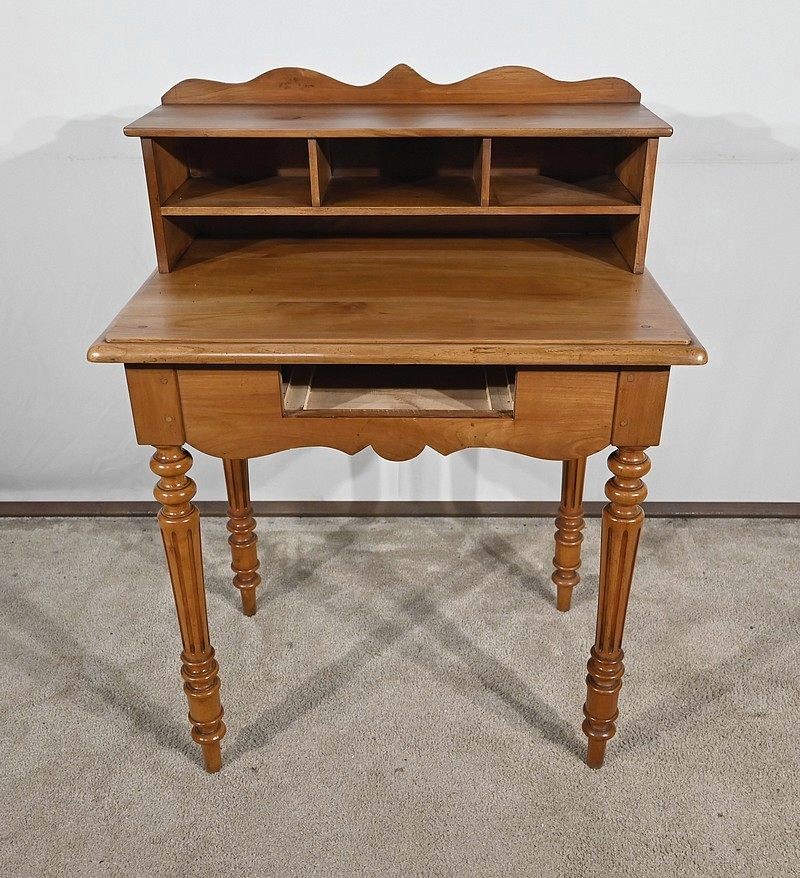 Bureau en merisier blond massif doté d’une ceinture découpée avec un tiroir central muni d’une clé et d’une serrure d’origine. Ce meuble repose sur quatre pieds tournés avec cannelures arrêtées. Le dessus présente un bec de corbin en son pourtour. La partie gradin, qui est démontable, est composée de deux tiroirs avec bouton bois, d’une niche et d’un large espace de rangement. Enfin, au sommet, ce mobilier possède un fronton légèrement découpé rappelant les traverses.