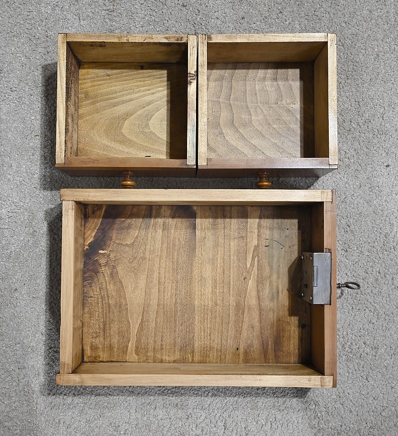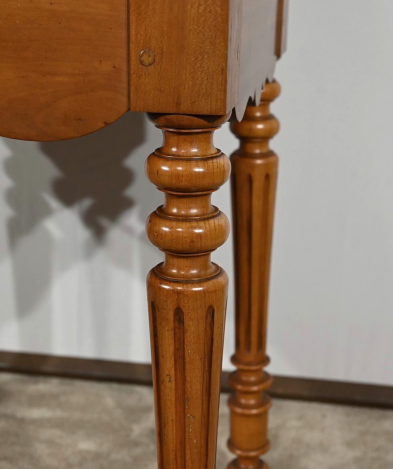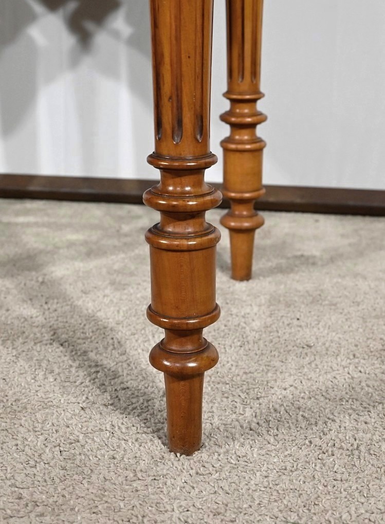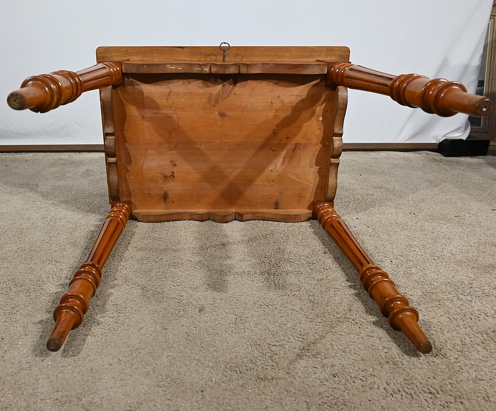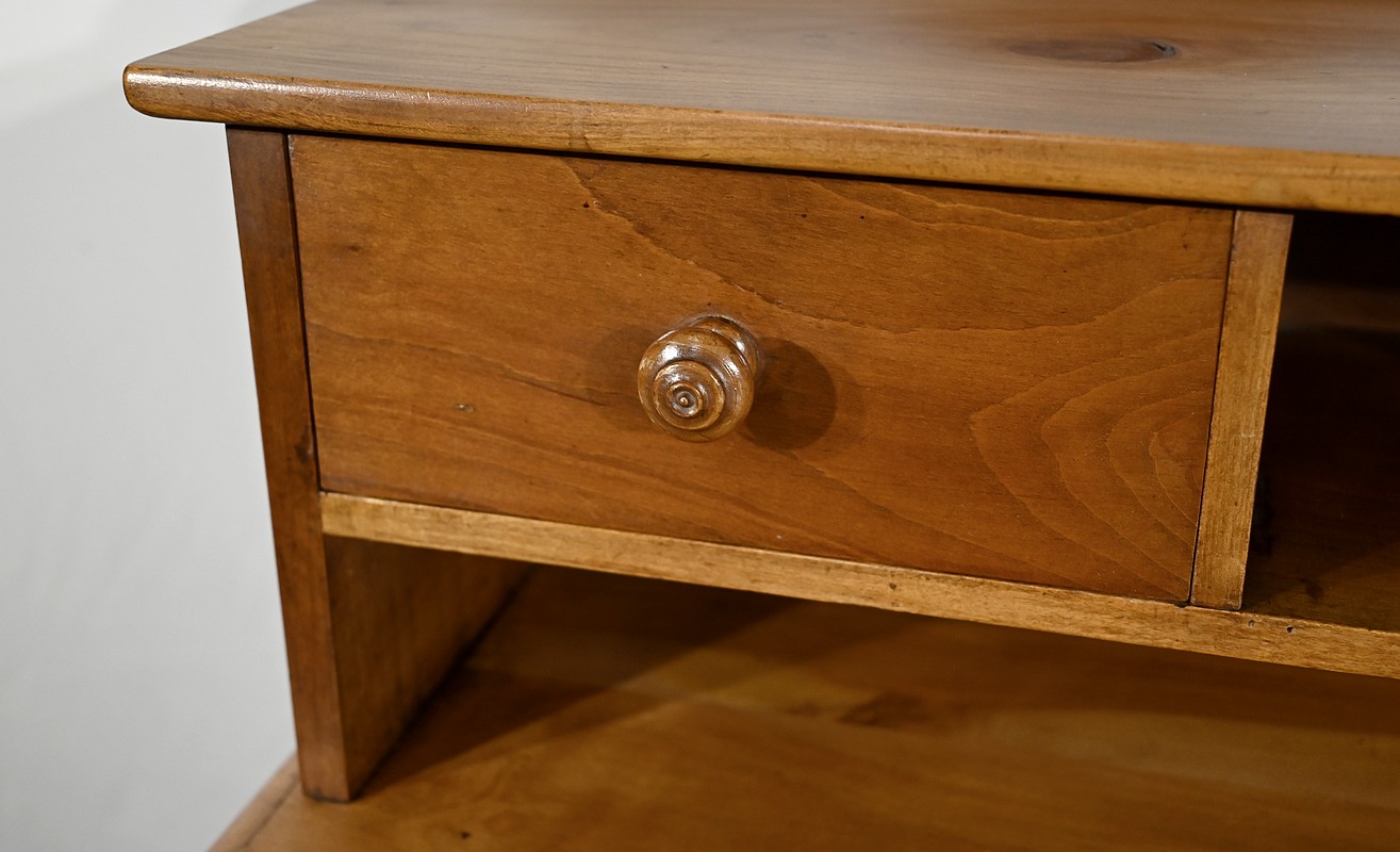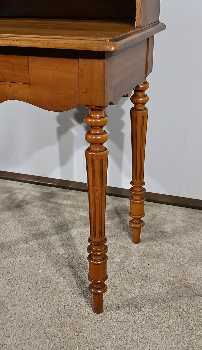 Bureau en merisier blond massif doté d’une ceinture découpée avec un tiroir central muni d’une clé et d’une serrure d’origine. Ce meuble repose sur quatre pieds tournés avec cannelures arrêtées. Le dessus présente un bec de corbin en son pourtour. La partie gradin, qui est démontable, est composée de deux tiroirs avec bouton bois, d’une niche et d’un large espace de rangement. Enfin, au sommet, ce mobilier possède un fronton légèrement découpé rappelant les traverses.