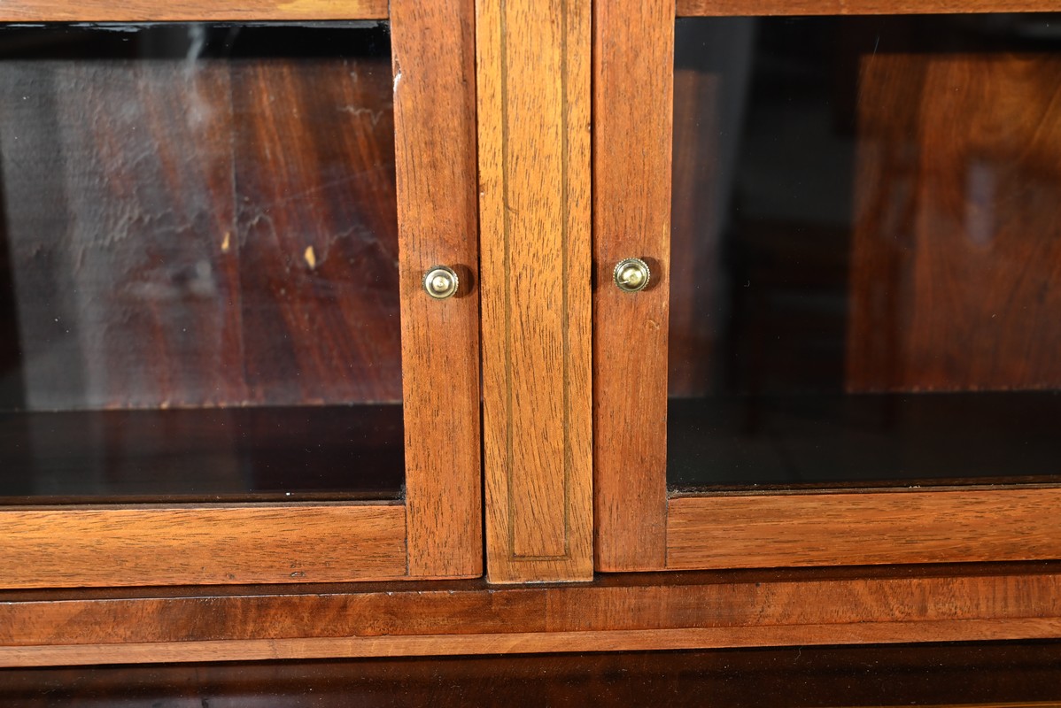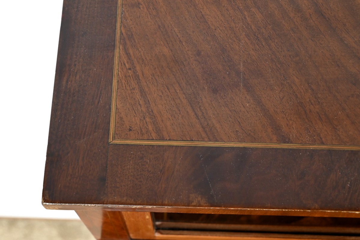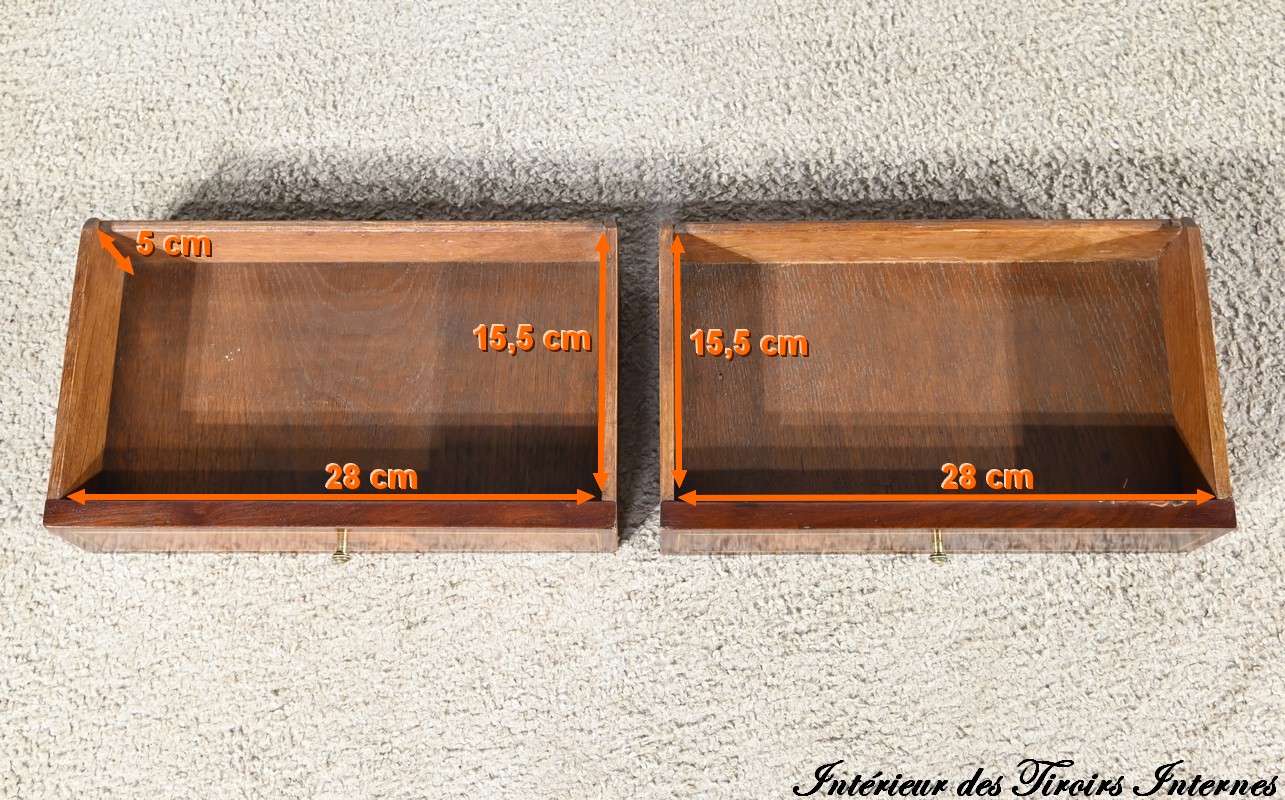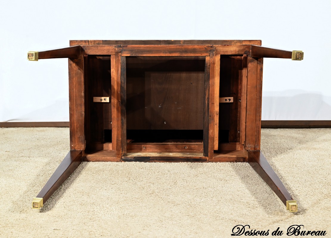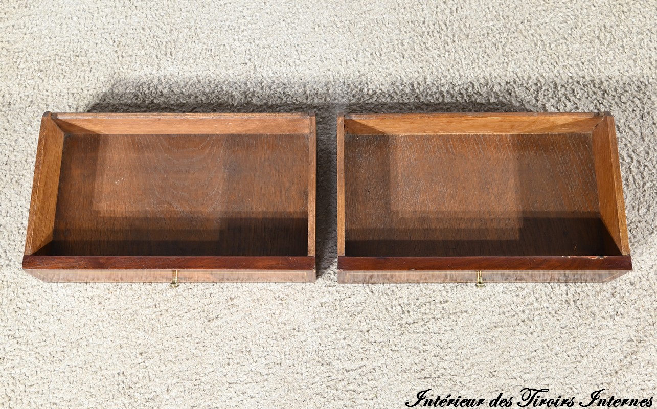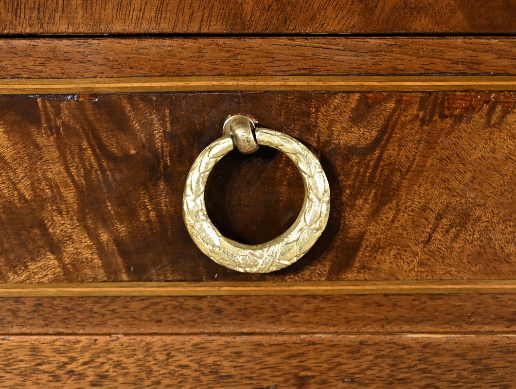 Ces derniers, en placage de ronce d’acajou avec filets de citronnier, sont agrémentés de poignées anneaux en bronze.