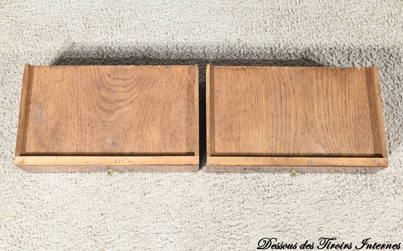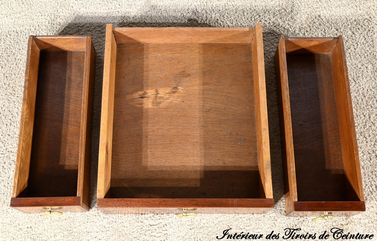 Ce meuble présente également en ceinture une seconde série de tiroirs, soit deux petits et un grand.