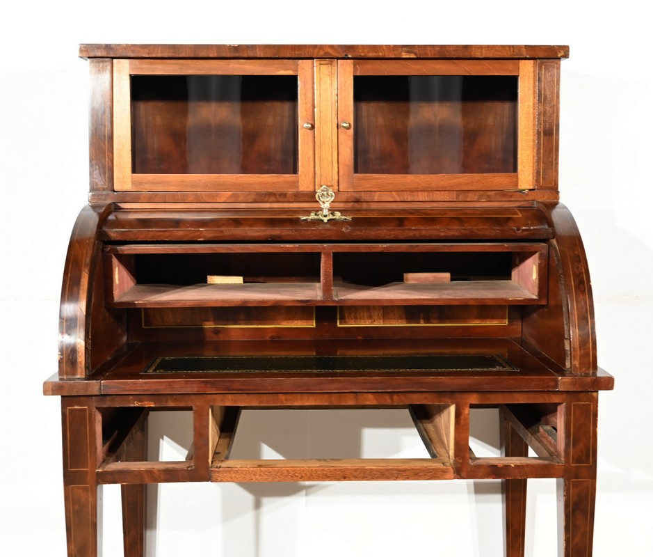 Le cylindre, foncé d’un panneau en ronce d’acajou souligné de filets de citronnier, est équipé d’une serrure fonctionnelle d’origine avec clé et entrée enrubannée en laiton.