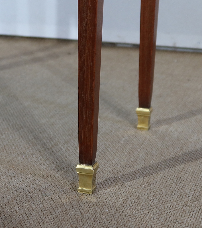 L’ensemble repose sur quatre pieds gaine en acajou massif soulignés en partie haute par un carré mouluré en laiton et se terminent par des sabots laitons.