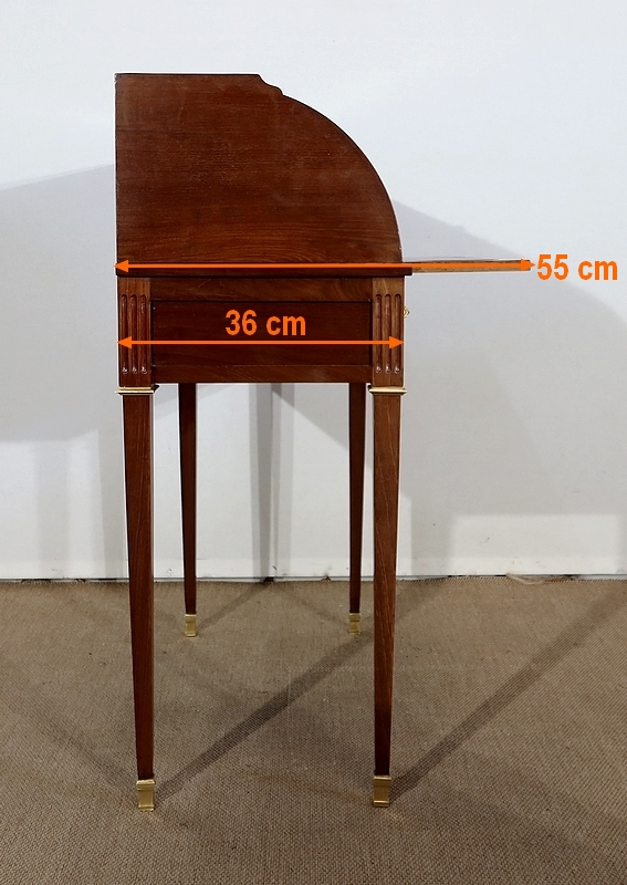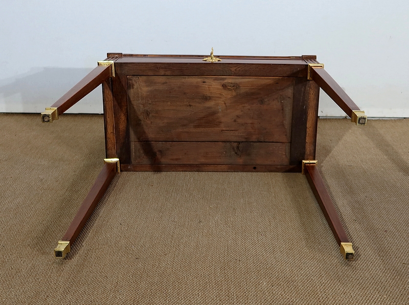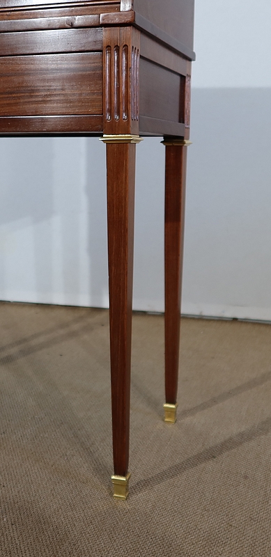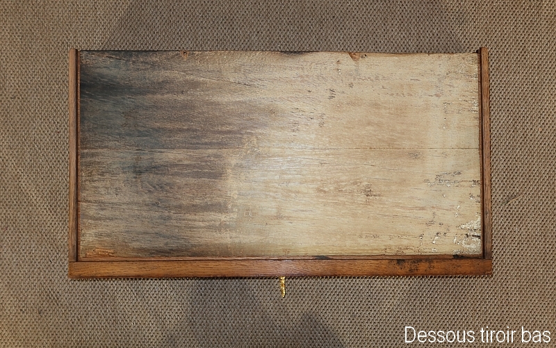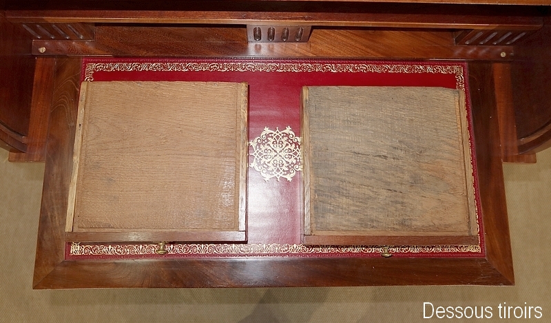 Ce bureau est muni en ceinture d’un tiroir s’ouvrant à l’aide d’une clé avec sa serrure d’origine en état de fonctionnement et son entrée en bronze. Aux angles, au dessus des pieds nous remarquons trois cannelures sur la façade et les côtés.