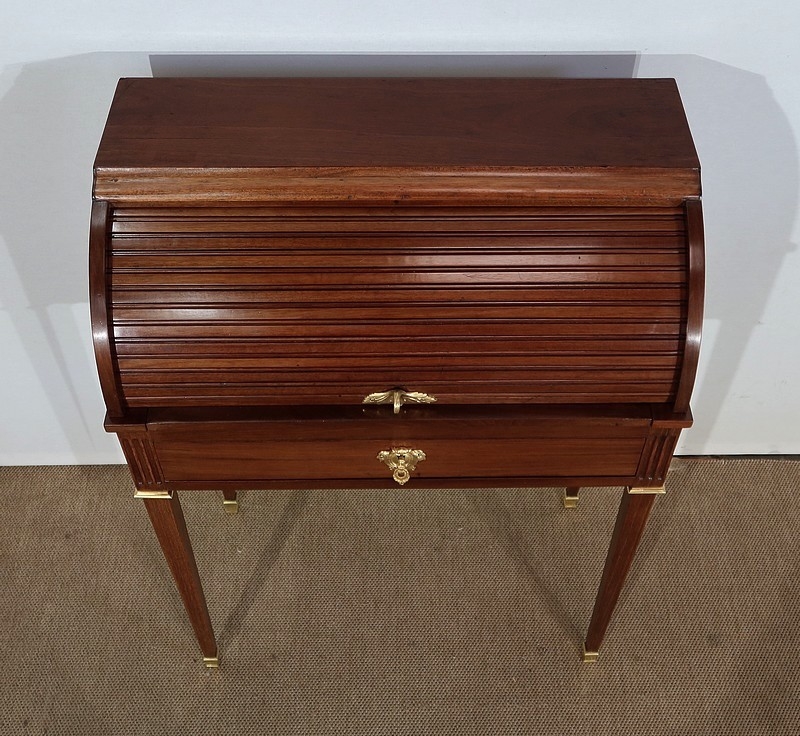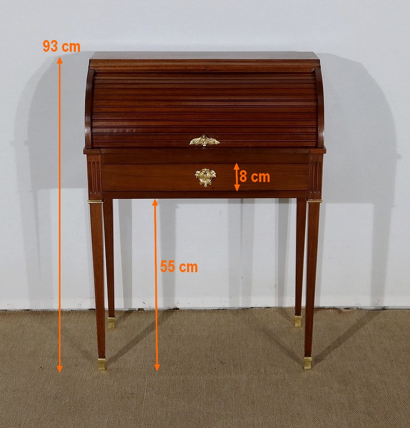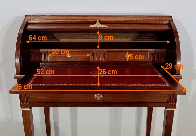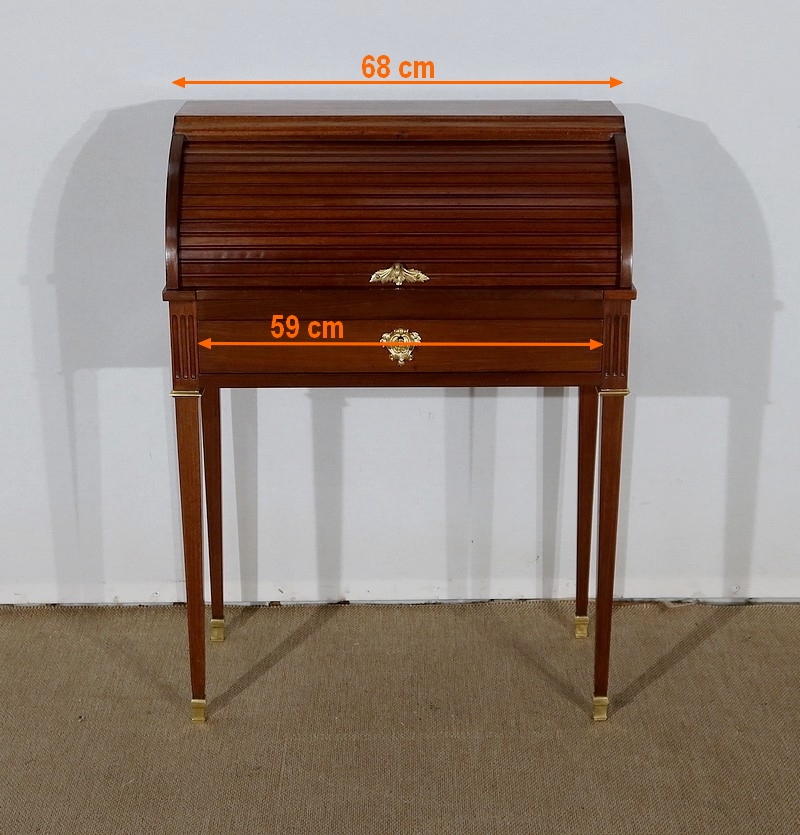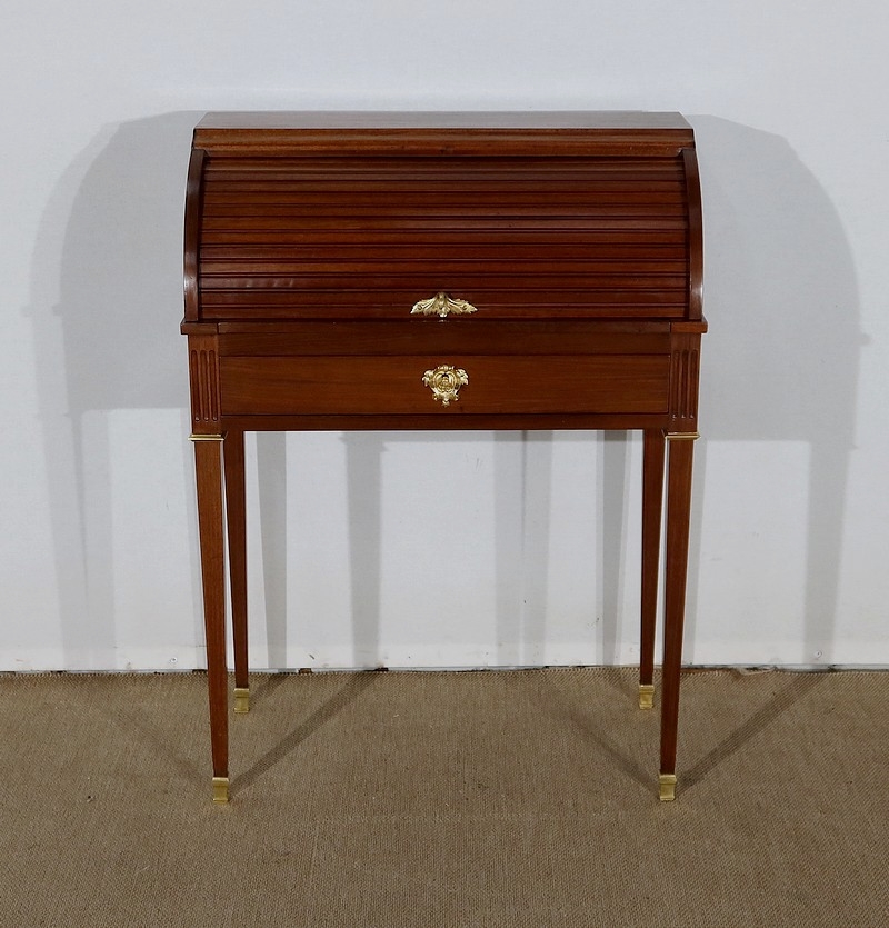 Ce petit bureau en acajou massif et placage d’acajou comporte une partie cylindre composée de lamelles d’acajou massif moulurées, coulissant vers le haut à l’aide d’une poignée à doigt en laiton en forme de feuillage. Le dessus en acajou massif bénéficie sur le devant d’une importante moulure à doucine dont la forme annonce et profile la partie cylindre.