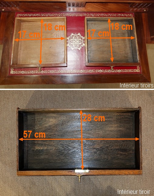 Ce petit bureau d’époque Restauration vous ravira par ses dimensions idéales, la beauté de son bois, son ingéniosité et son cuir magnifique.