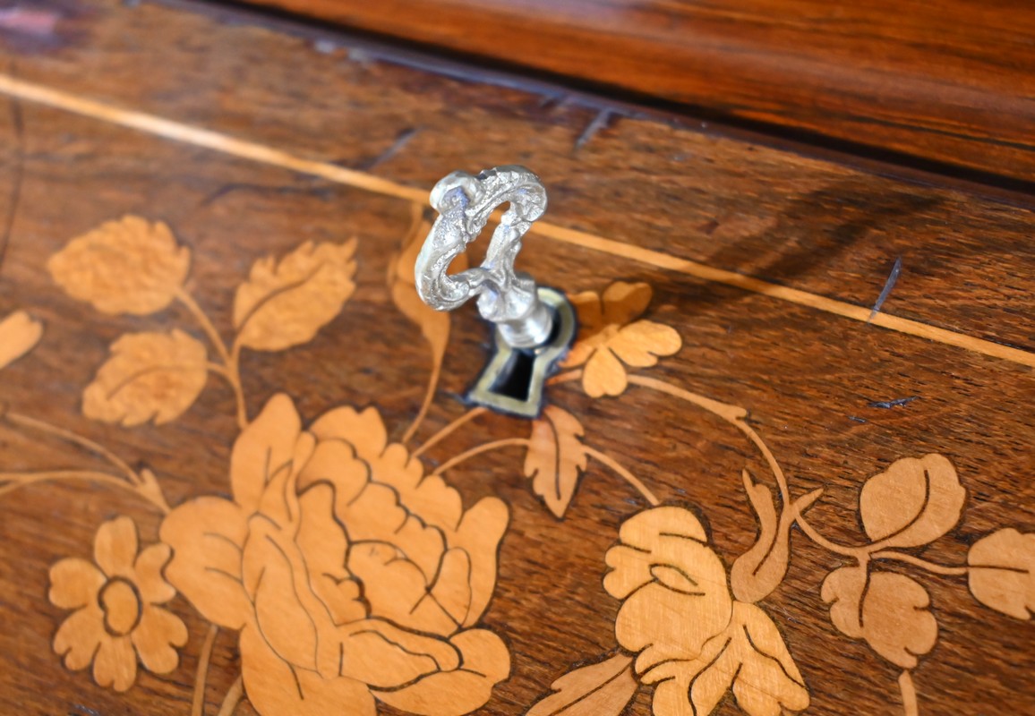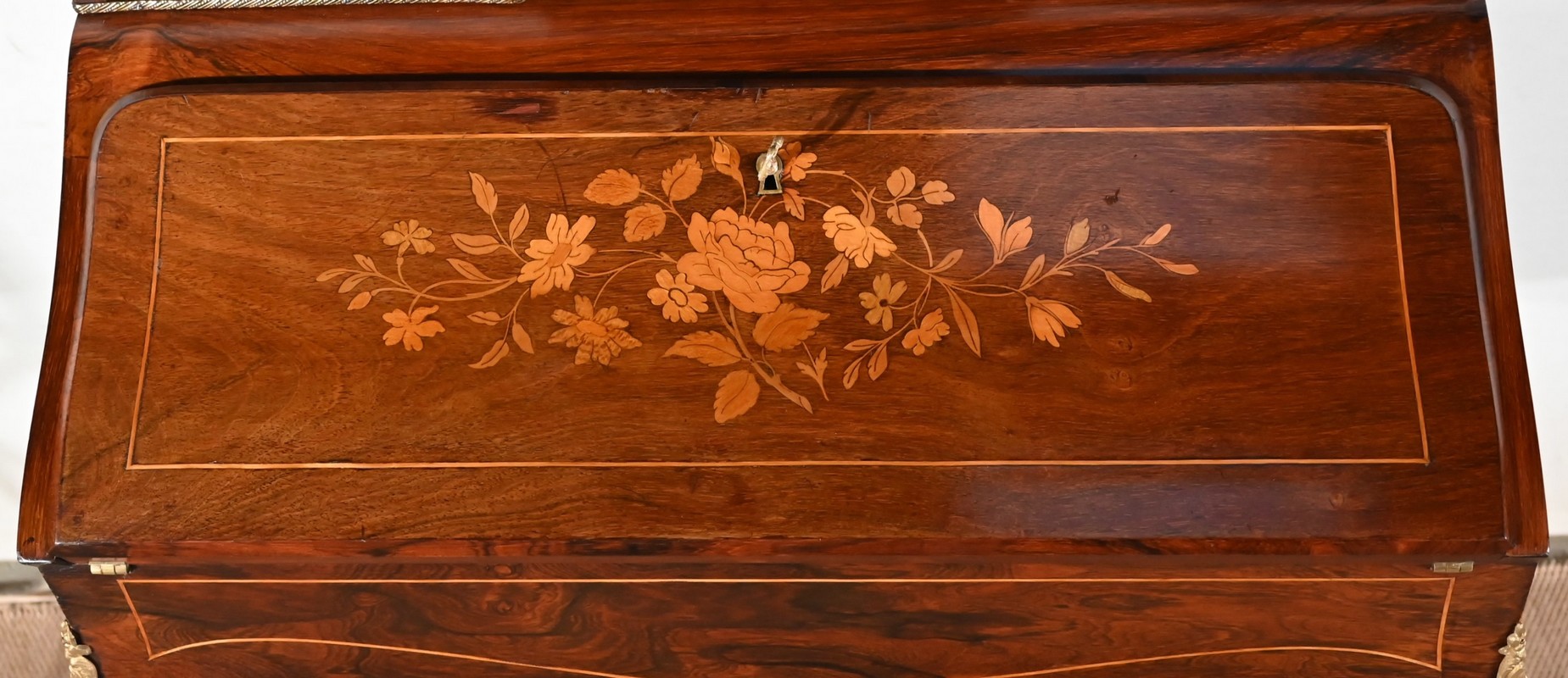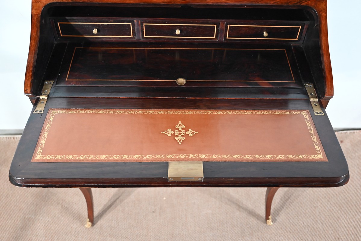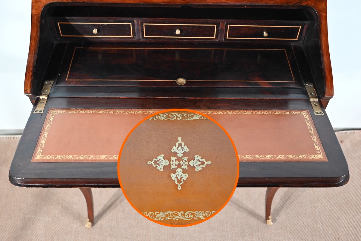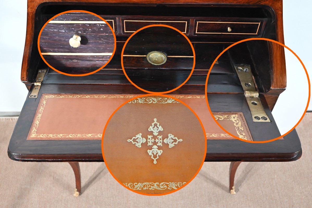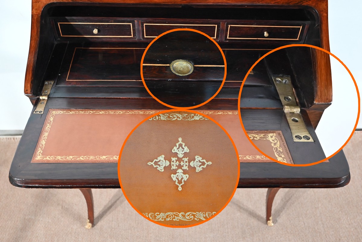 Ce bureau présente un abattant concave, en placage de palissandre, garni d’une composition de fleurs, en bois clair, entourée d’un filet de buis. Il est équipé d’une serrure d’origine fonctionnelle avec entrée laiton et clé postérieure. La partie écritoire est foncée d’un cuir cacao actuel à motif central et vignette dorée. Cet abattant, monté sur pommelles à queues d’aronde, est légèrement relevé. L’intérieur propose trois tiroirs identiques en palissandre et filets de buis ainsi qu’une réserve accessible par une plaque coulissante à onglet laiton.