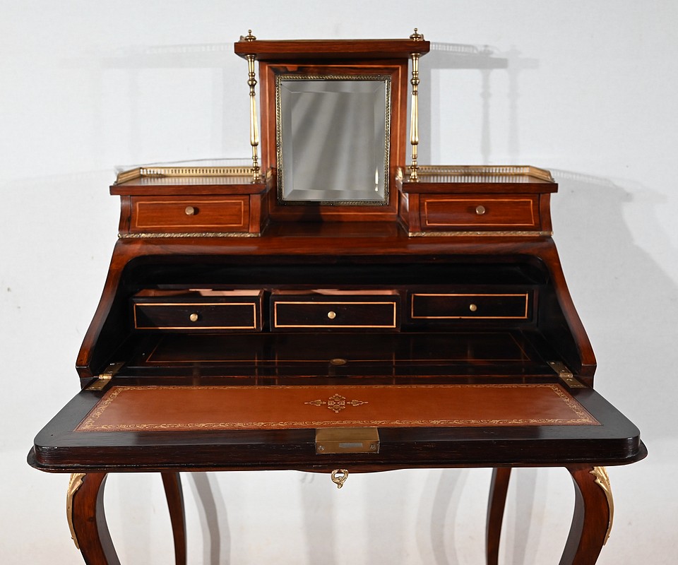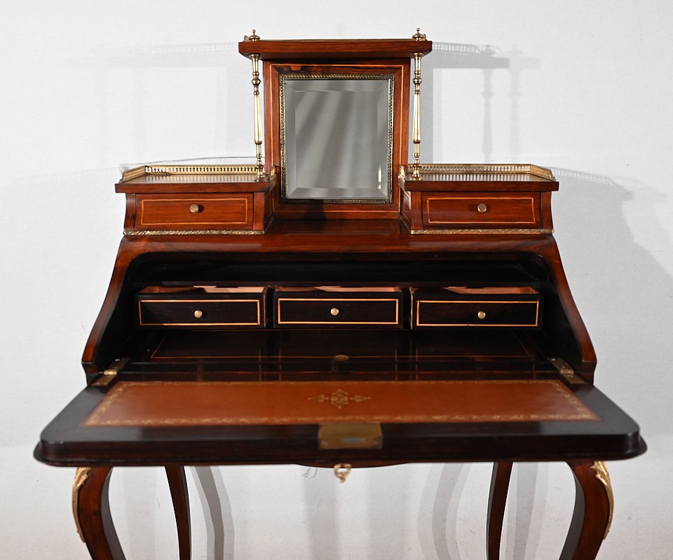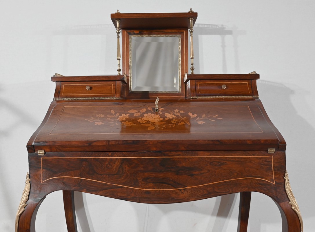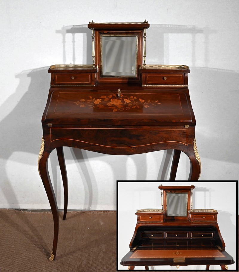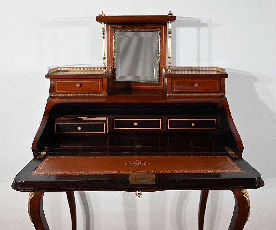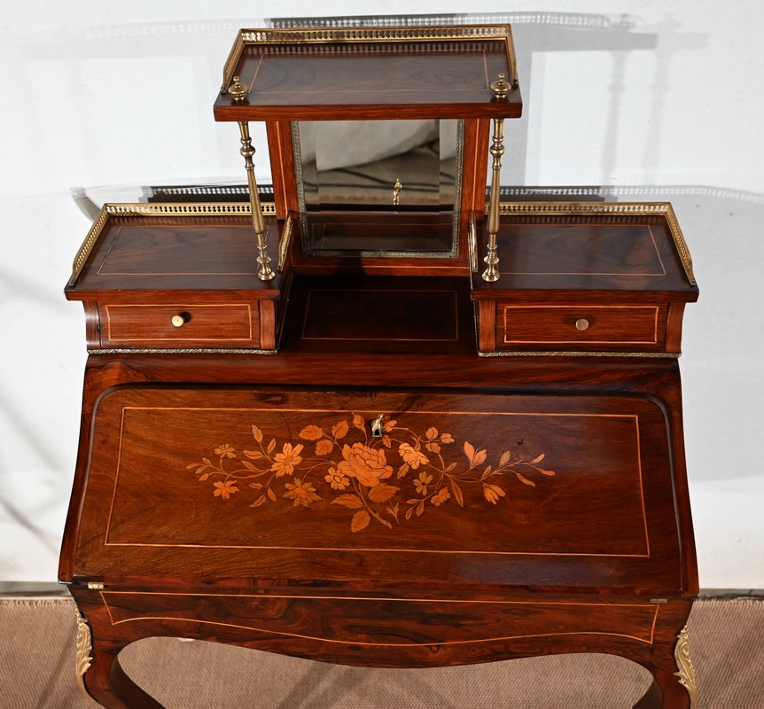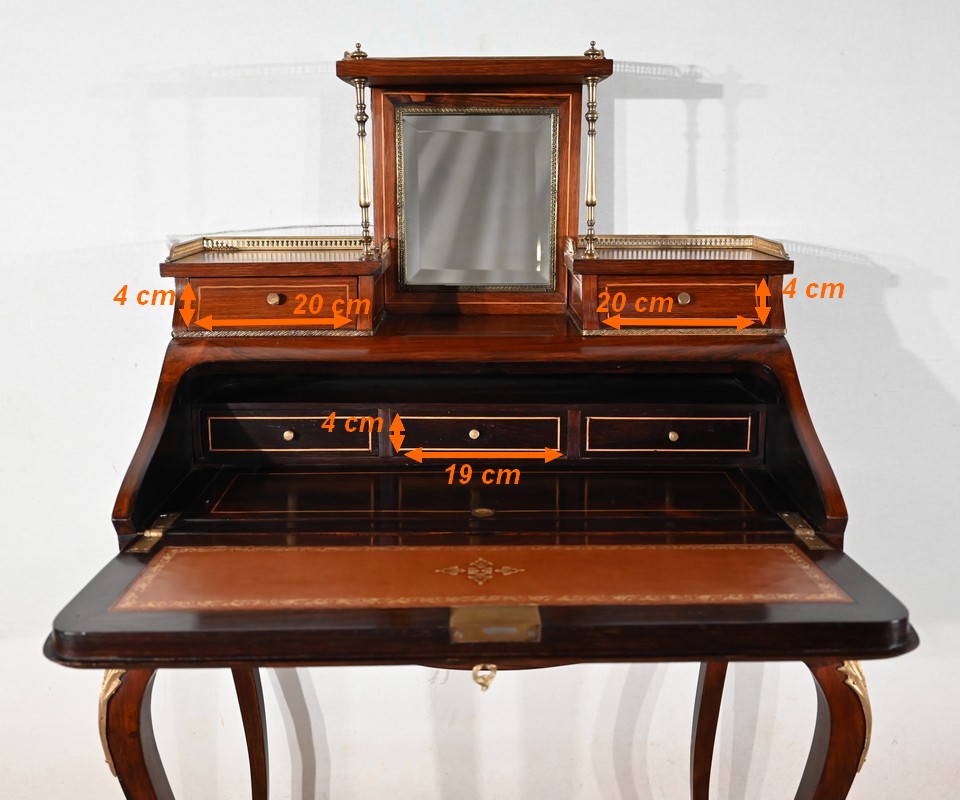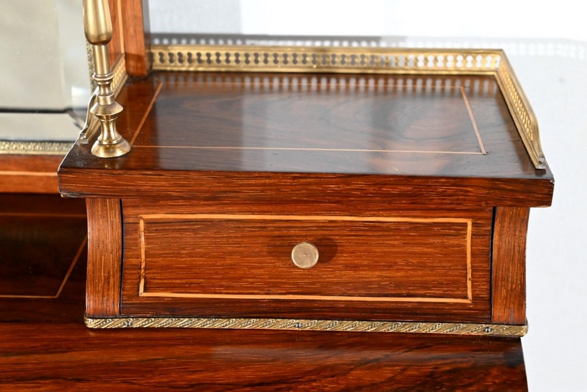Ce bureau présente un abattant concave, en placage de palissandre, garni d’une composition de fleurs, en bois clair, entourée d’un filet de buis. Il est équipé d’une serrure d’origine fonctionnelle avec entrée laiton et clé postérieure. La partie écritoire est foncée d’un cuir cacao actuel à motif central et vignette dorée. Cet abattant, monté sur pommelles à queues d’aronde, est légèrement relevé. L’intérieur propose trois tiroirs identiques en palissandre et filets de buis ainsi qu’une réserve accessible par une plaque coulissante à onglet laiton.