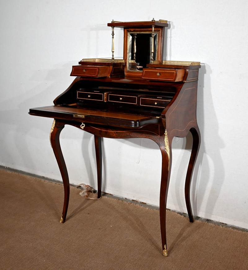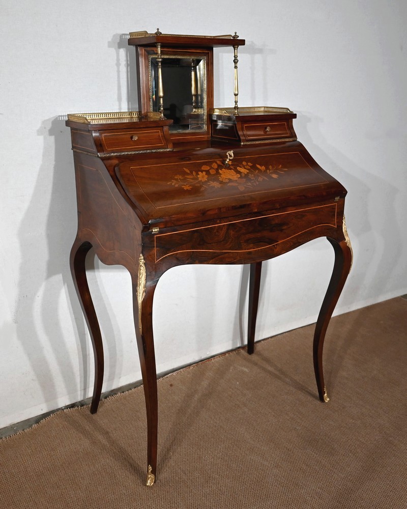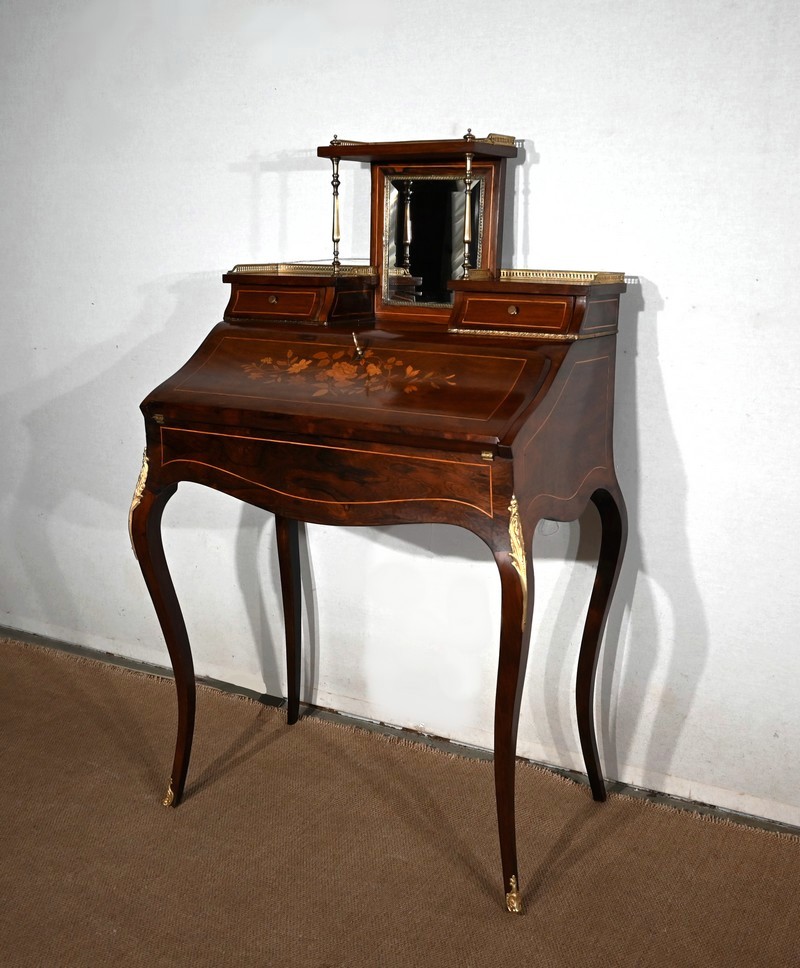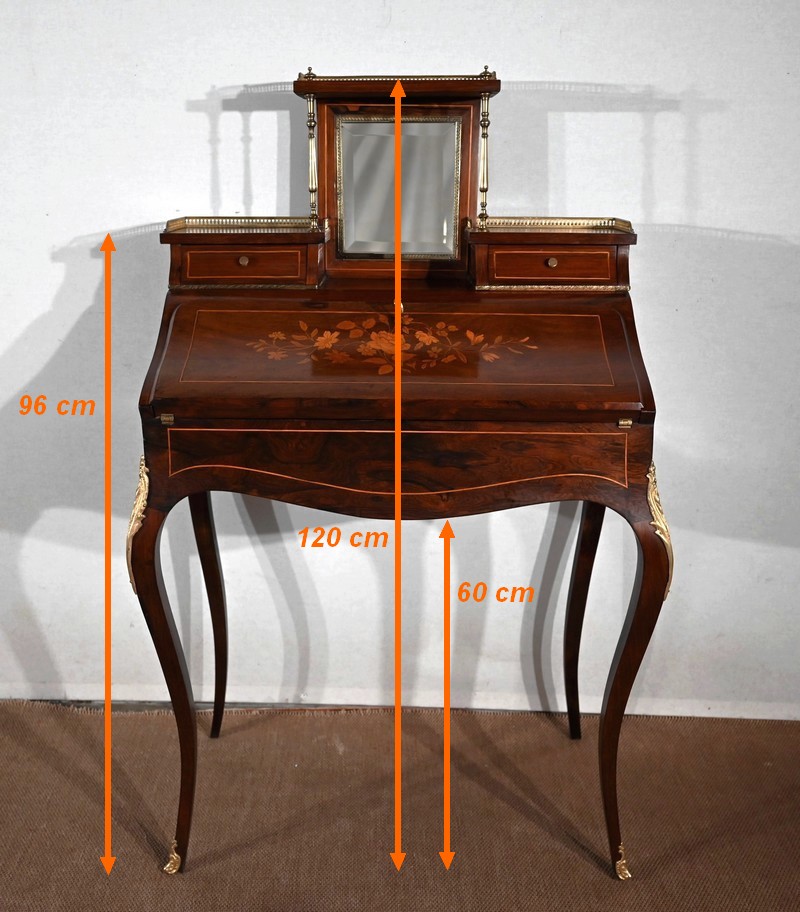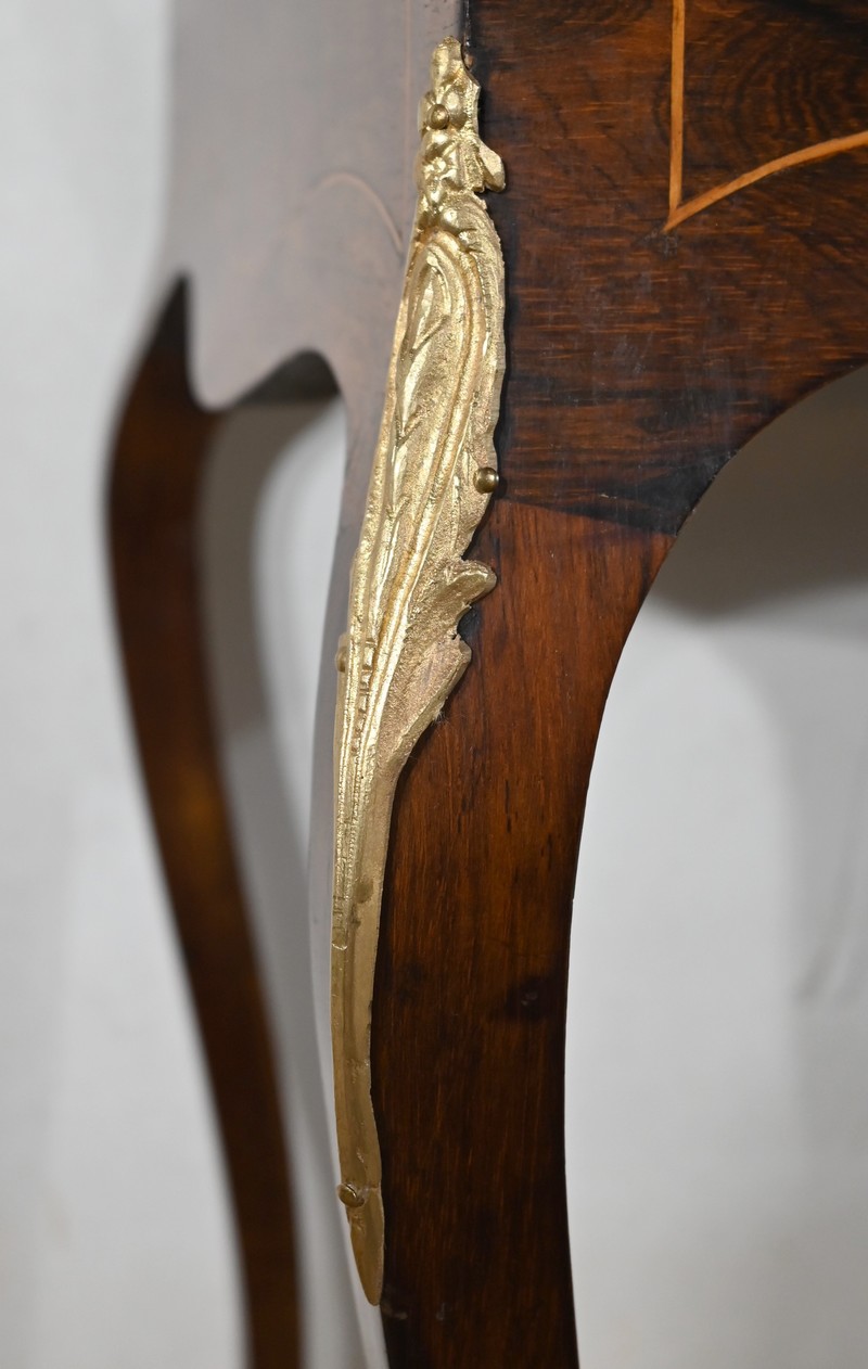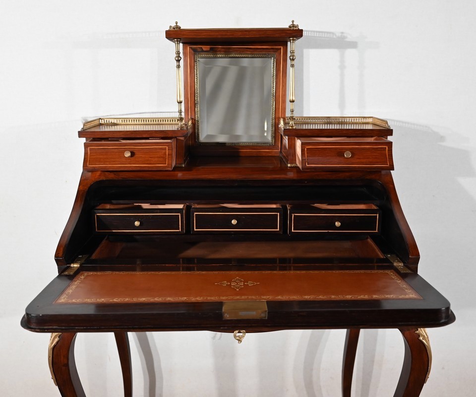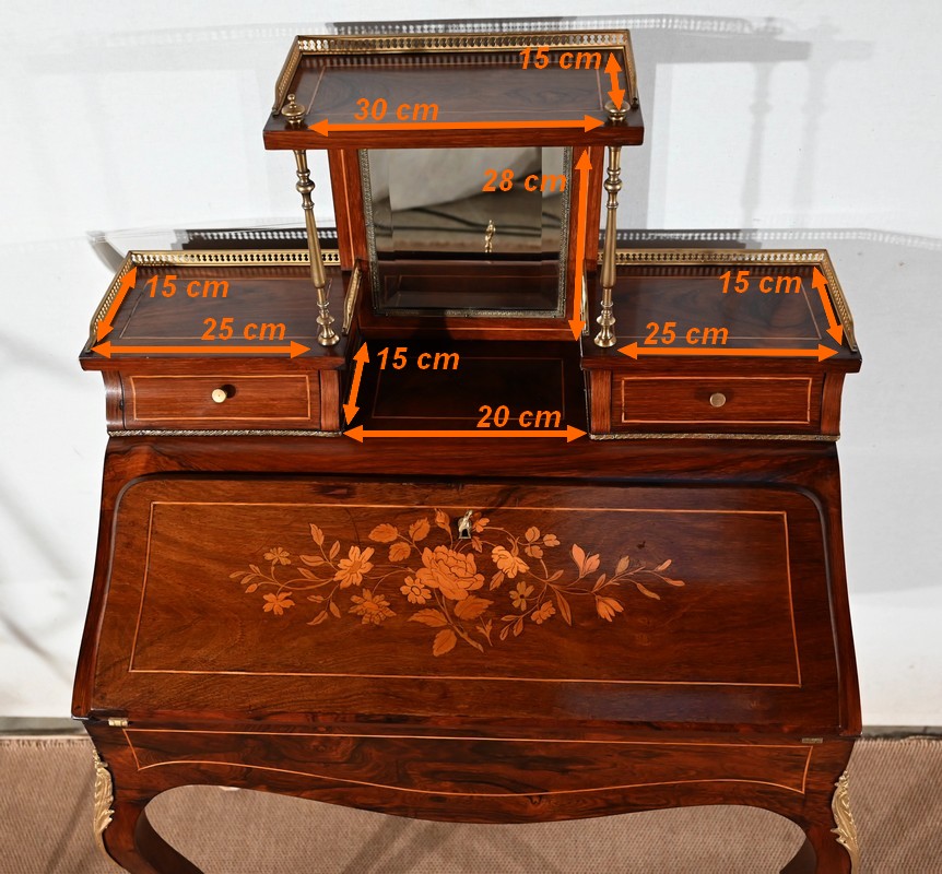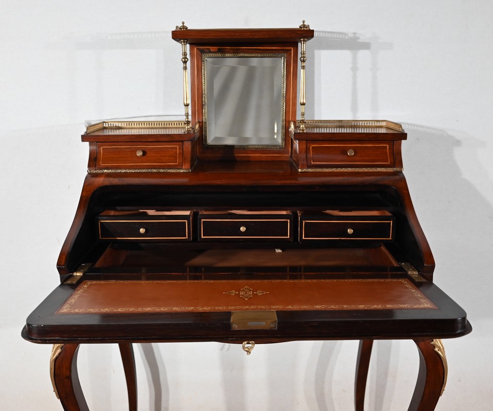 Ce bureau présente un abattant concave, en placage de palissandre, garni d’une composition de fleurs, en bois clair, entourée d’un filet de buis. Il est équipé d’une serrure d’origine fonctionnelle avec entrée laiton et clé postérieure. La partie écritoire est foncée d’un cuir cacao actuel à motif central et vignette dorée. Cet abattant, monté sur pommelles à queues d’aronde, est légèrement relevé. L’intérieur propose trois tiroirs identiques en palissandre et filets de buis ainsi qu’une réserve accessible par une plaque coulissante à onglet laiton.