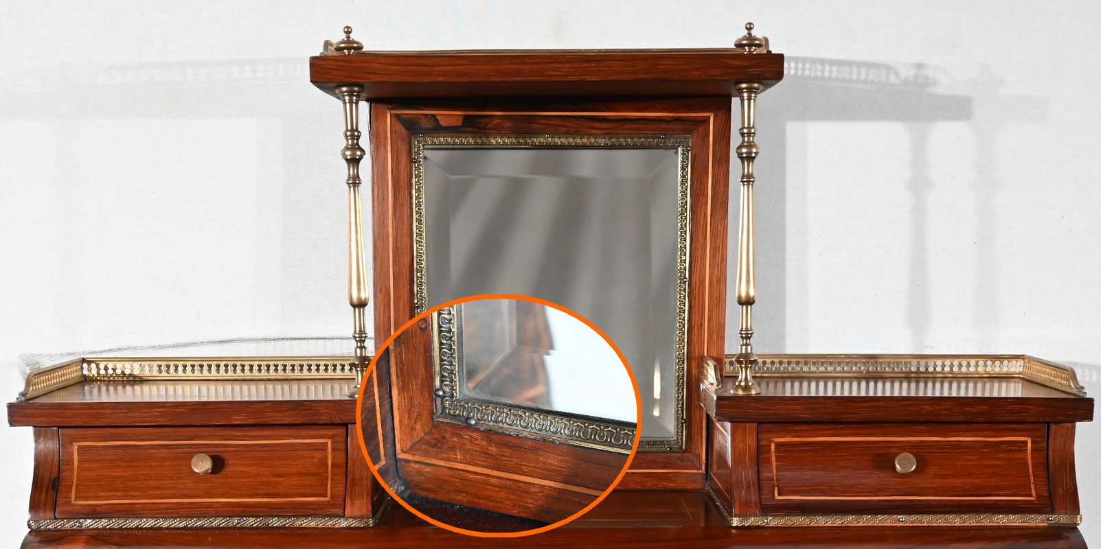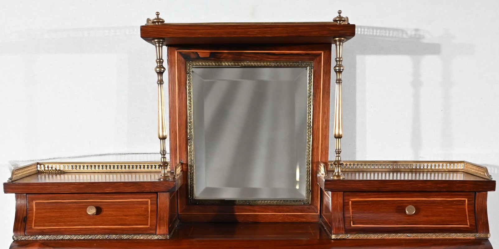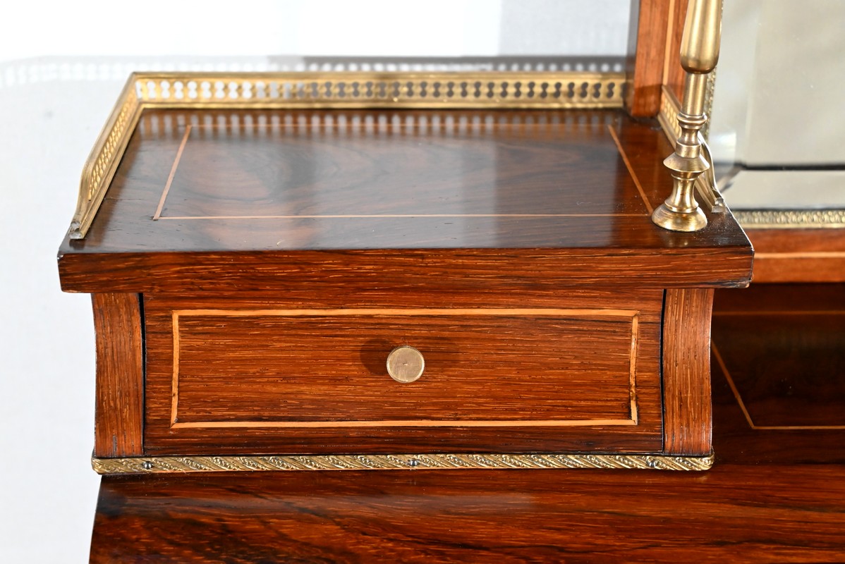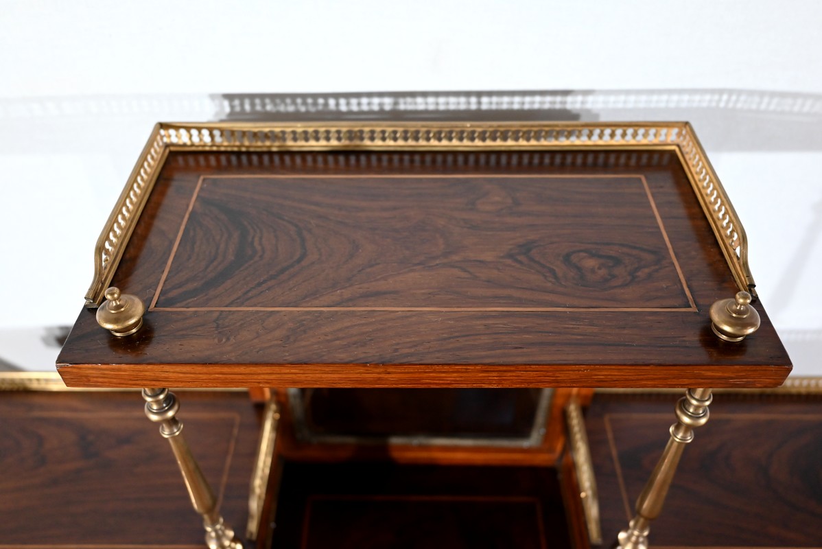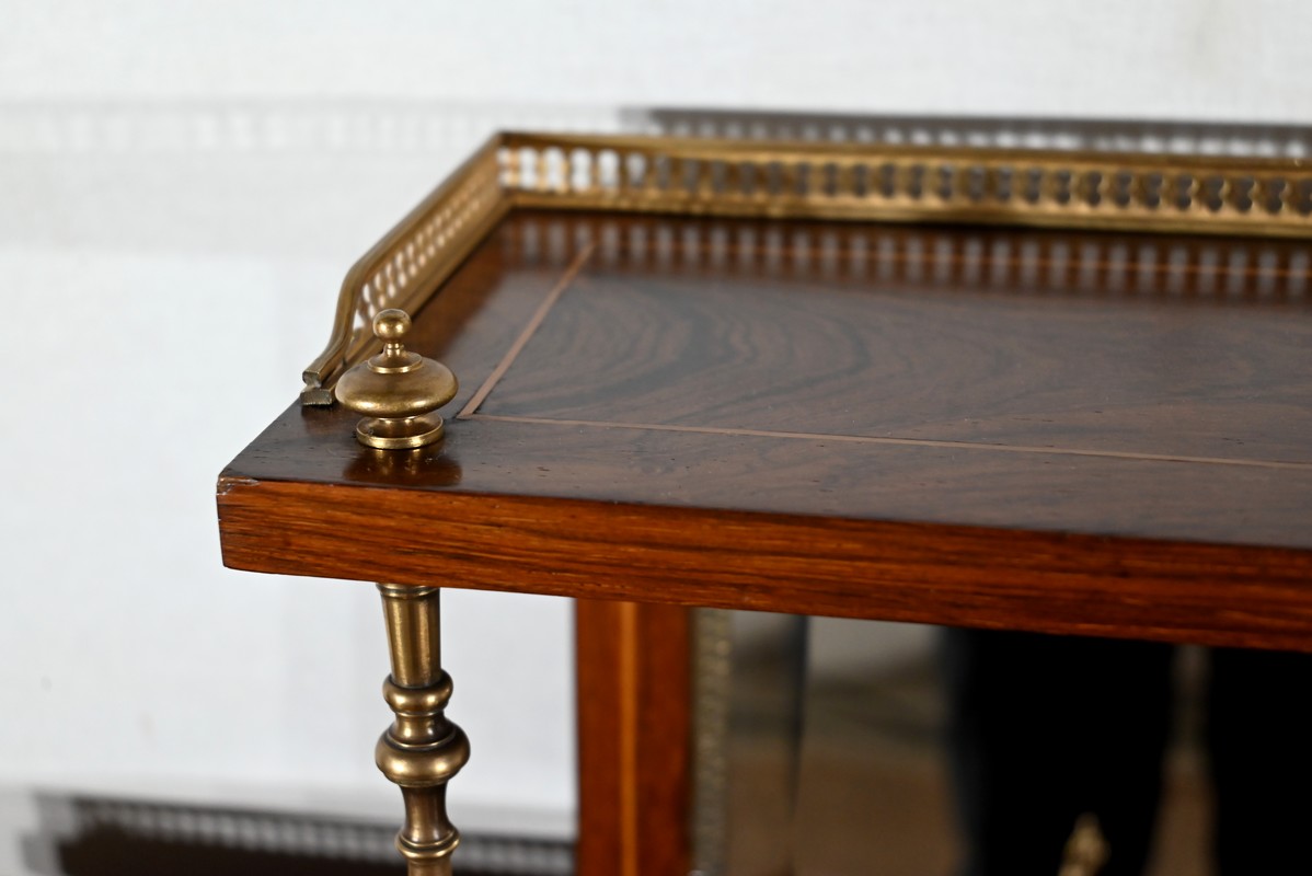 La partie supérieure du meuble offre deux tiroirs, surmontés de tablettes à galeries bronze ajouré, et séparés par une niche flanquée d’un miroir biseauté. Deux pilotis, en laiton tourné, viennent supporter une terrasse à galerie bronze.